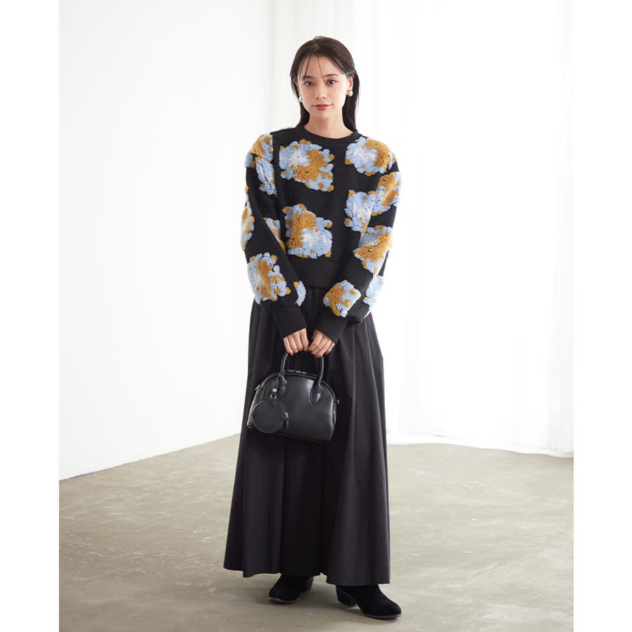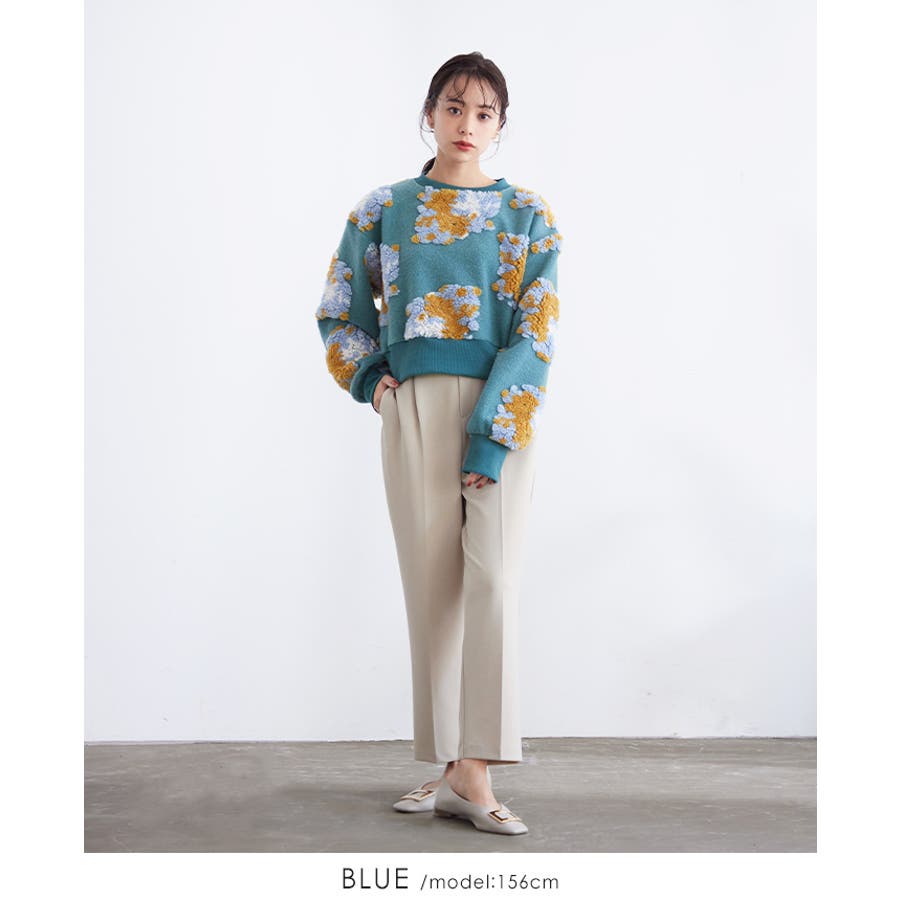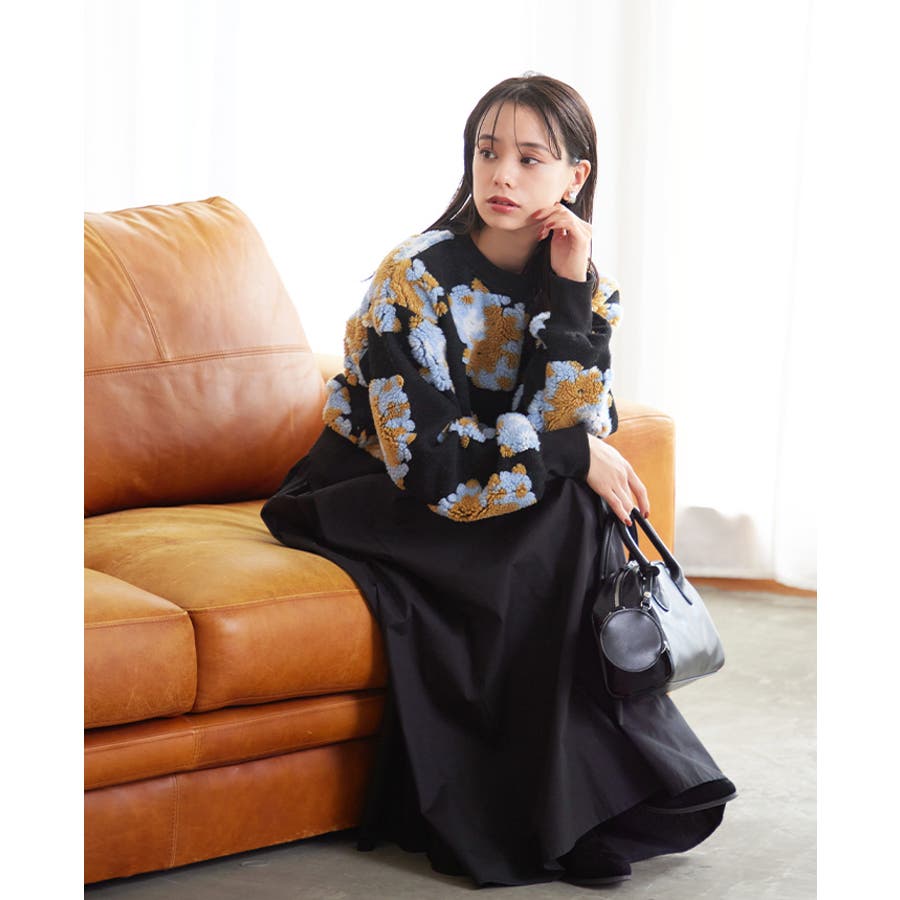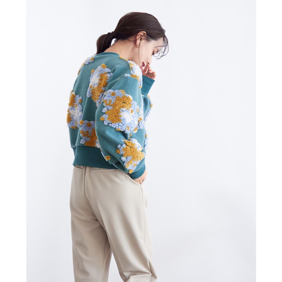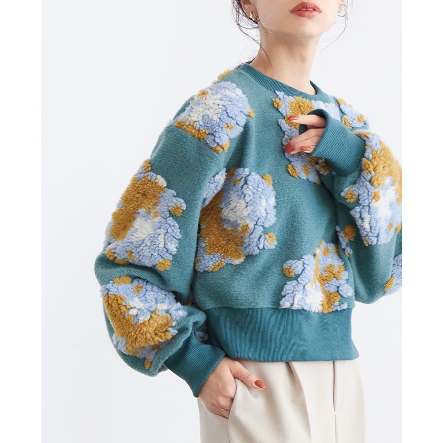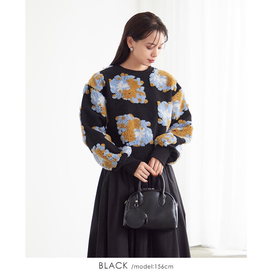 『ぷっくり大きな花が咲きました。』花の部分をふわふわのボアで表現した、見た目に楽しいトップス。通常の編み柄と違い、立体的なデザインがお洒落心をくすぐります。ゆったりとしたシルエットで、ストレスフリーな着心地。旬のショート丈は、スタイルアップにおすすめ。ワンランク上のコーデに導いてくれるアイテムです。