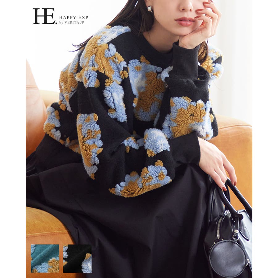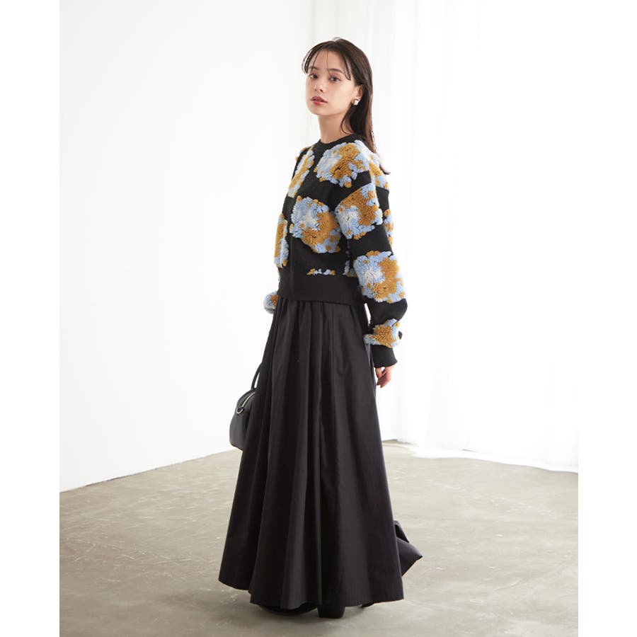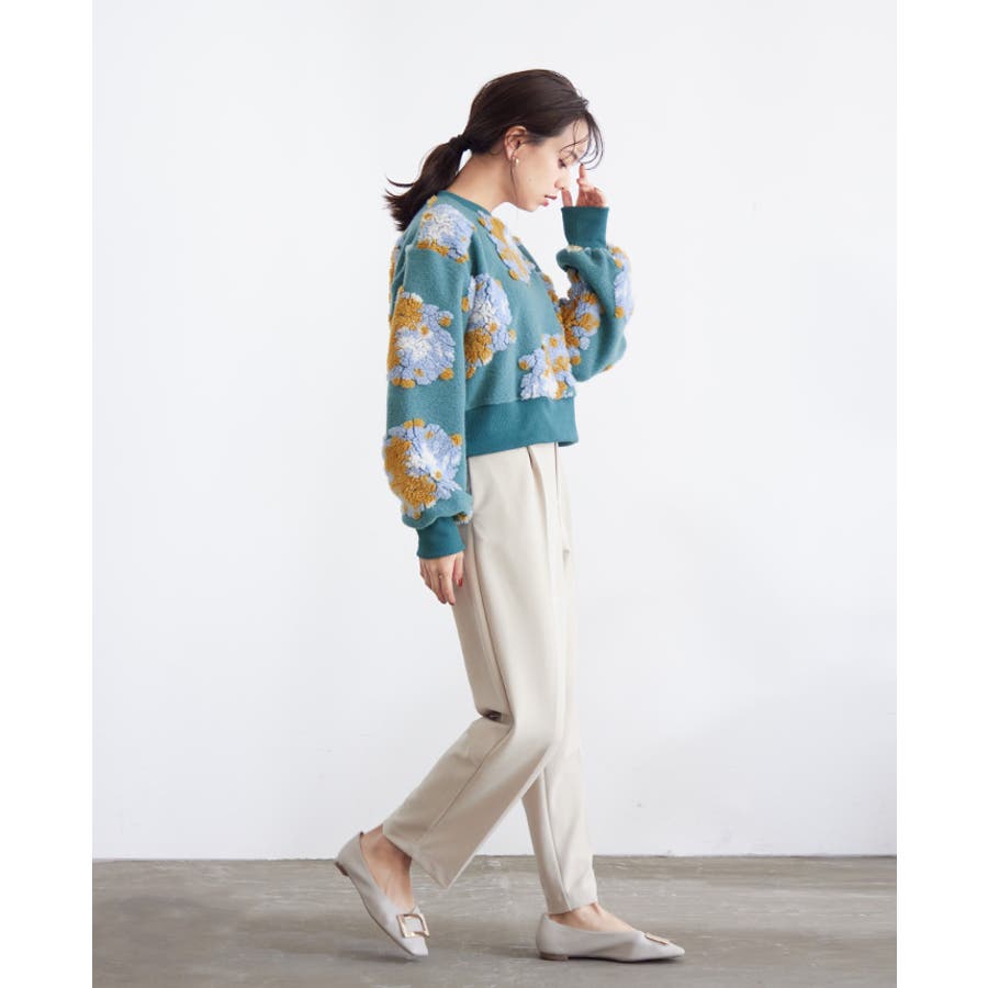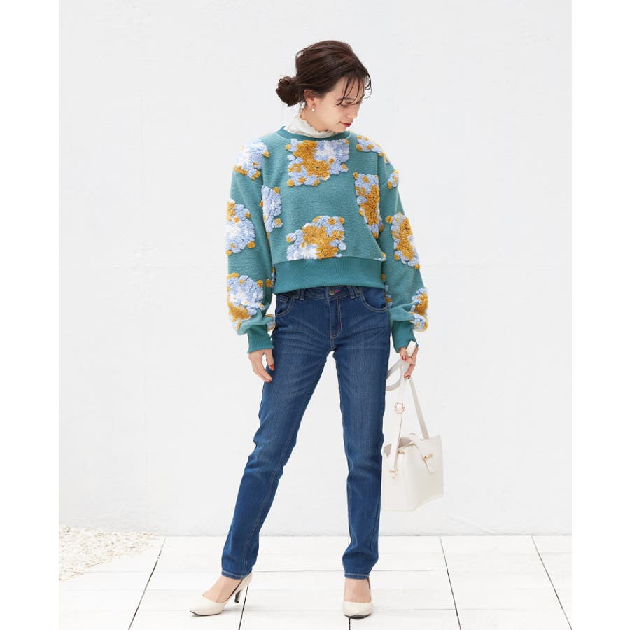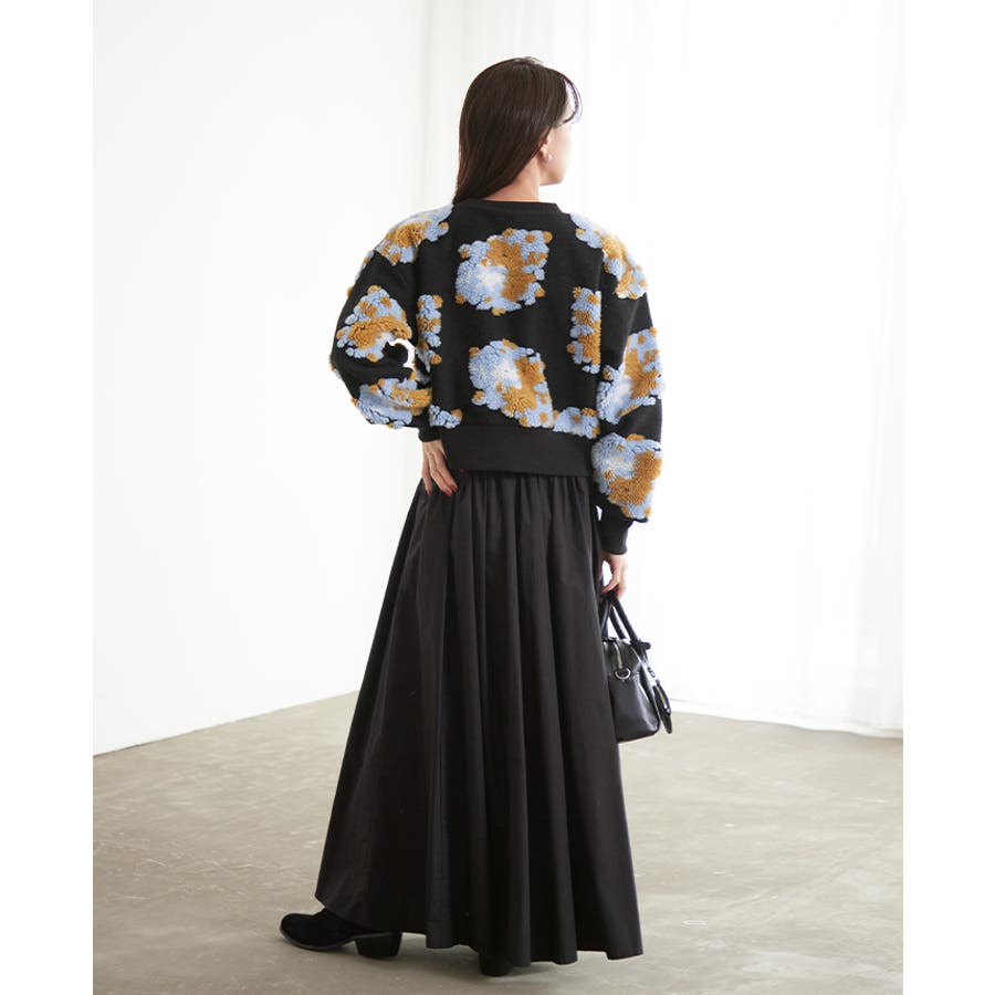 『ぷっくり大きな花が咲きました。』花の部分をふわふわのボアで表現した、見た目に楽しいトップス。通常の編み柄と違い、立体的なデザインがお洒落心をくすぐります。ゆったりとしたシルエットで、ストレスフリーな着心地。旬のショート丈は、スタイルアップにおすすめ。ワンランク上のコーデに導いてくれるアイテムです。