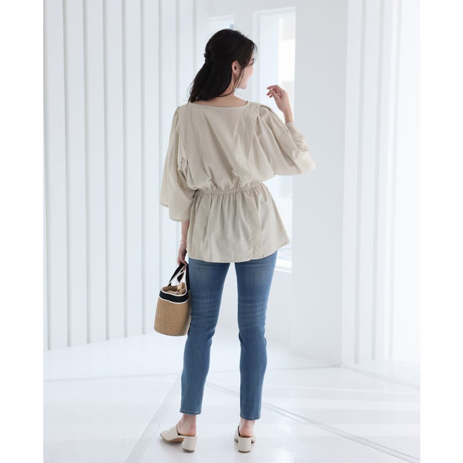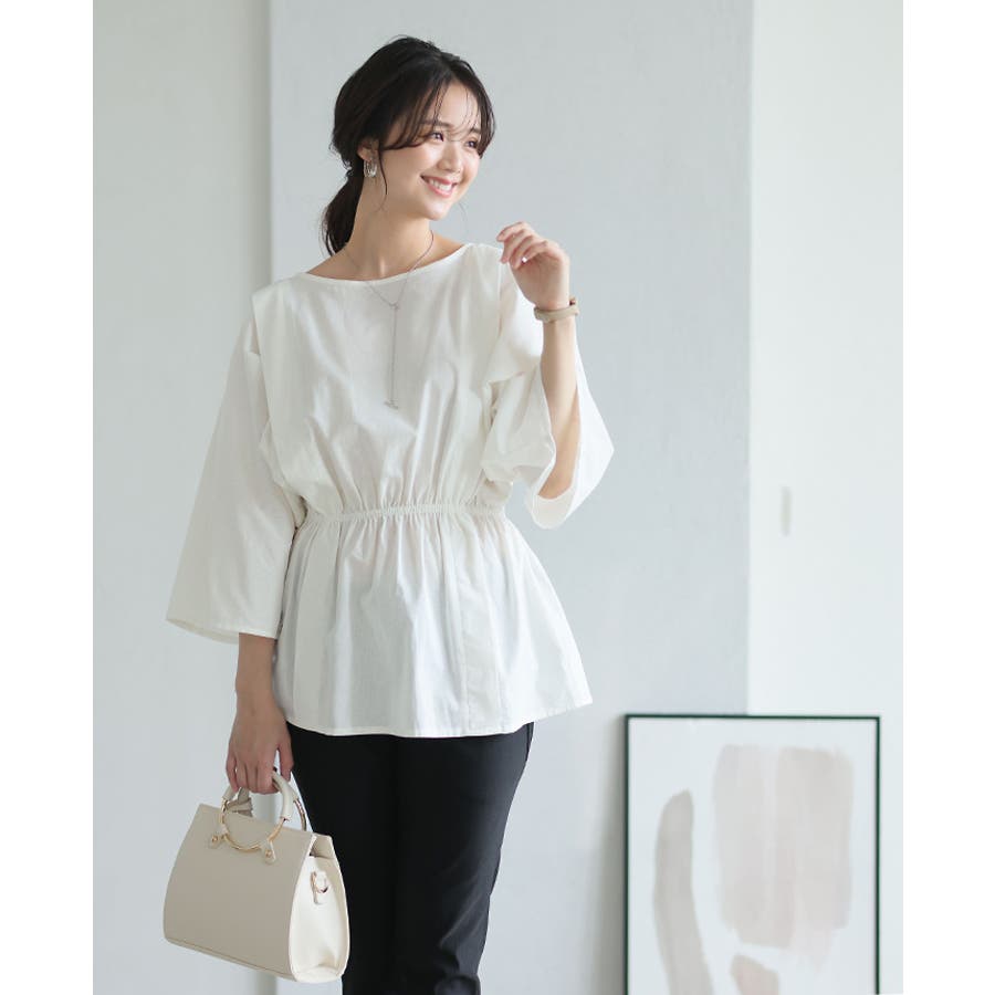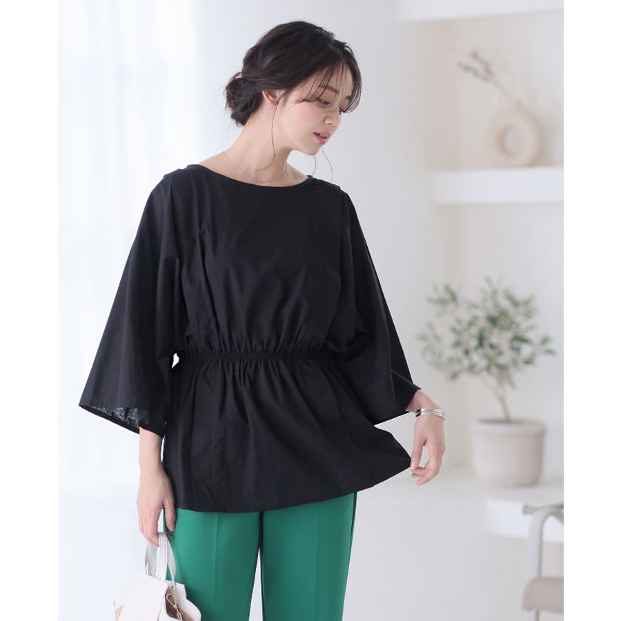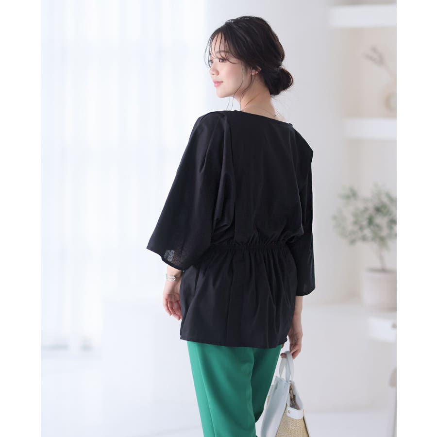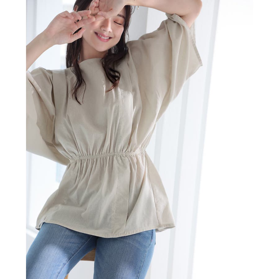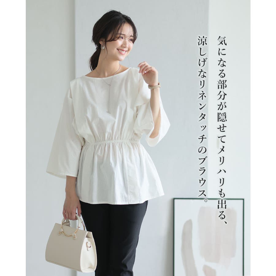 『女性らしい、キレイめブラウス。』暑い時期に活躍してくれる、リネンタッチの生地を使用。ウエストのゴムでメリハリを出し、フレアで腰回りをカバー。ワイドなドルマンスリーブは、二の腕が隠せるく7分丈。綿100%なので通気性が良く、さらっとした優しい肌触り。スタイルアップできる、おすすめのアイテムです。