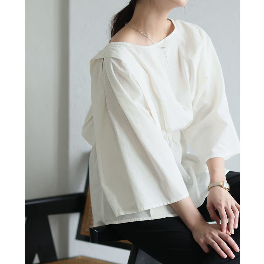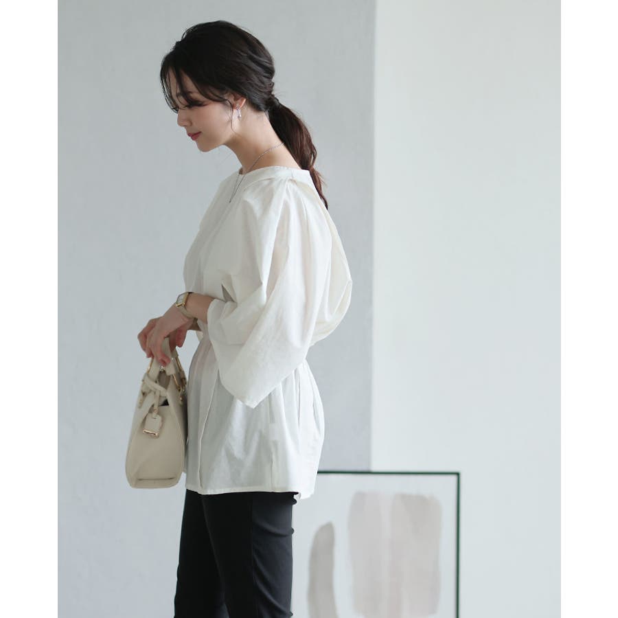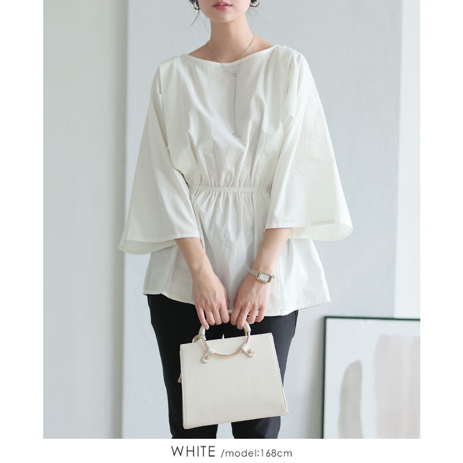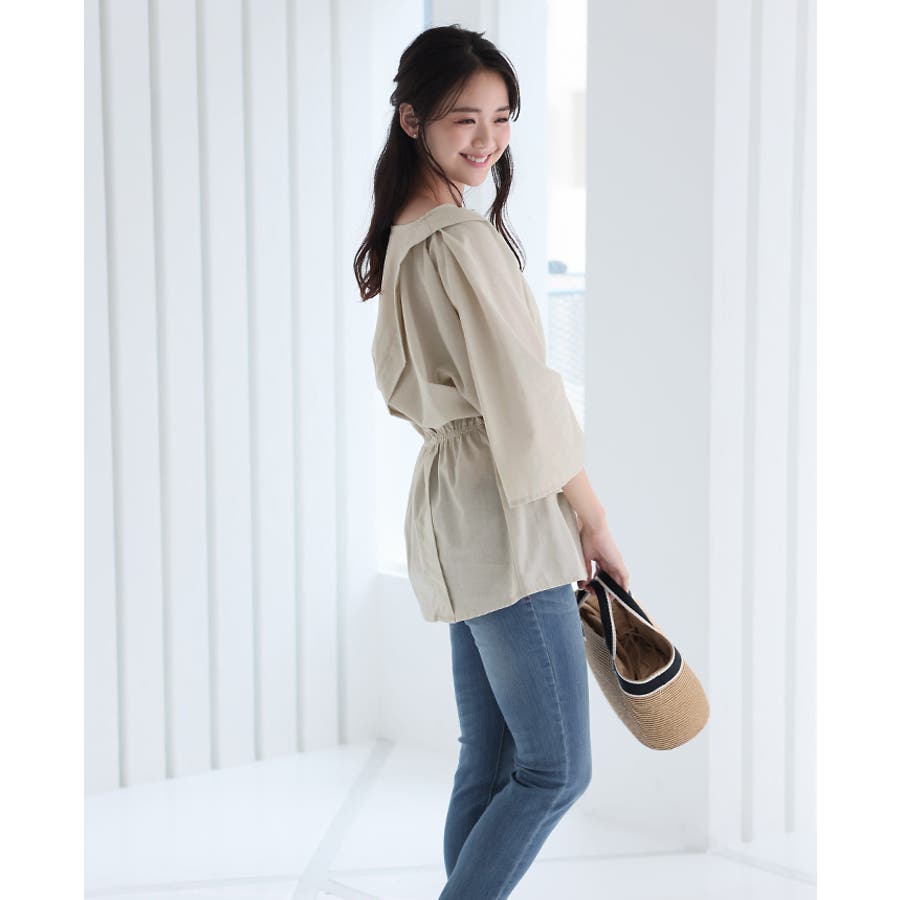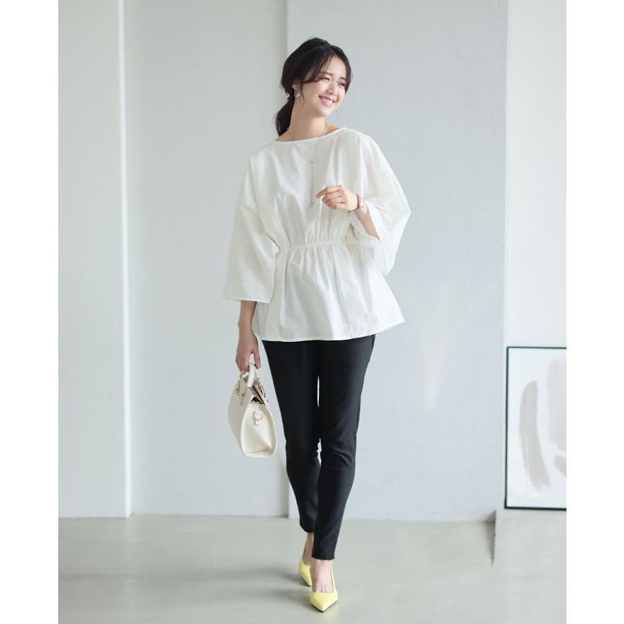 『女性らしい、キレイめブラウス。』暑い時期に活躍してくれる、リネンタッチの生地を使用。ウエストのゴムでメリハリを出し、フレアで腰回りをカバー。ワイドなドルマンスリーブは、二の腕が隠せるく7分丈。綿100%なので通気性が良く、さらっとした優しい肌触り。スタイルアップできる、おすすめのアイテムです。
