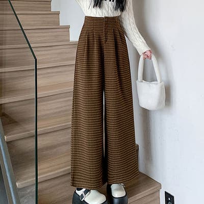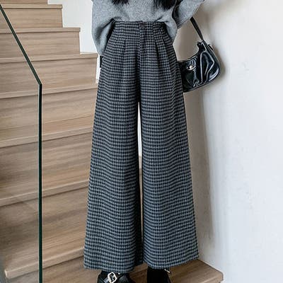 チェック柄ウール調ワイドパンツ Aラインロングパンツ