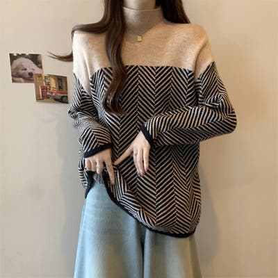 配色 ニットトップス ハイネック ヘリンボーン