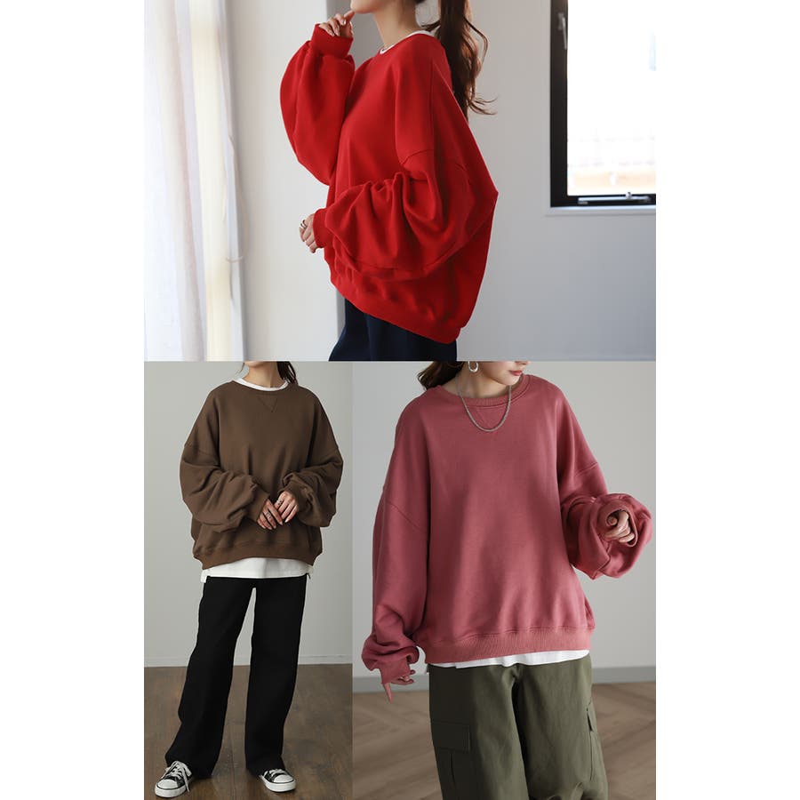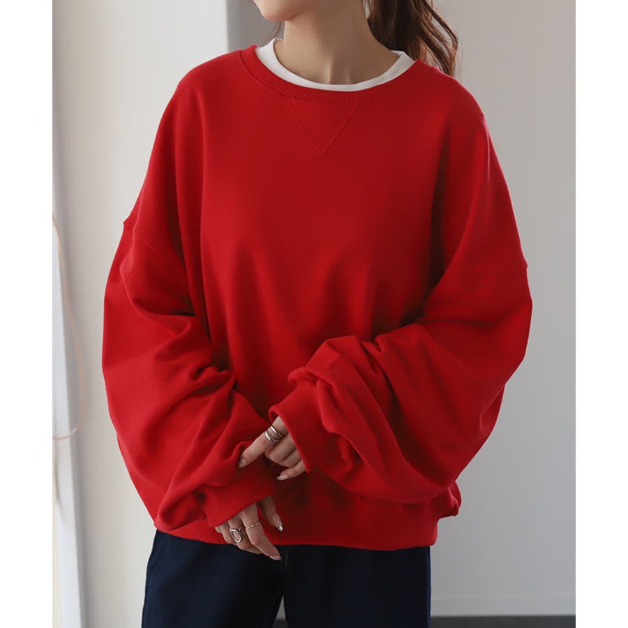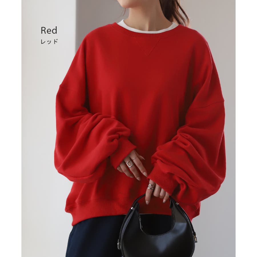 【レッド】スウェット レディース トップス トレーナー バルーン袖 無地 長袖 オーバー