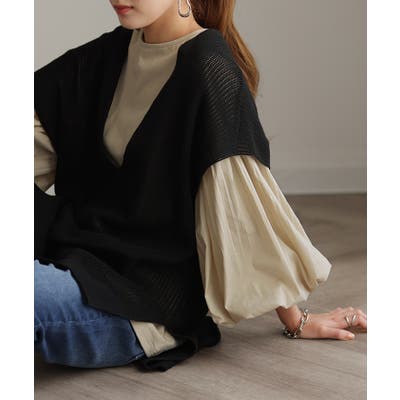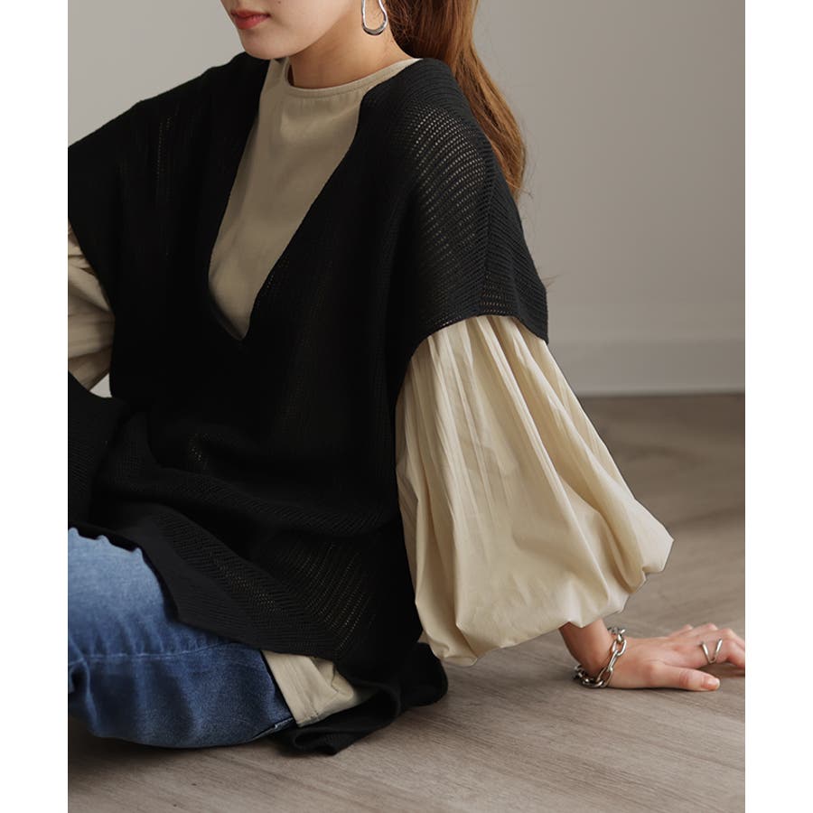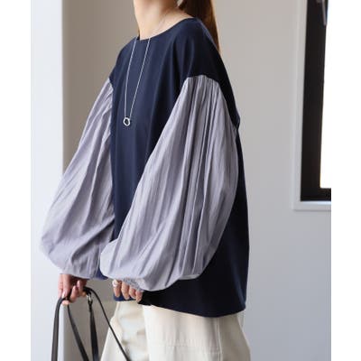 ブラウス レディース トップス ぽわん袖 カットソー きれいめ ロンT 異素材