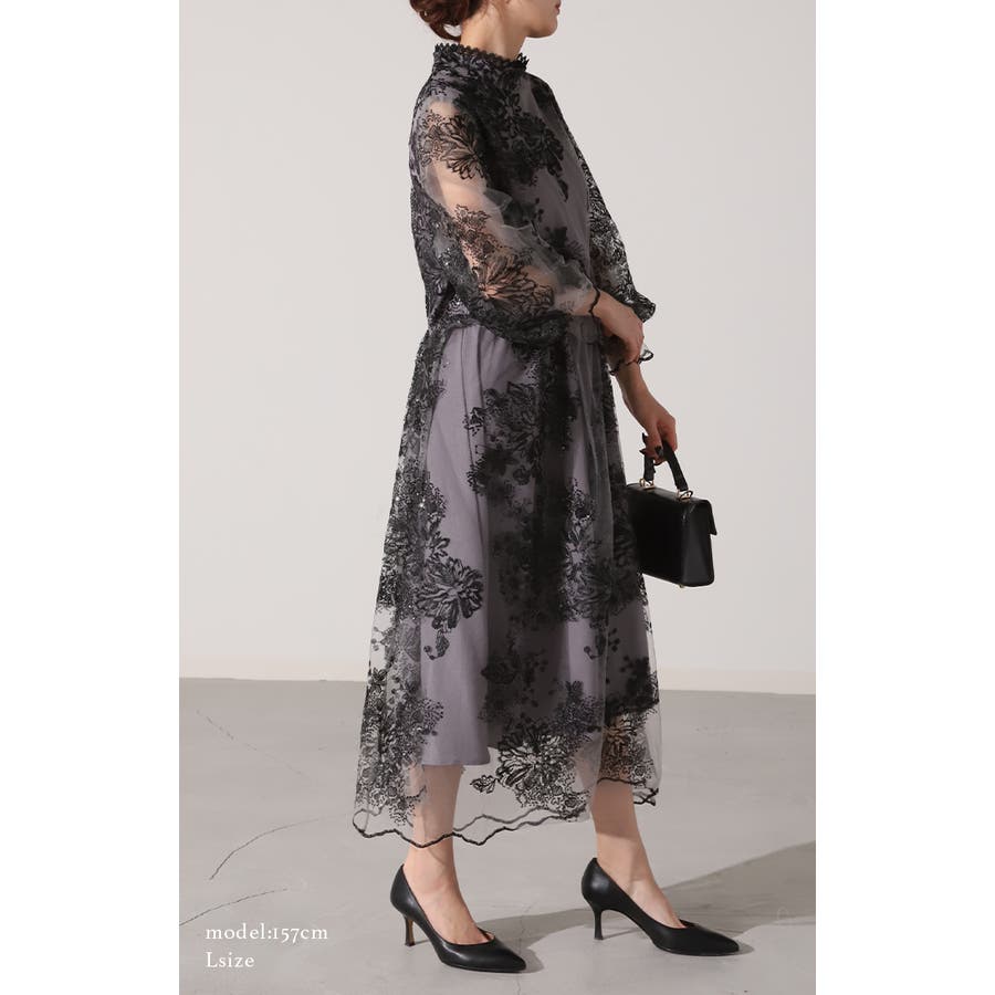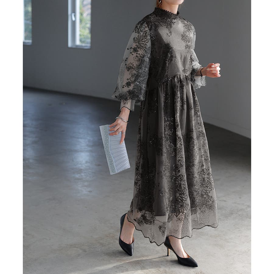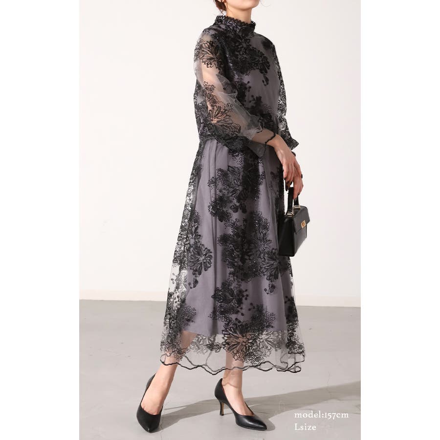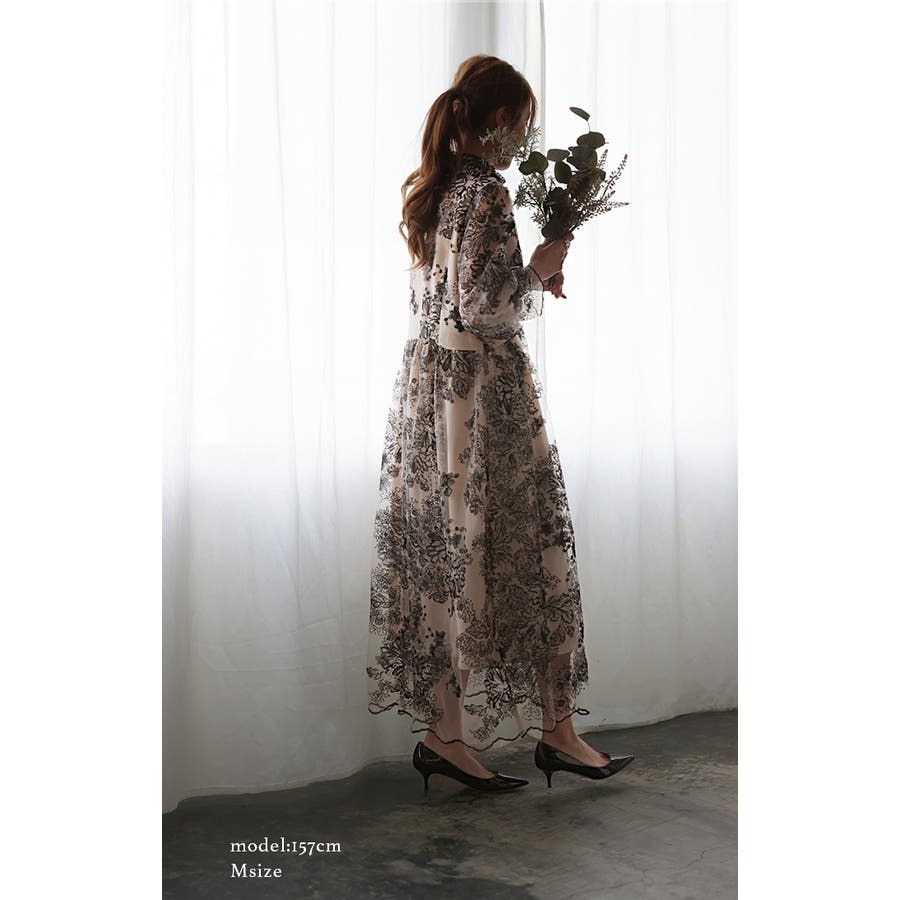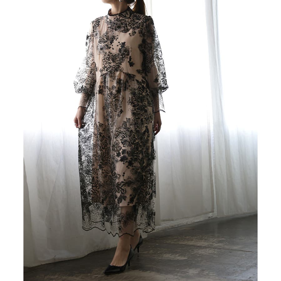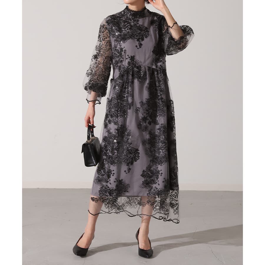 透け感のある素材で上品な印象を与える花柄刺繍のワンピースです。