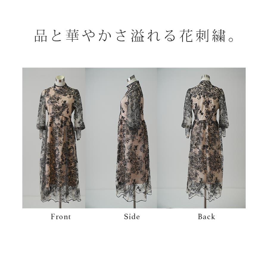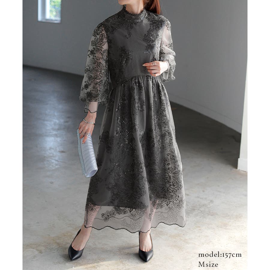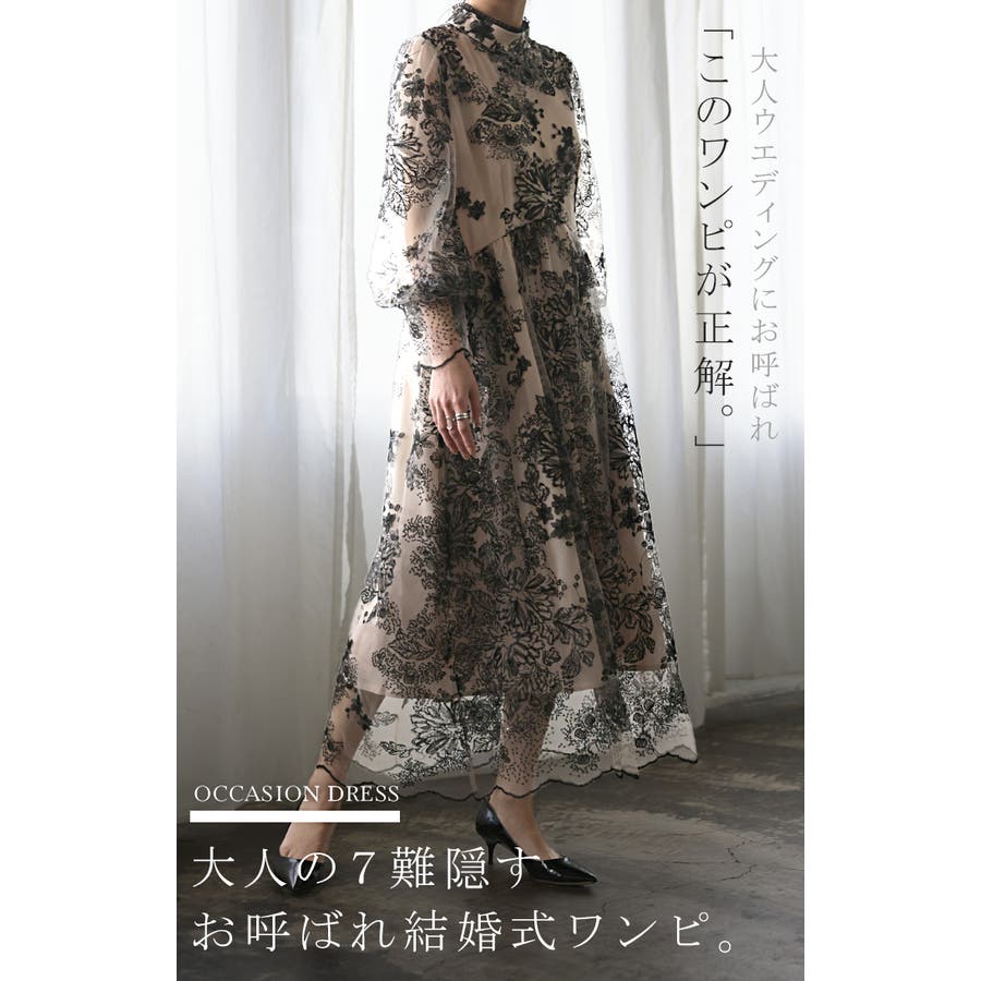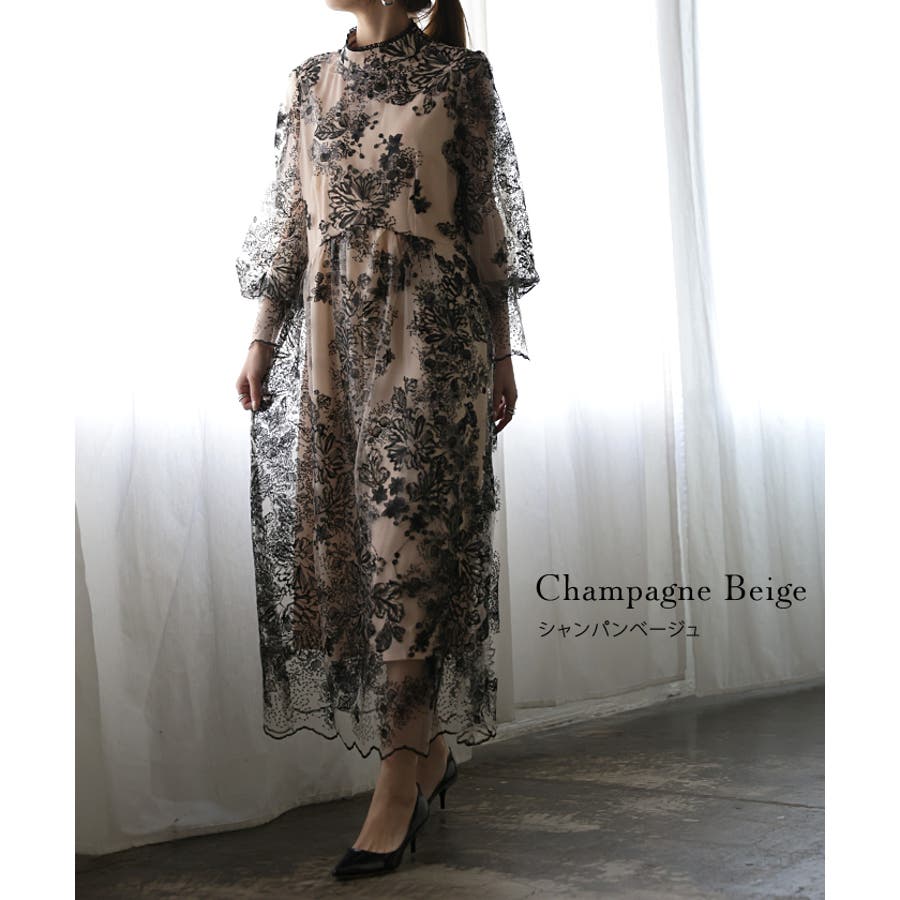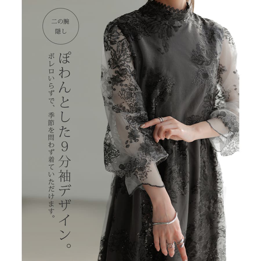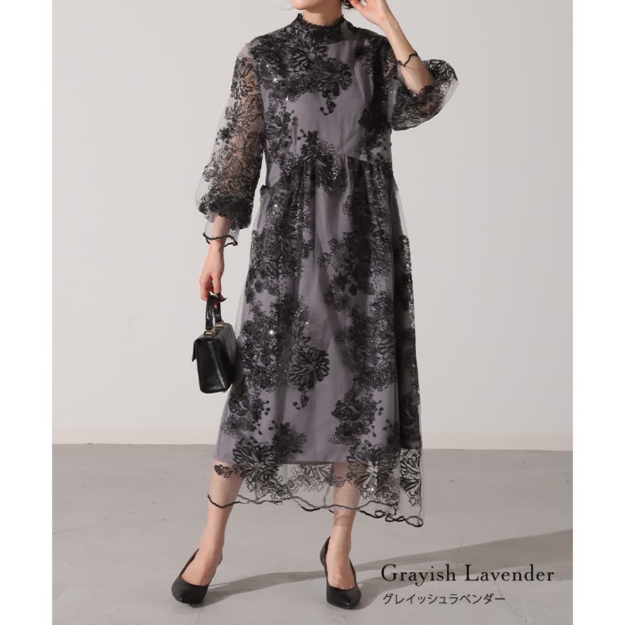 透け感のある素材で上品な印象を与える花柄刺繍のワンピースです。