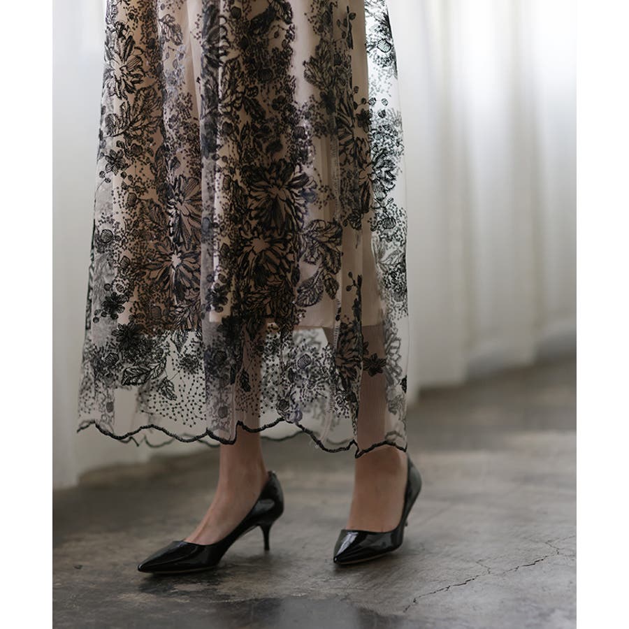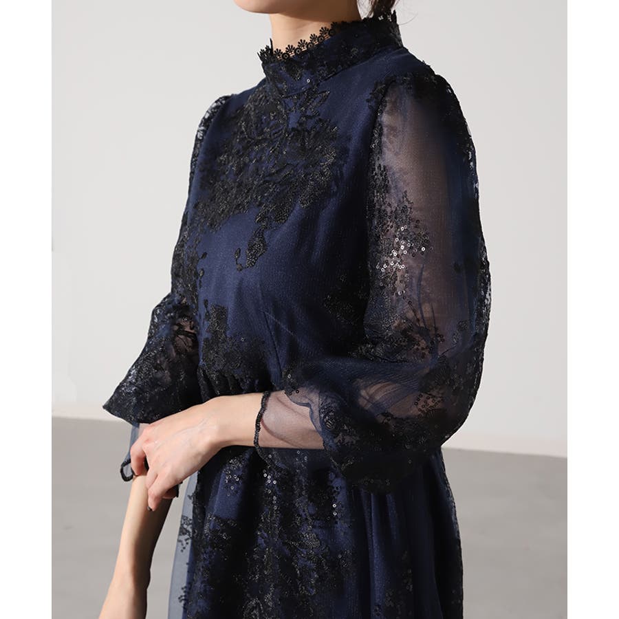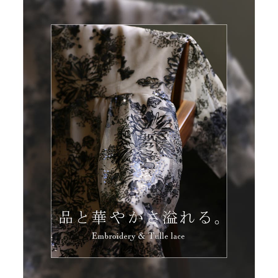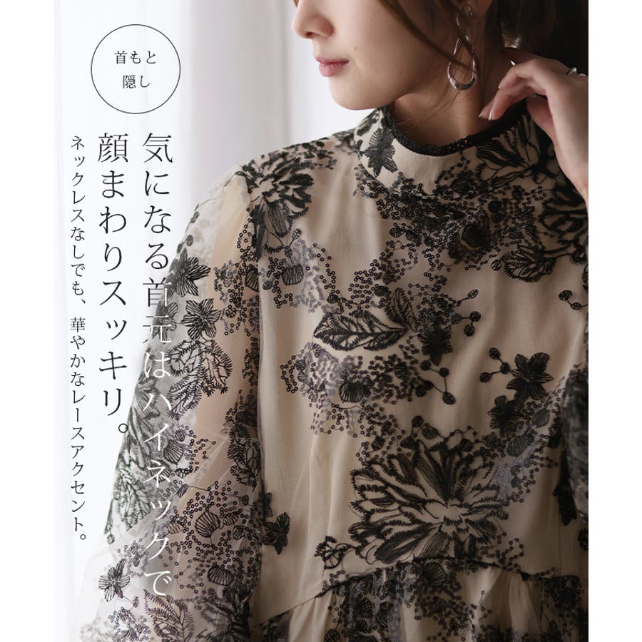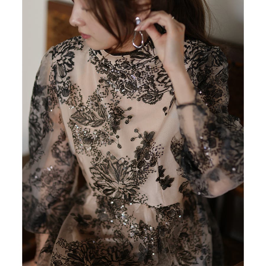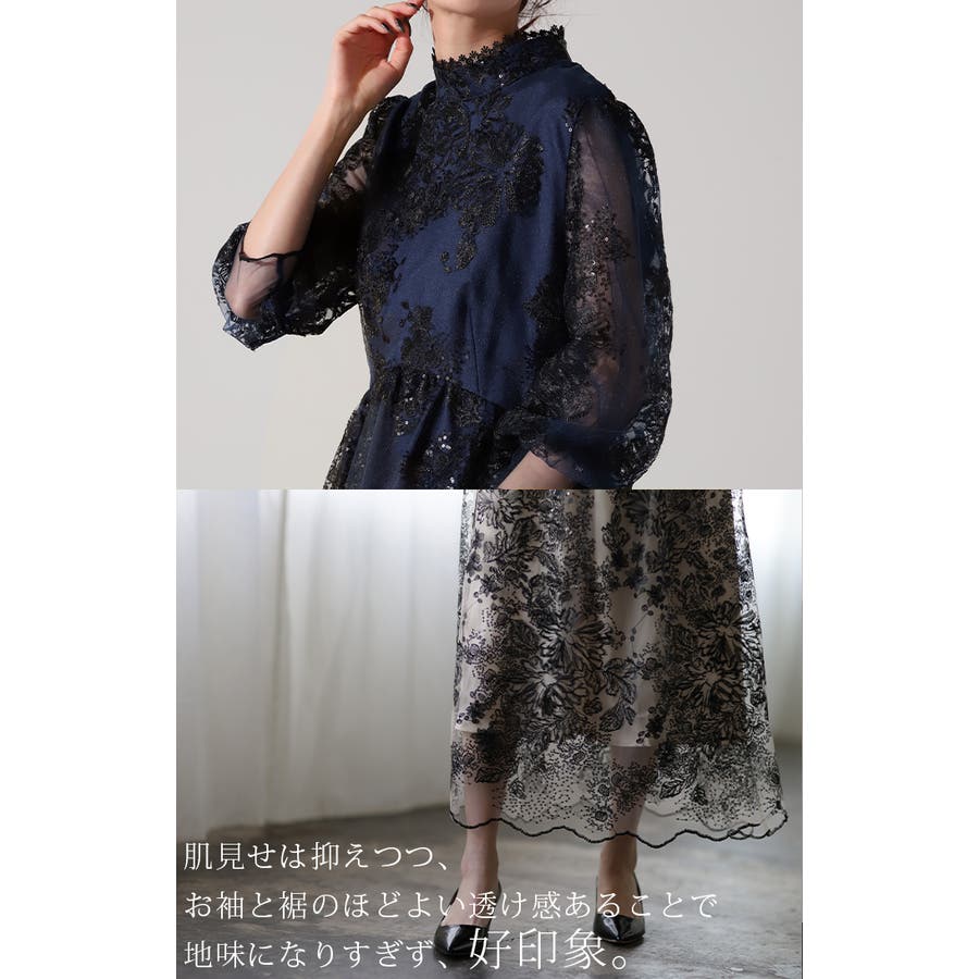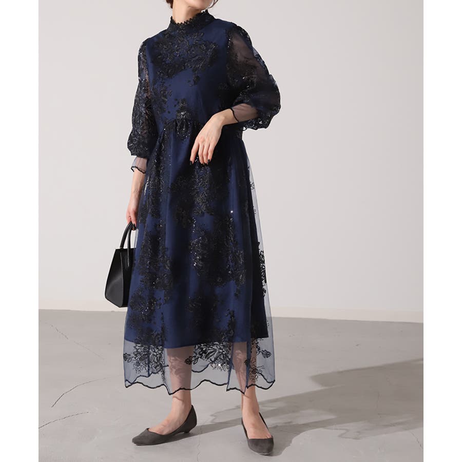 透け感のある素材で上品な印象を与える花柄刺繍のワンピースです。