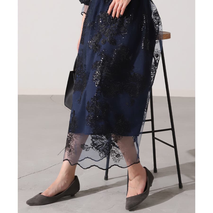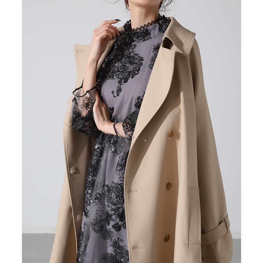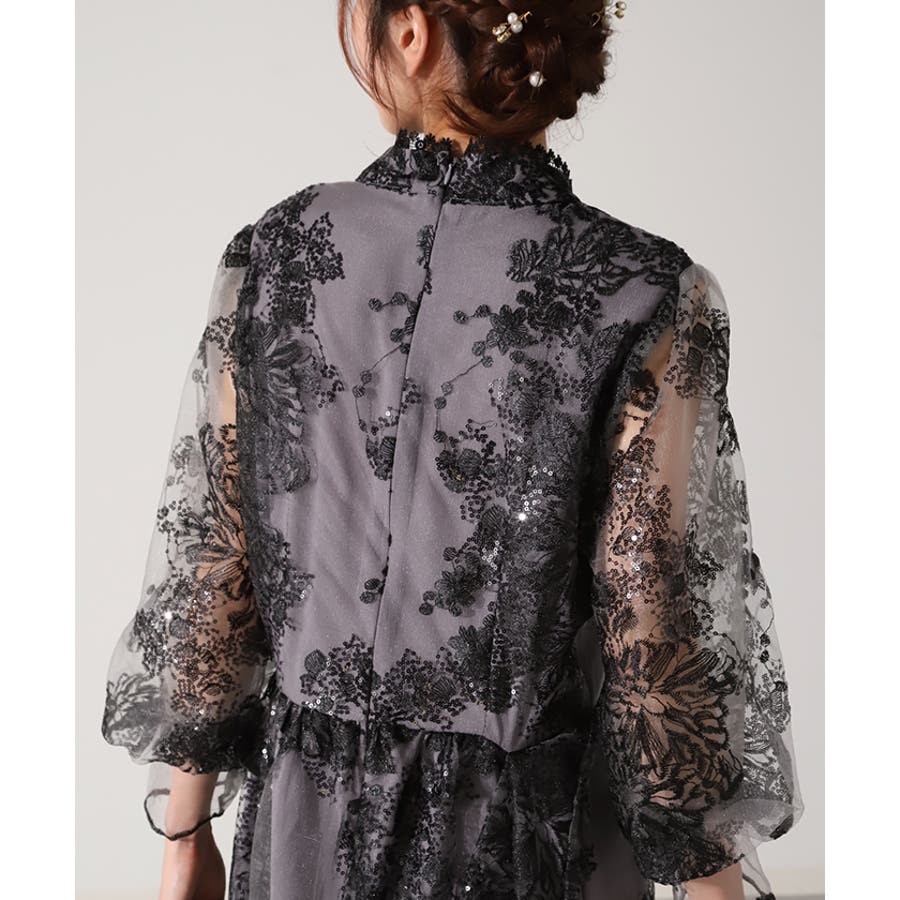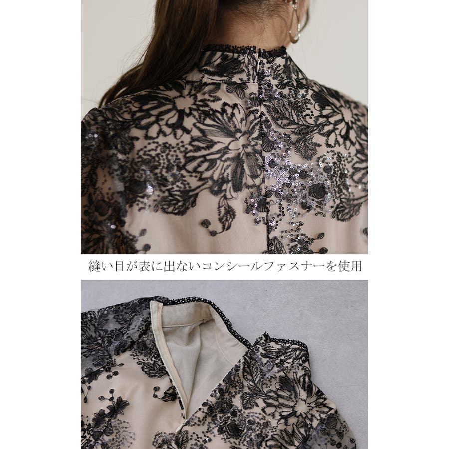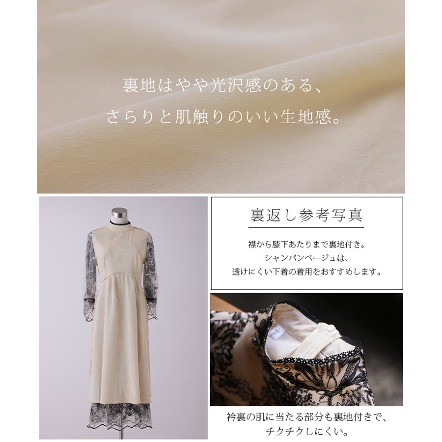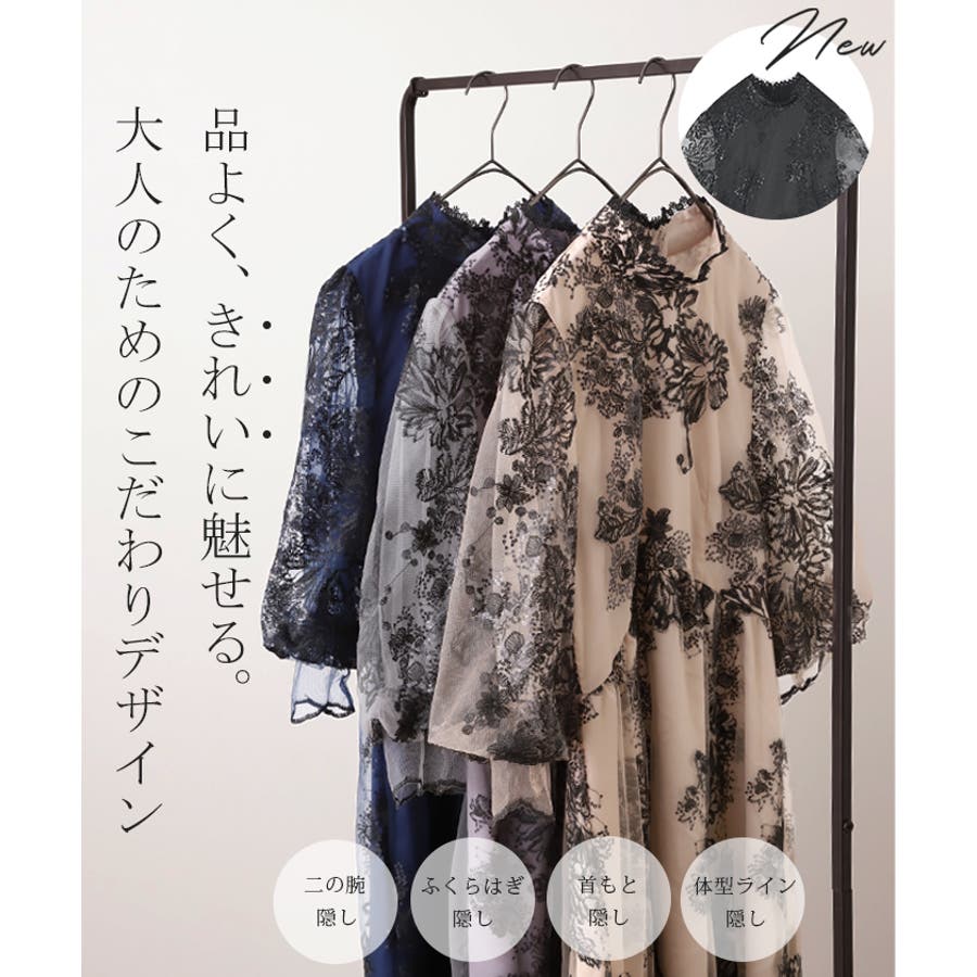 透け感のある素材で上品な印象を与える花柄刺繍のワンピースです。