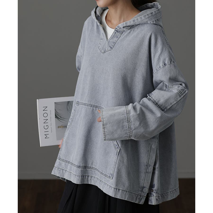 フード付きデニムプルオーバーパーカーです。