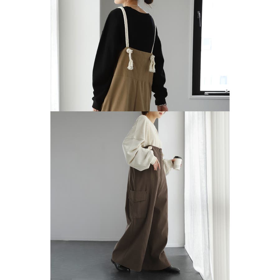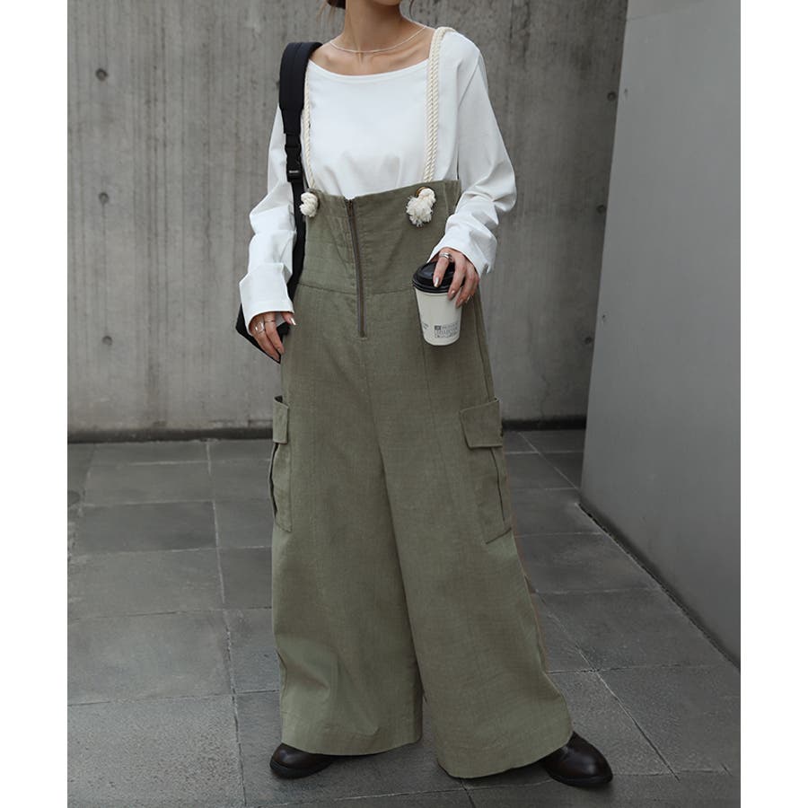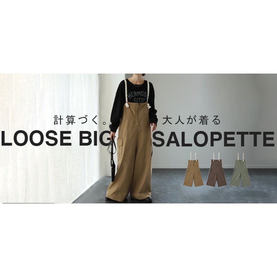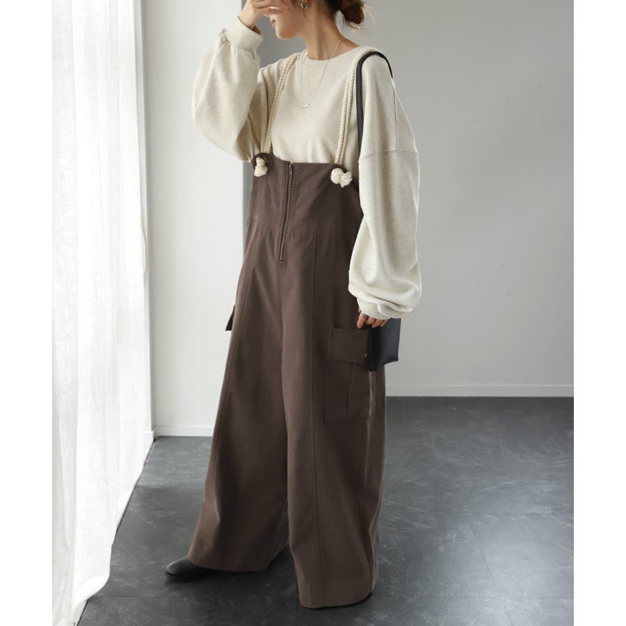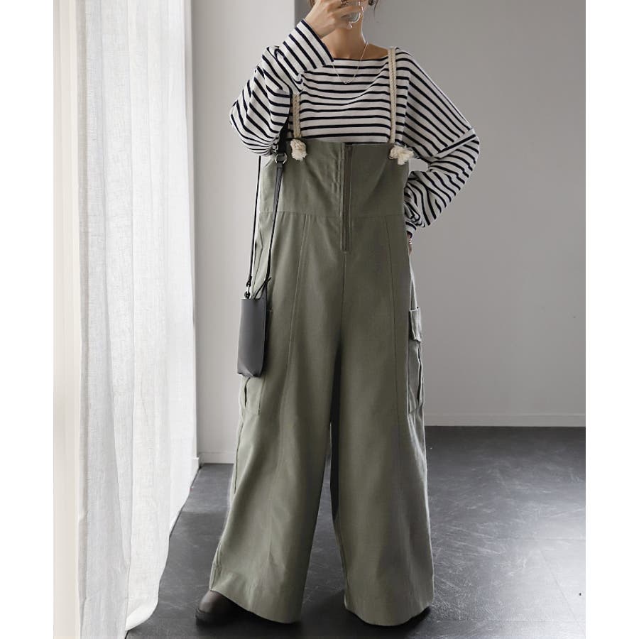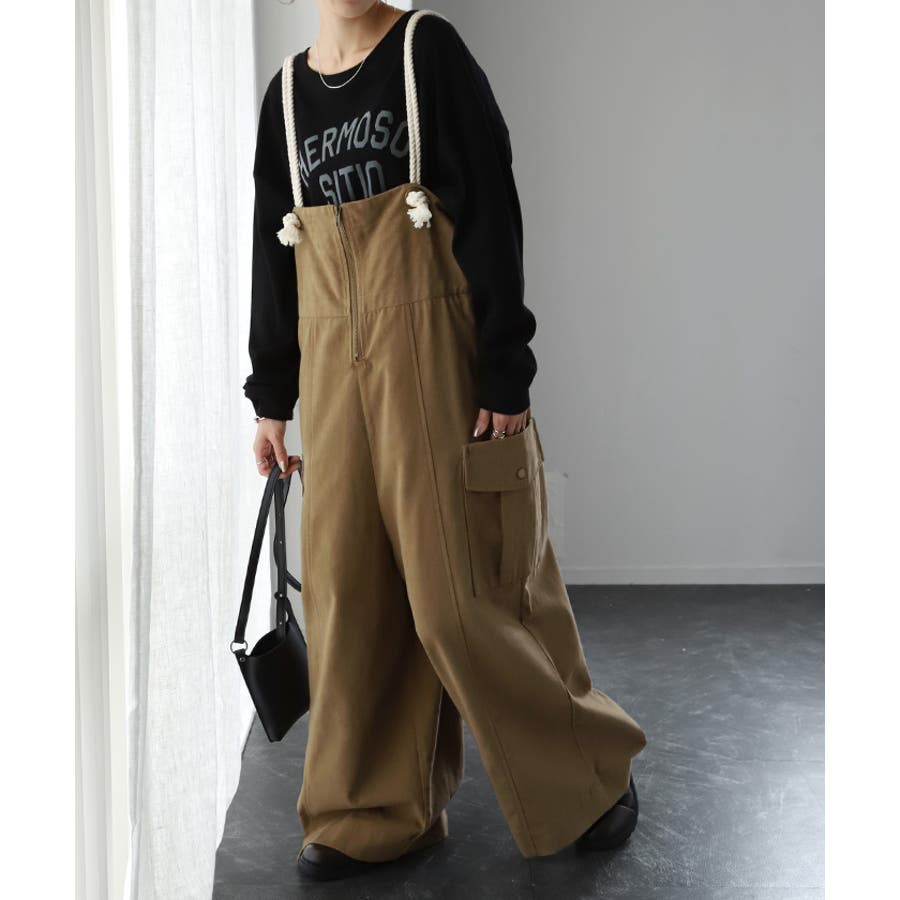 サイドのビッグカーゴポケットが大人可愛いワイドサロペットパンツです。