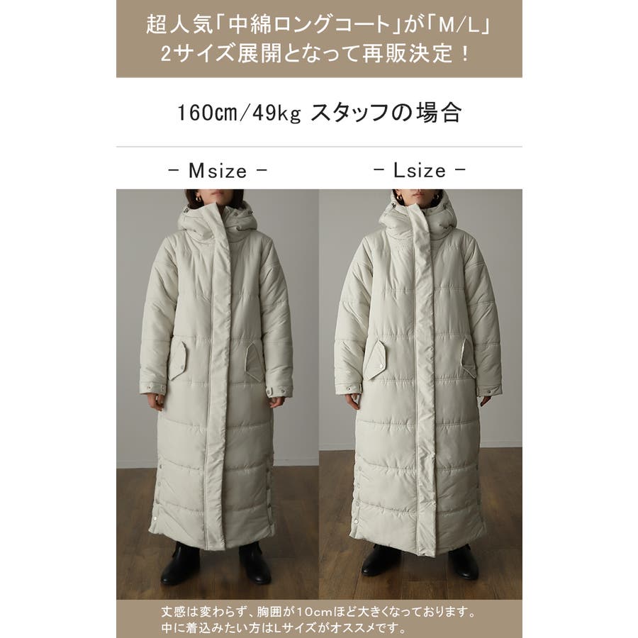 投稿日:2024.10.26レビュー見てMサイズ購入。Lだと本当に大きかっただろうなと思うくらい、全身包み込まれて布団を着てるようなコートです。