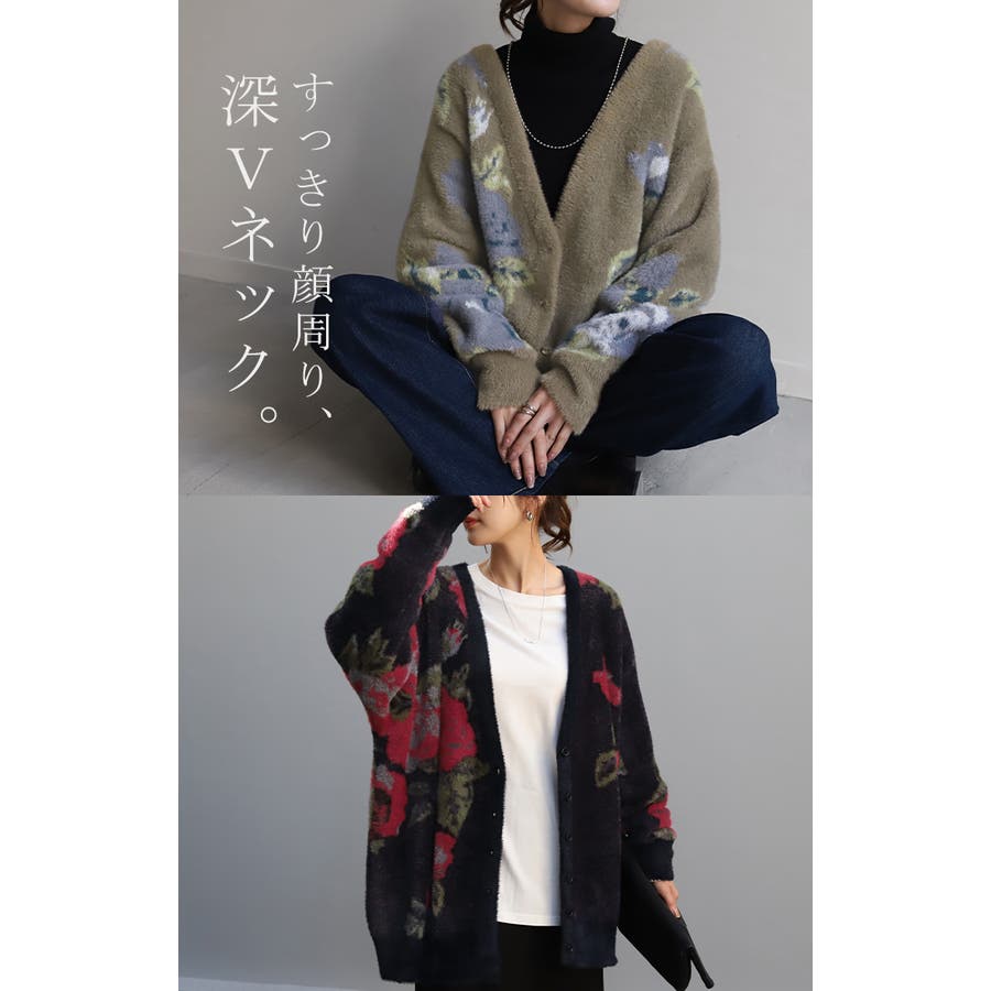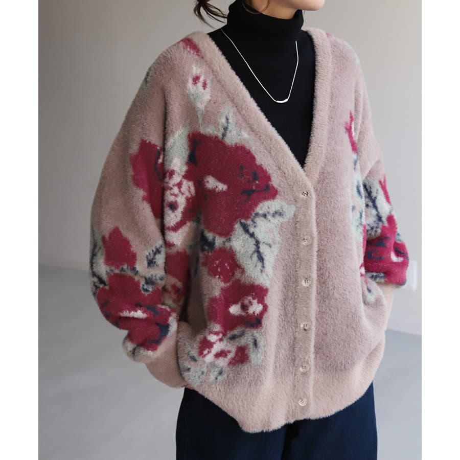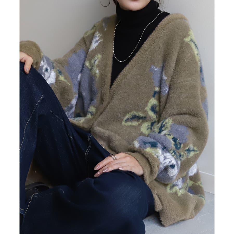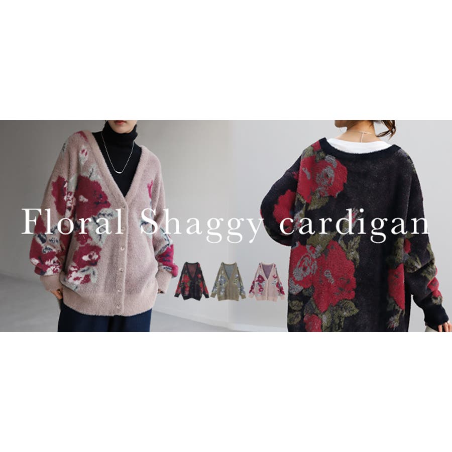 コーデを華やかに彩るシャギー花柄ニットカーディガンです。