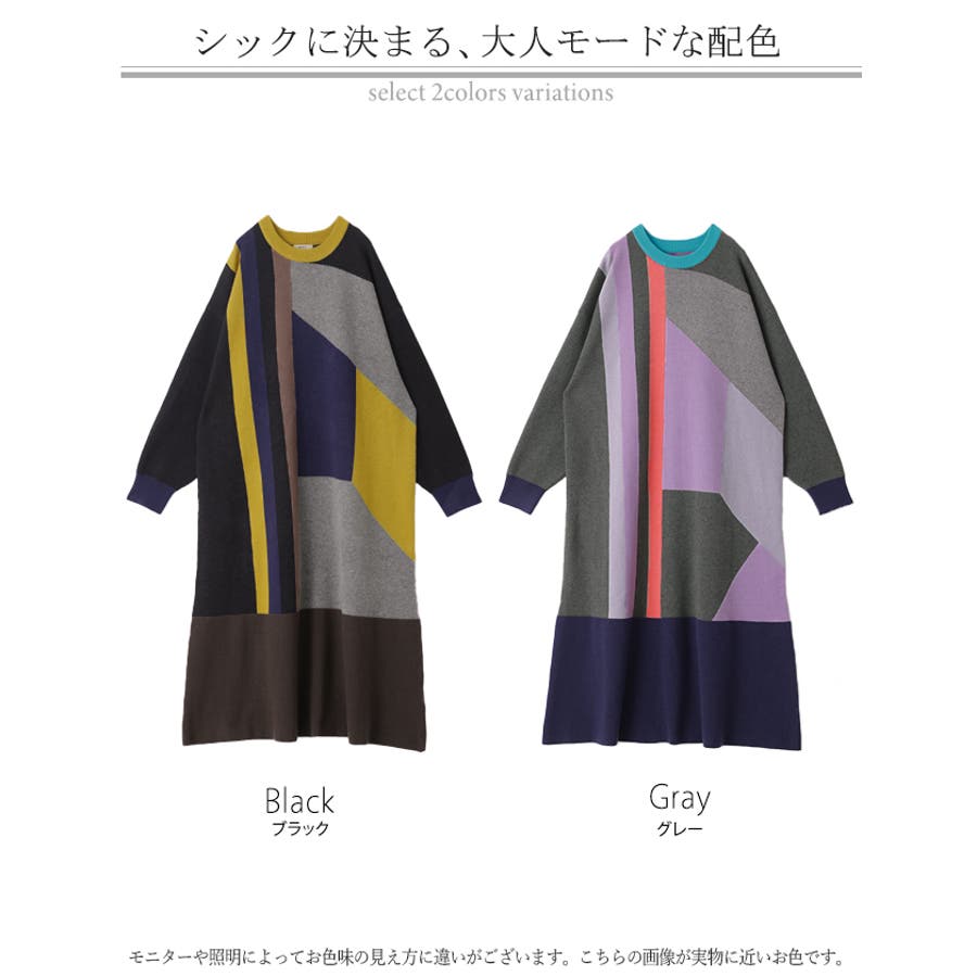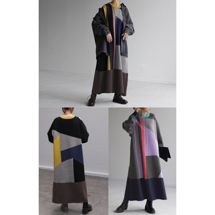 カラフルなブロッキングデザインが目を惹く個性派ニットワンピースです。