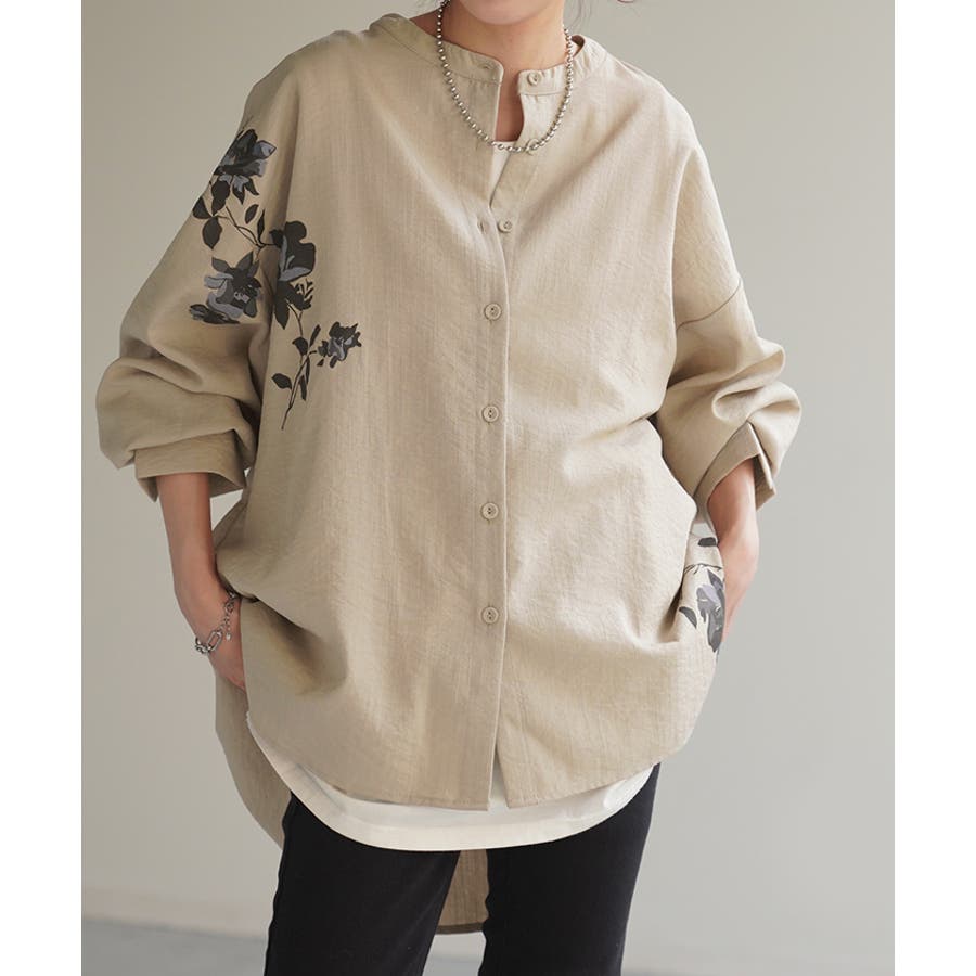 花柄プリントデザインが存在感あるノーカラーのワイドシルエットブラウスです。