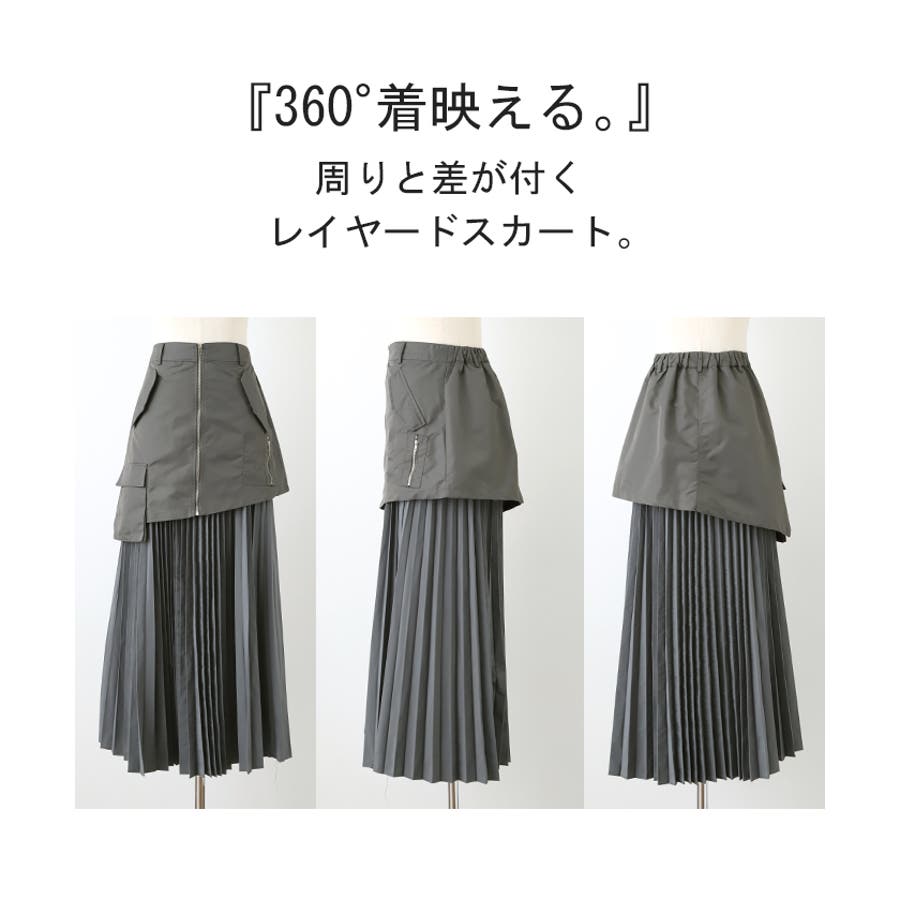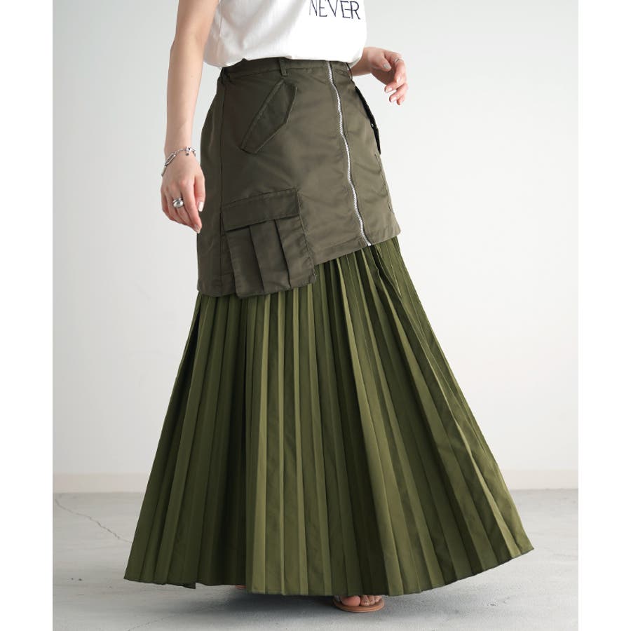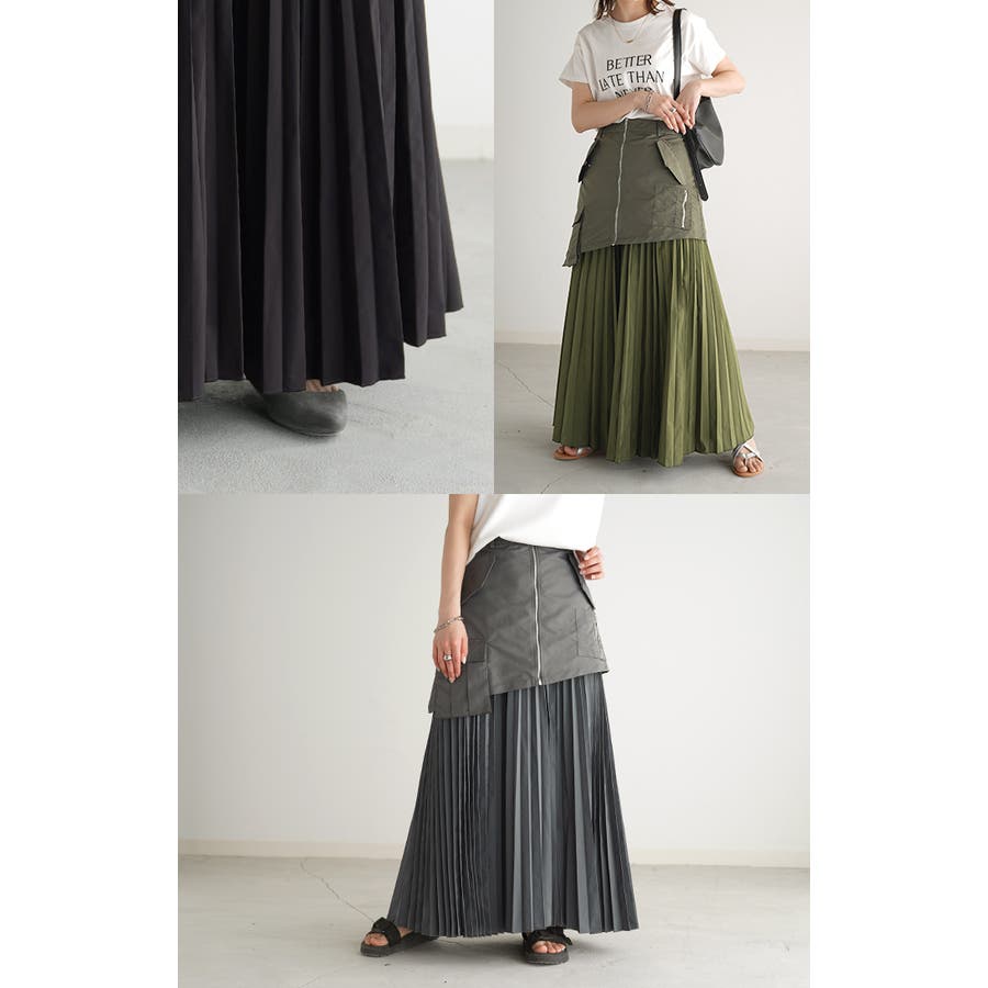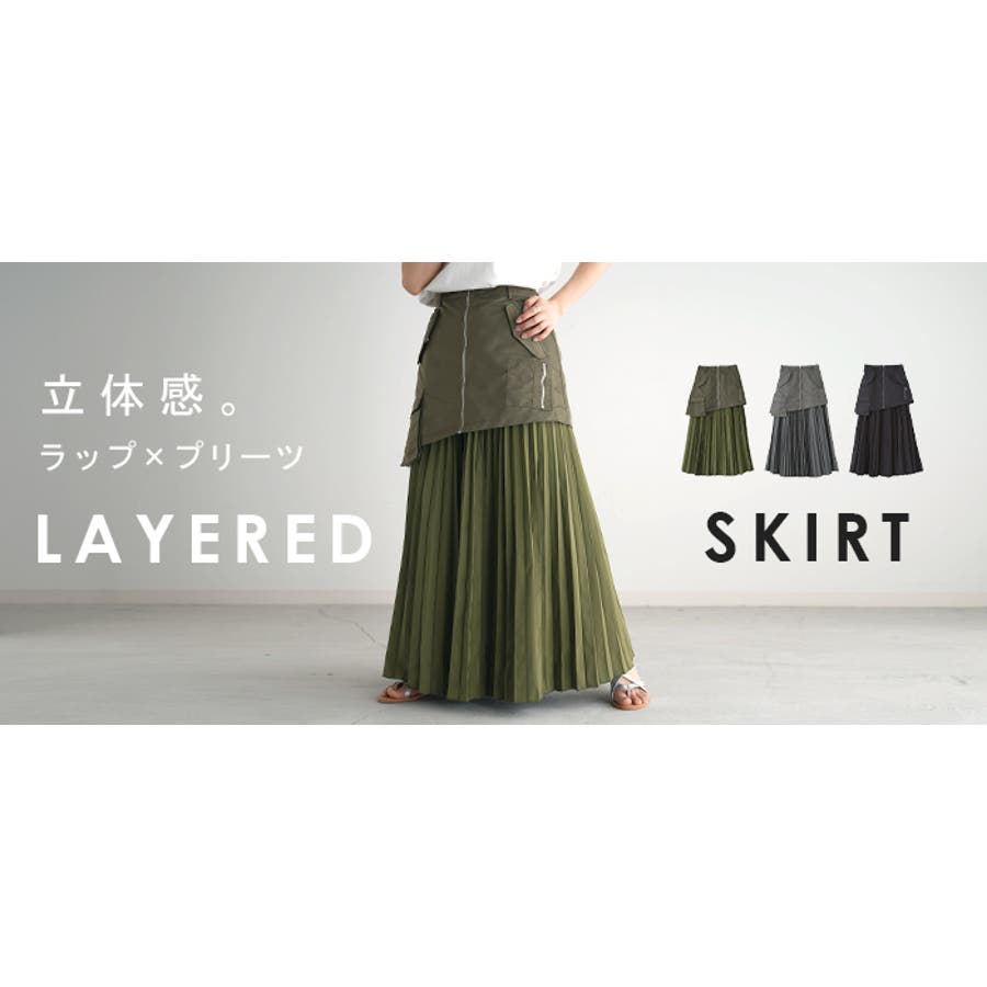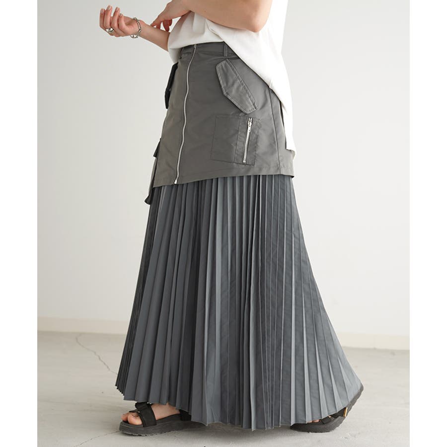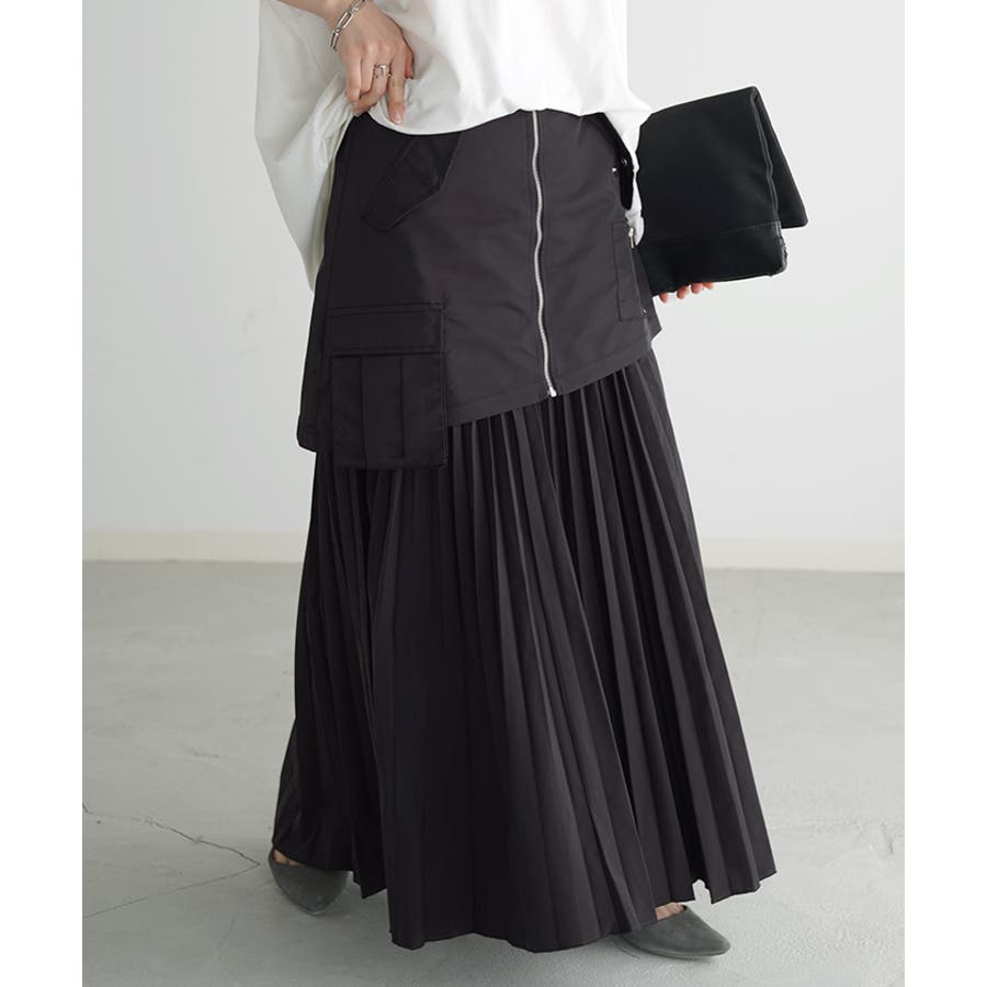 ラップ風のスカートに異素材のプリーツをレイヤードした表情豊かなロングスカートです。