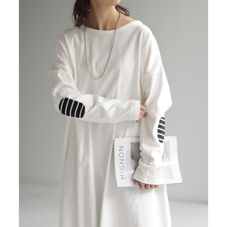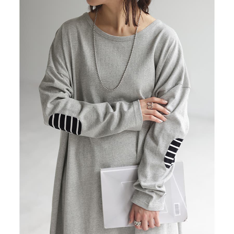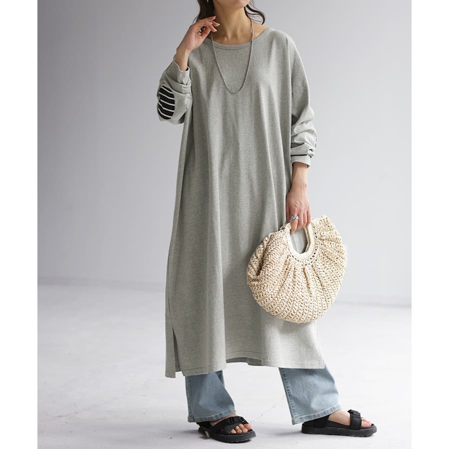 肘裏のエルボーパッチがワンポイントのカットソーワンピースです。