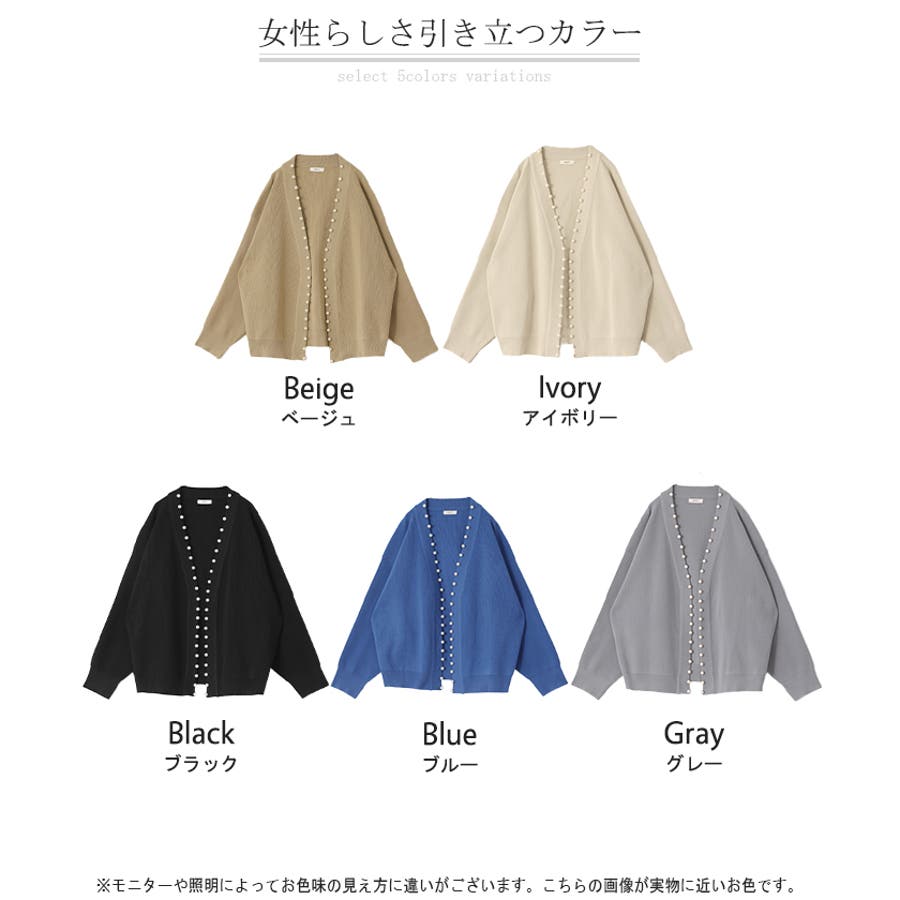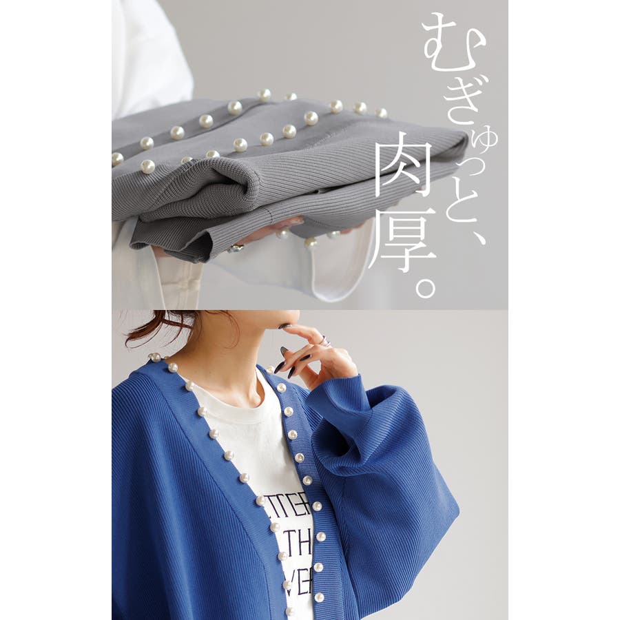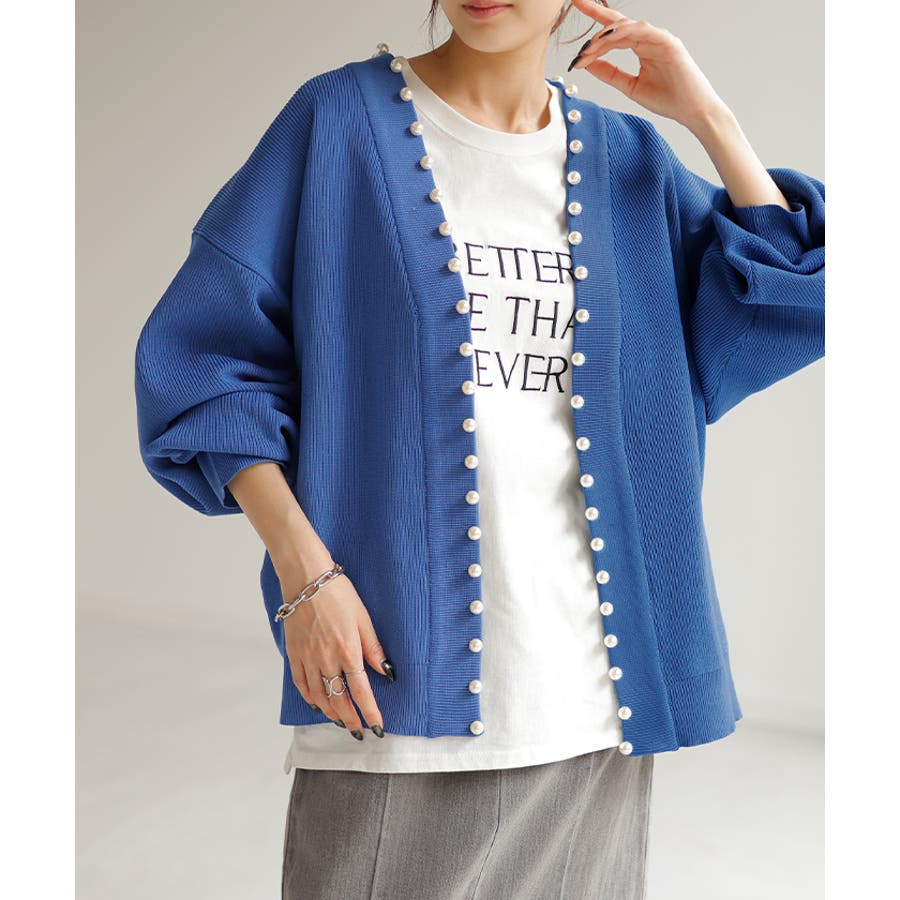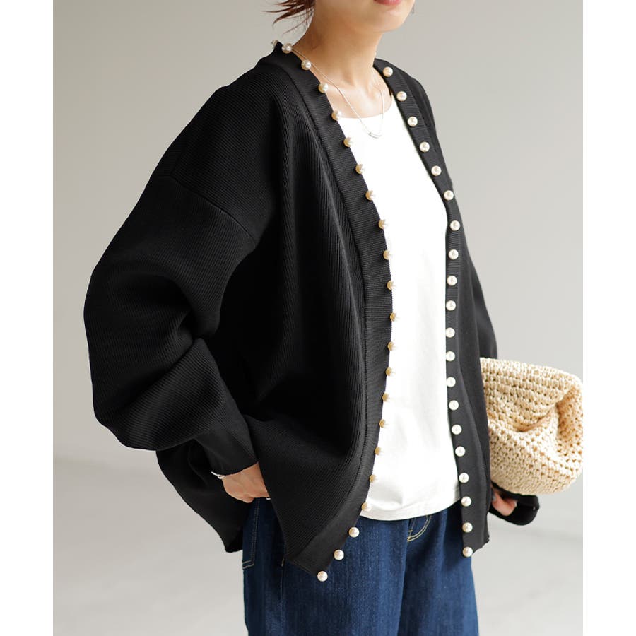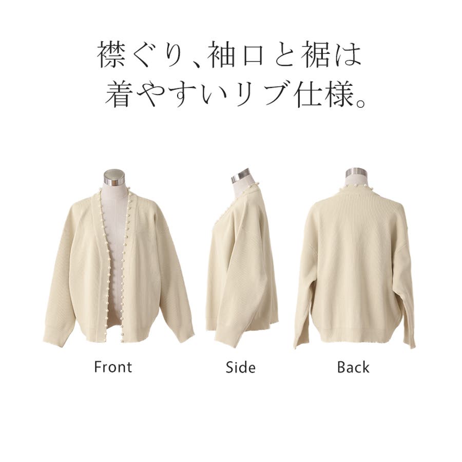 衿元やフロントを縁取ったパールがアクセントのニットカーディガンです。
