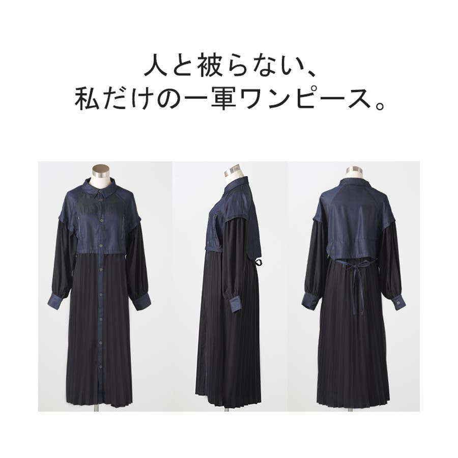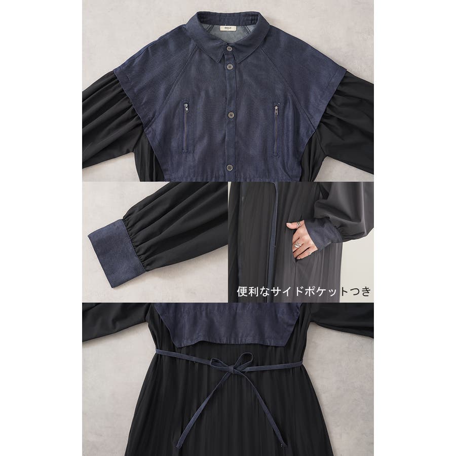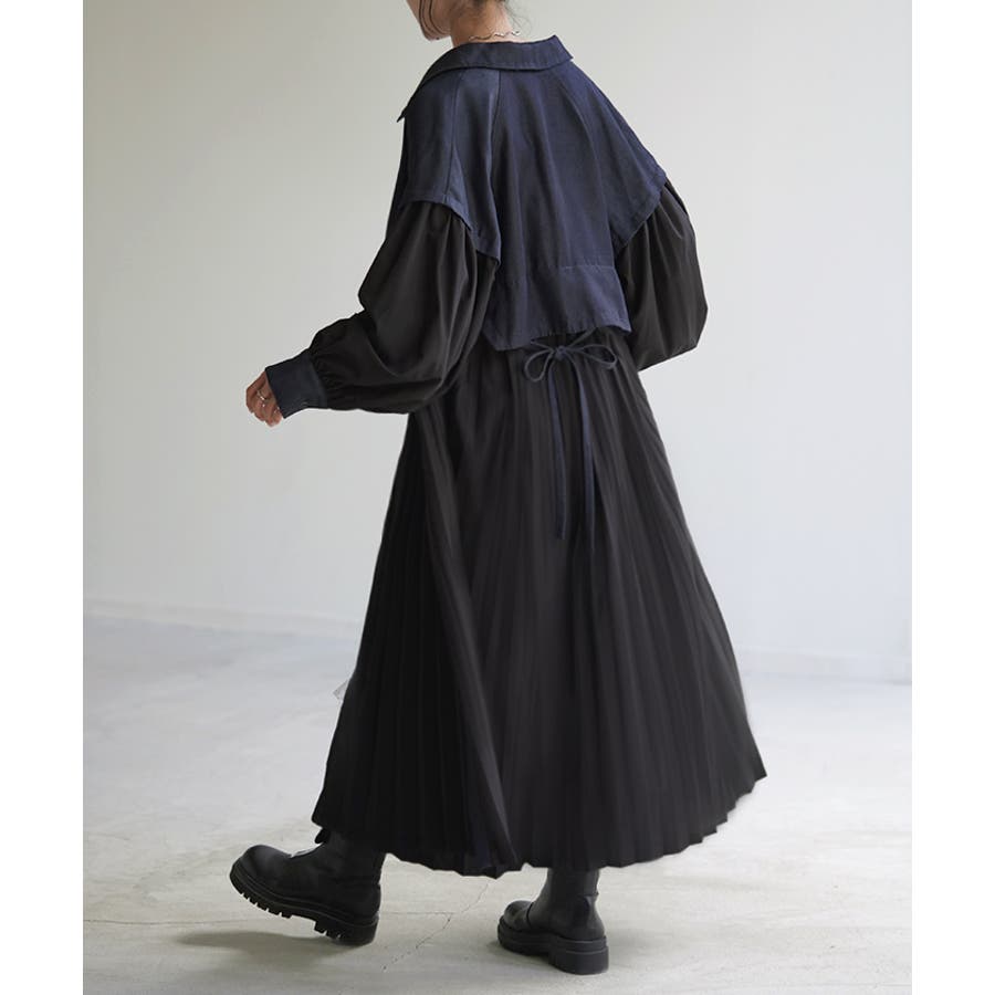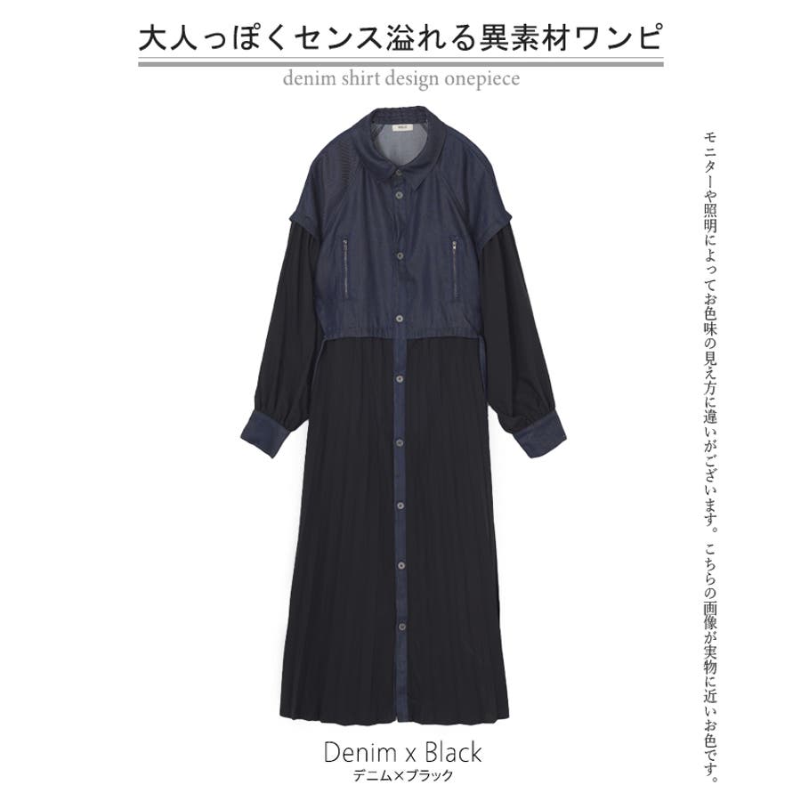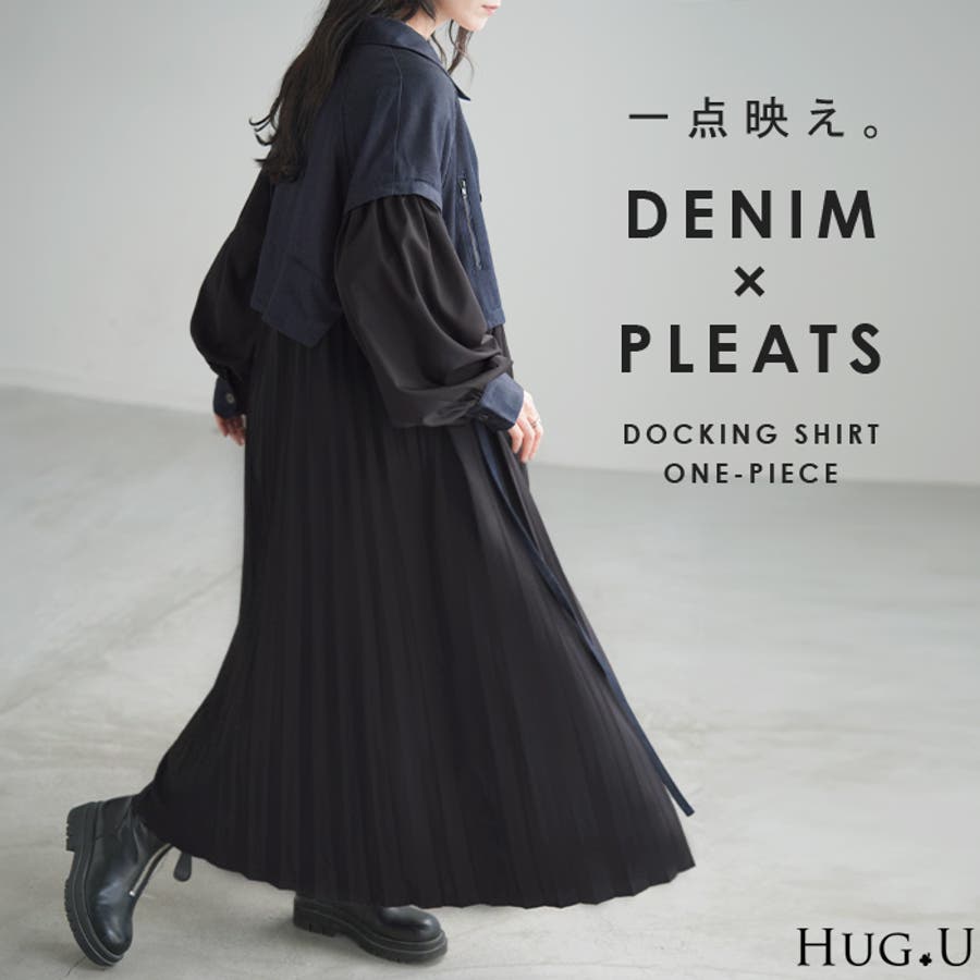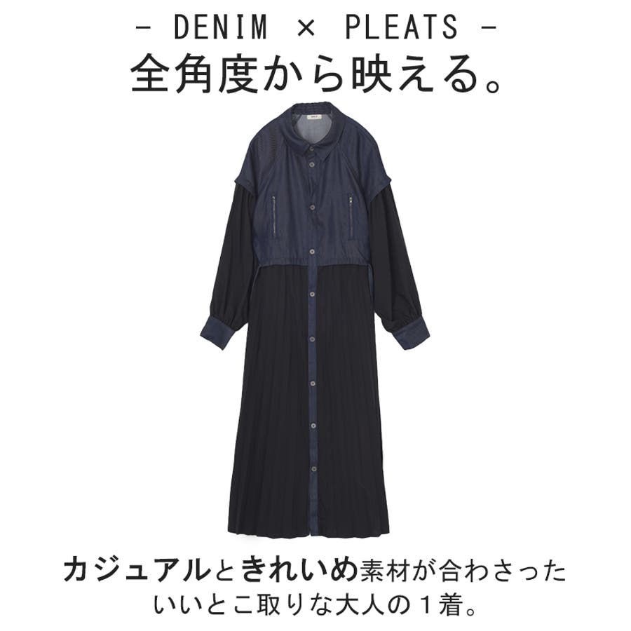 華やかな印象を与えるデニム×プリーツ切り替えワンピースです。