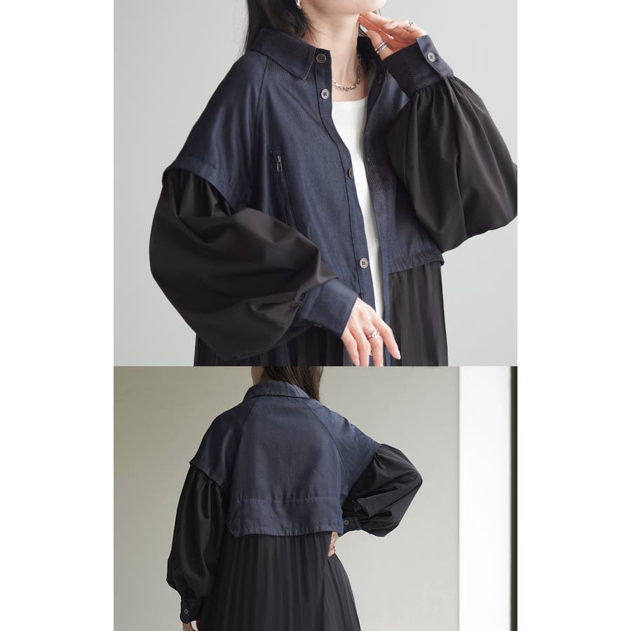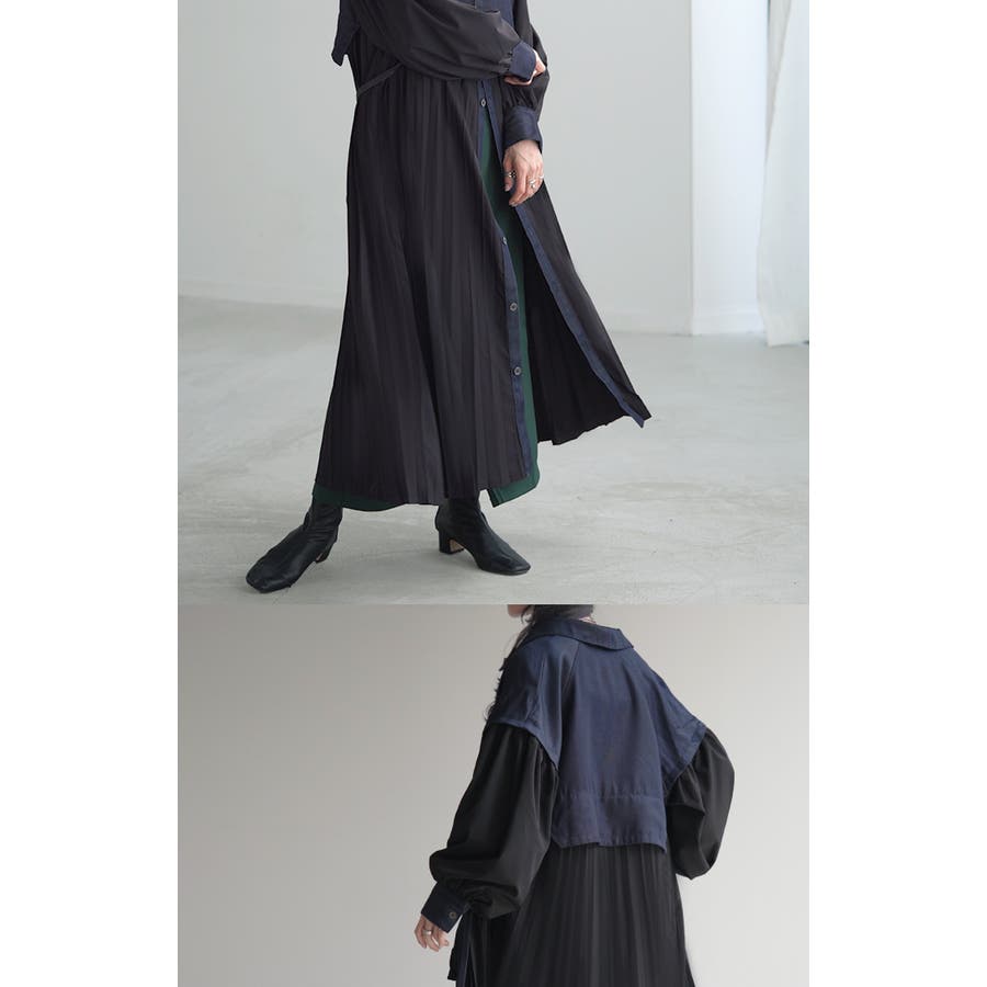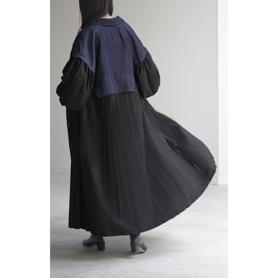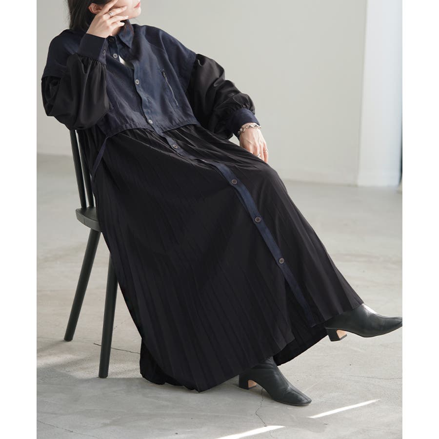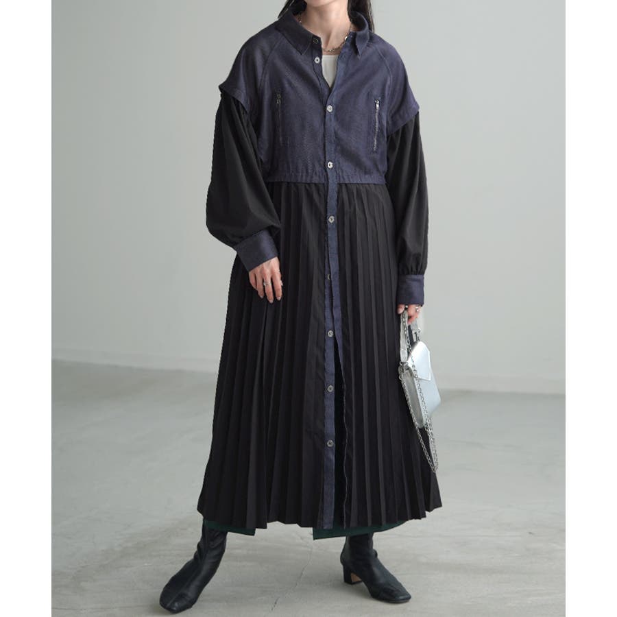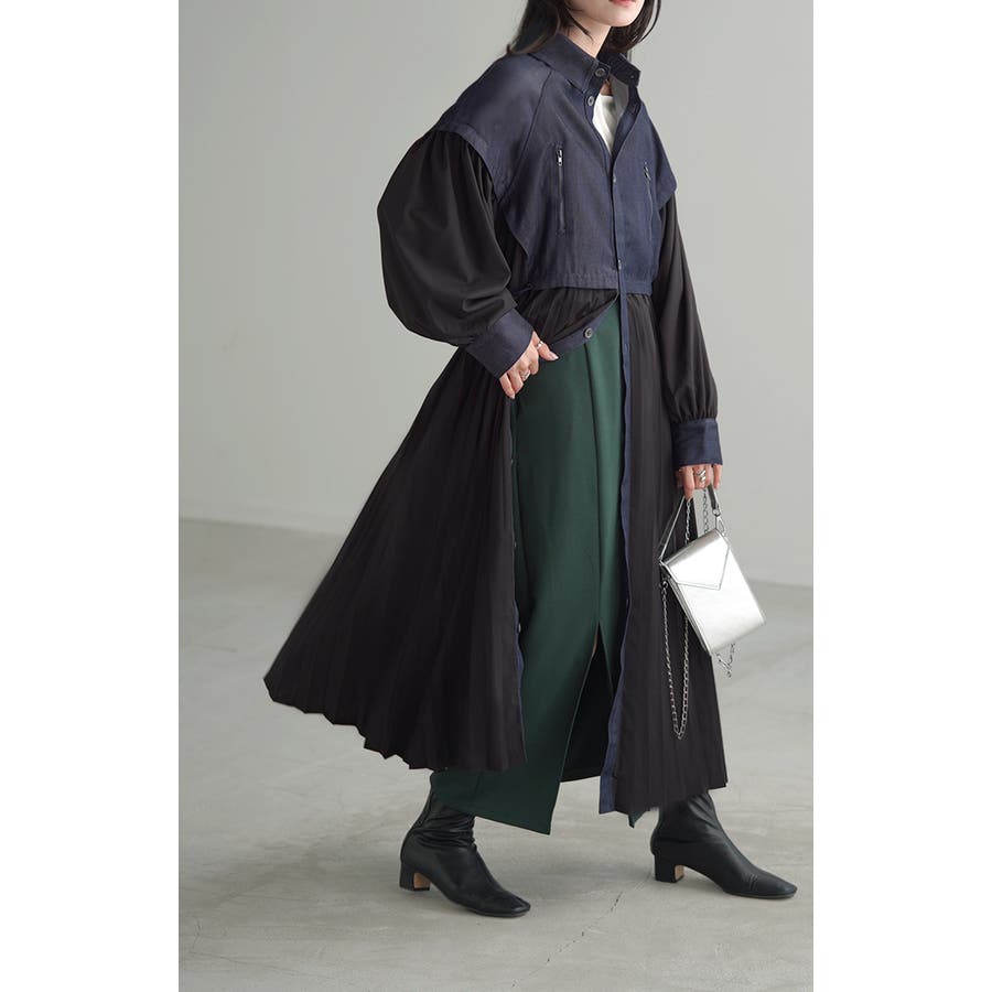 華やかな印象を与えるデニム×プリーツ切り替えワンピースです。