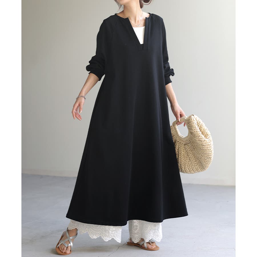 裾に広がるシルエットと抜け感のあるキーネックが上品見えするワンピースです。