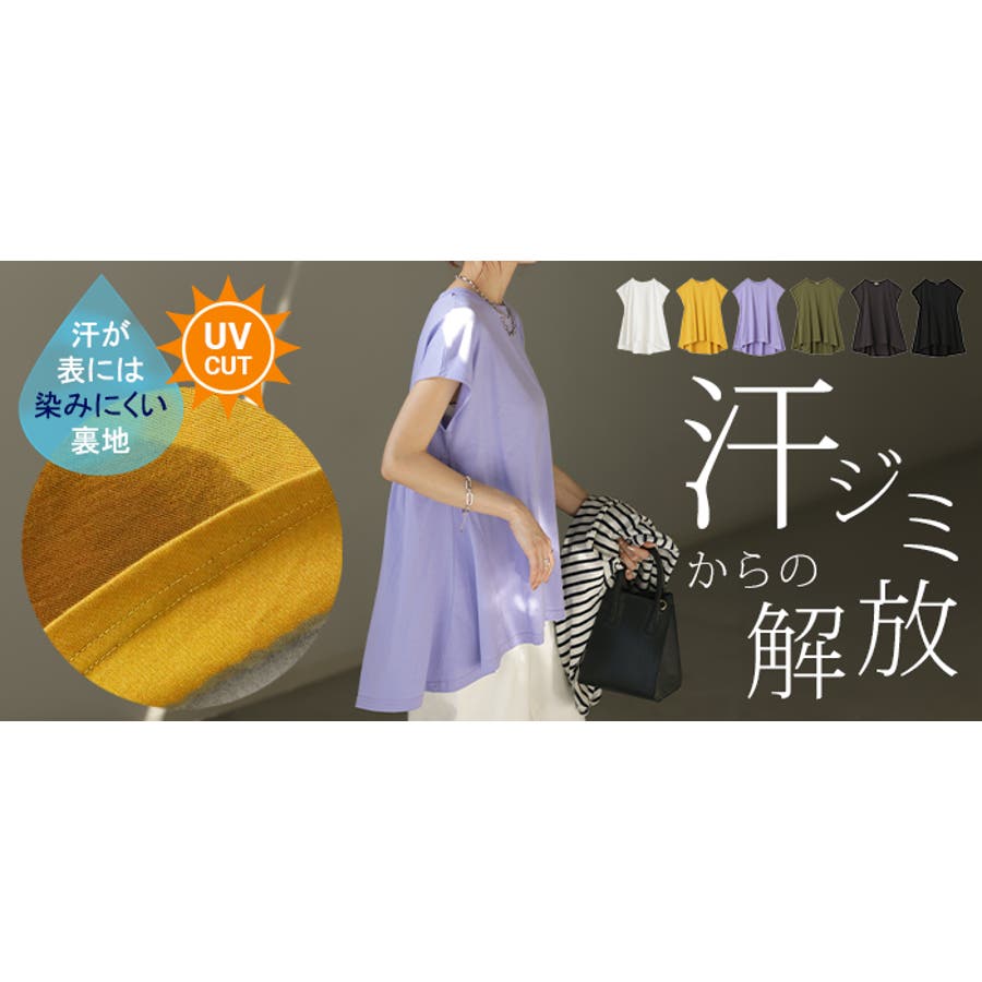 汗ジミ防止生地で汗を気にせずお洒落を楽しめるチュニックTシャツです。