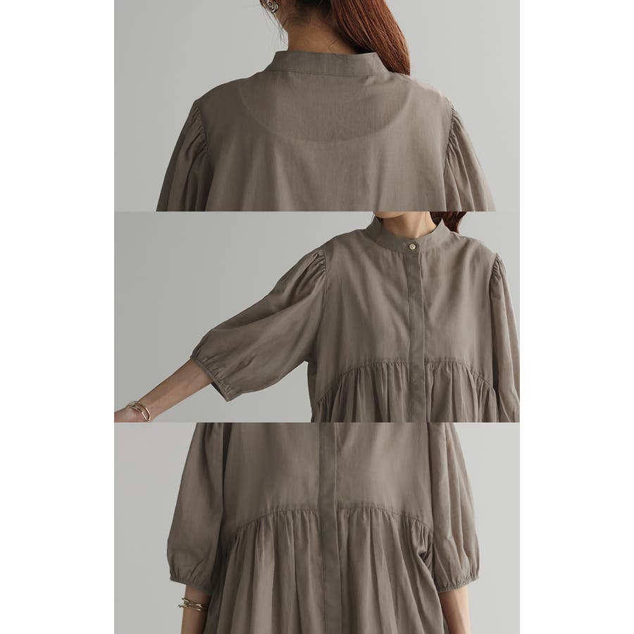 切替ギャザーによって生まれた立体的なドレープが揺らぎ、ふんわりやわらかな印象に。