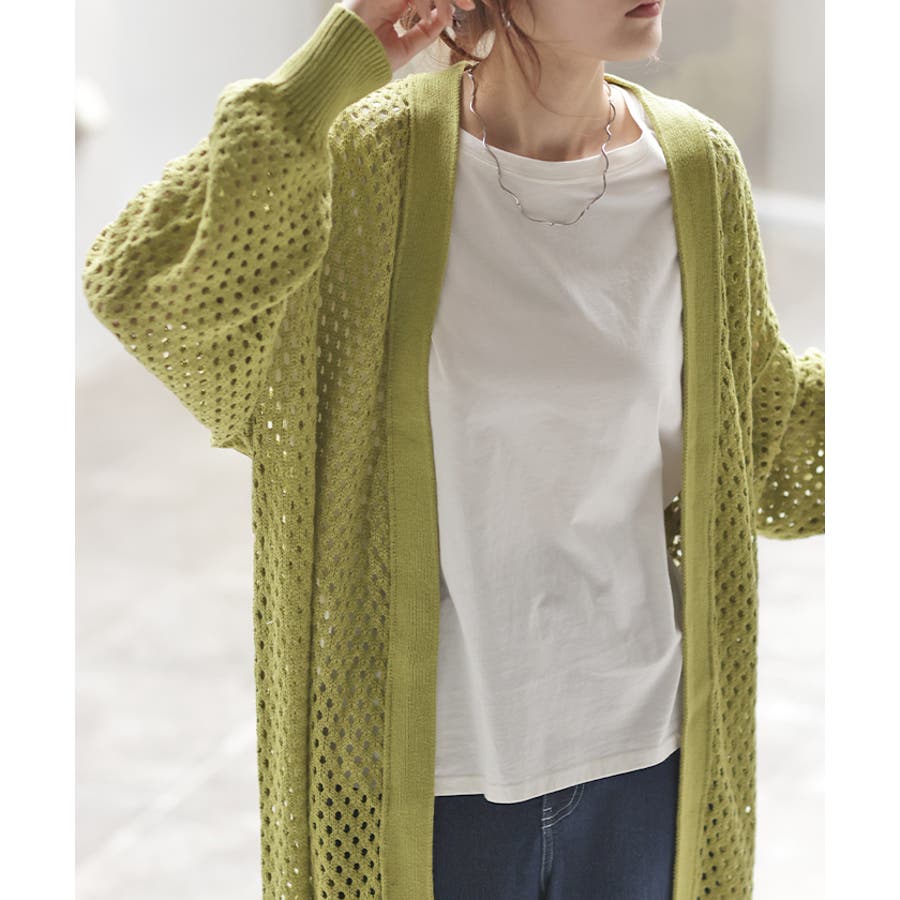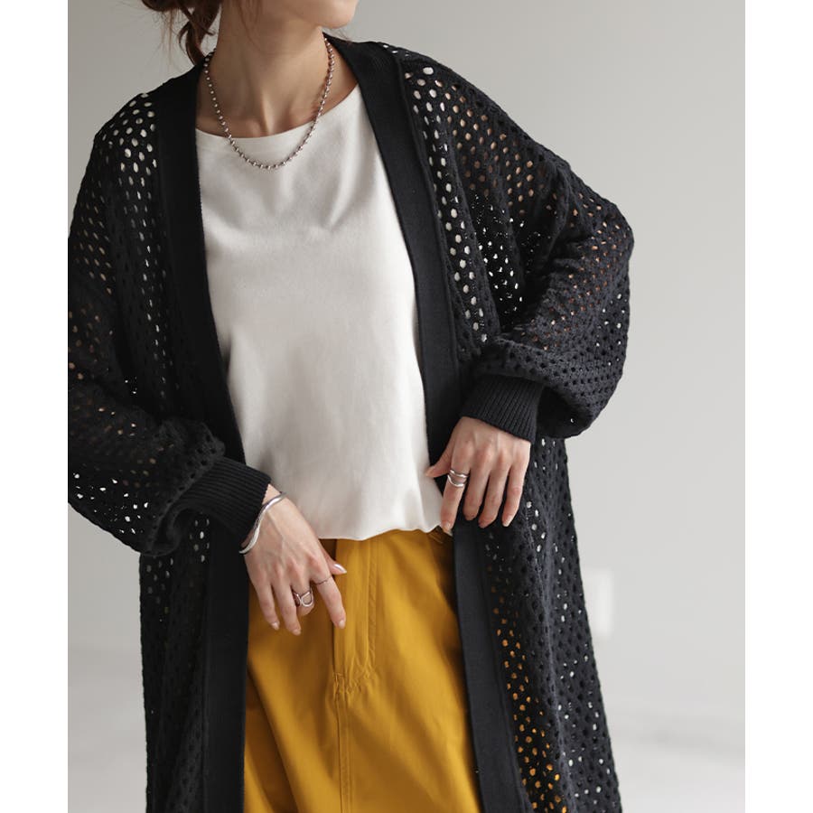 透かし編みがトレンドライクなロングニットカーディガンです。