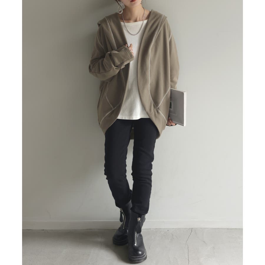 いつものスタイリングに雰囲気をプラスしてくれるフード付きのトッパーカーディガンです。