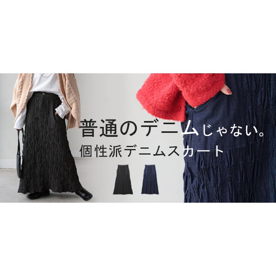 存在感のあるナチュラルなシワ感が特徴的なデニムスカートです。
