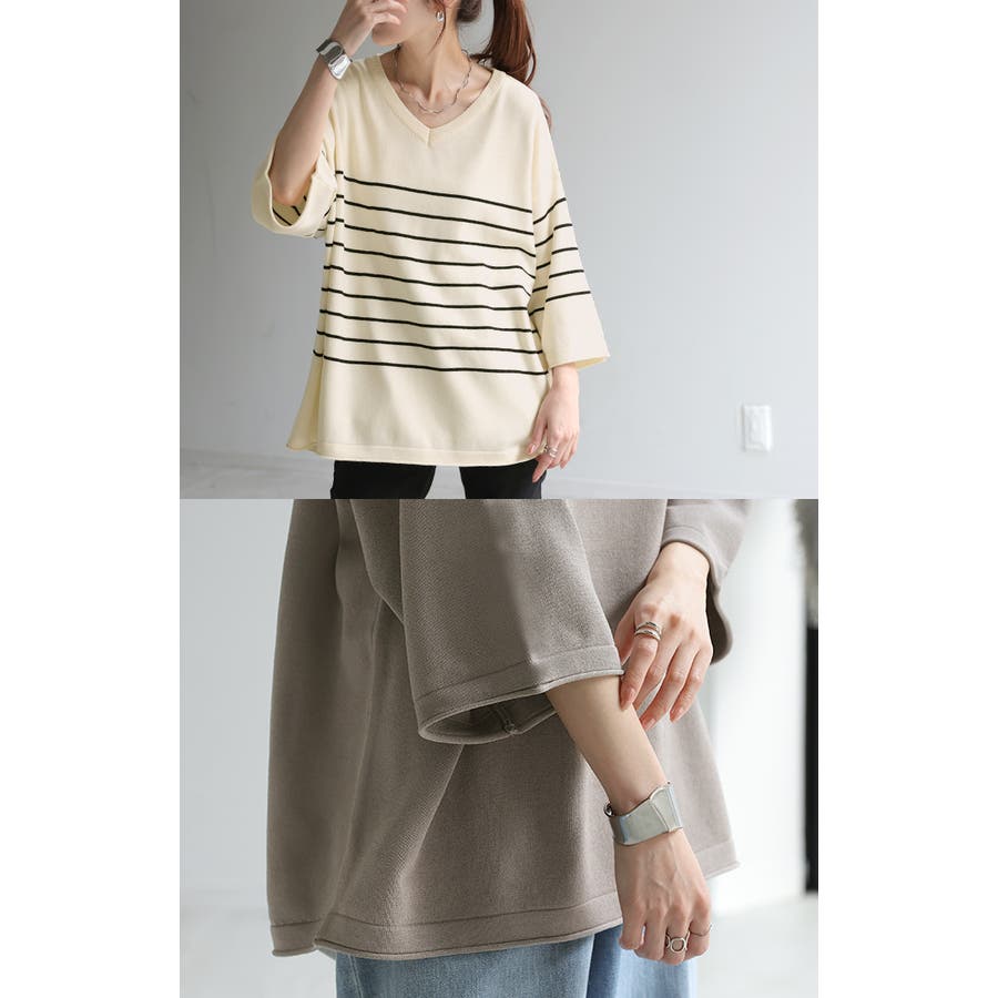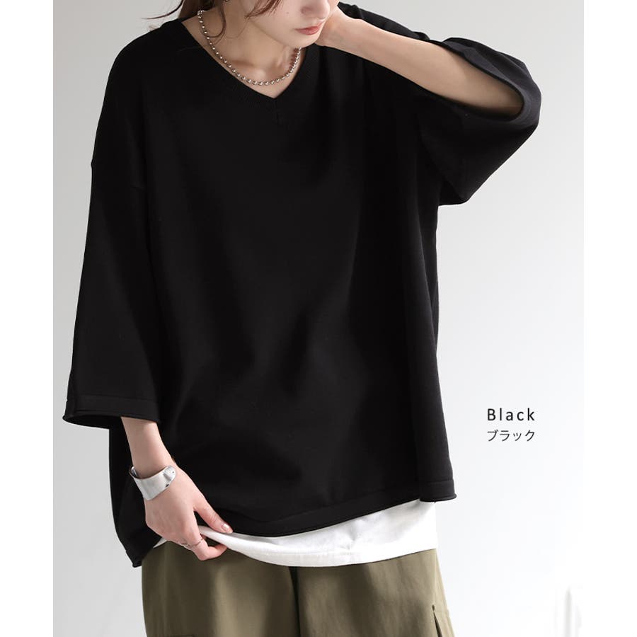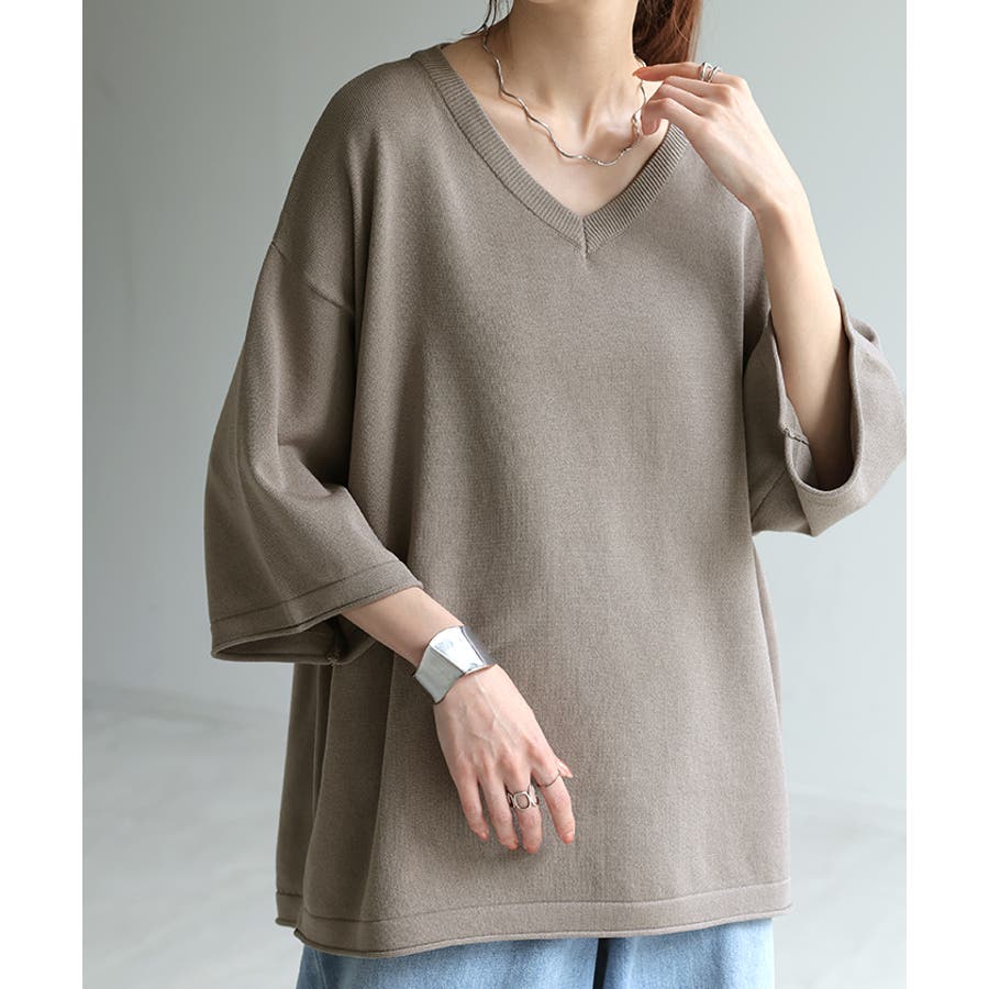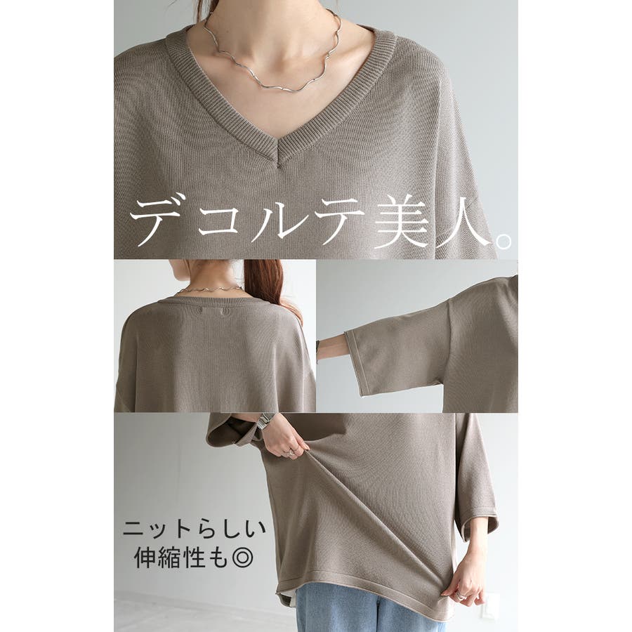 顔周りや二の腕がスッキリ見えるVネックと袖の長さがこだわりのポイント。