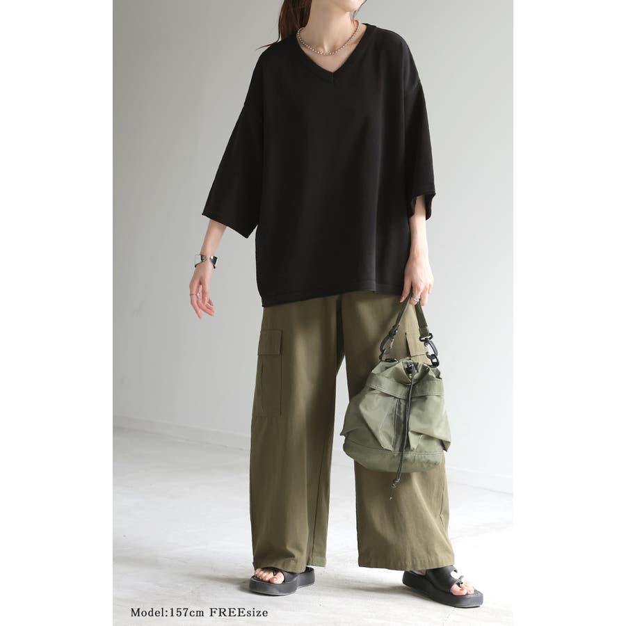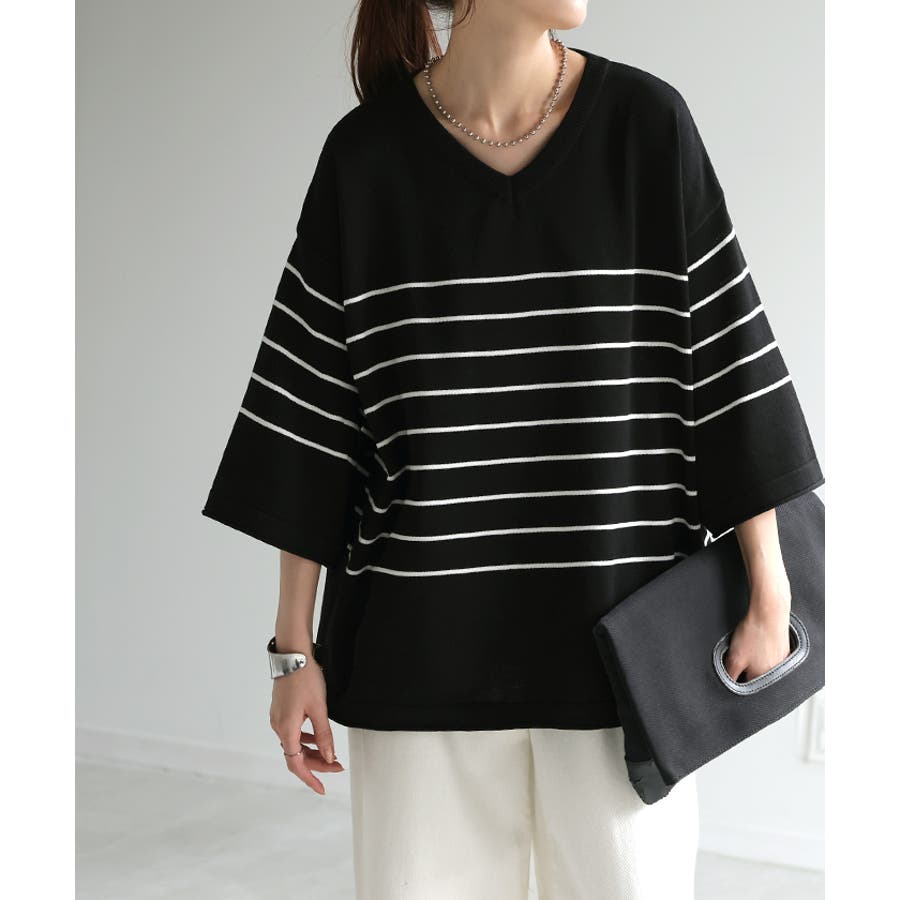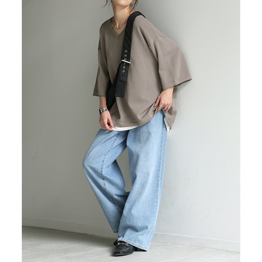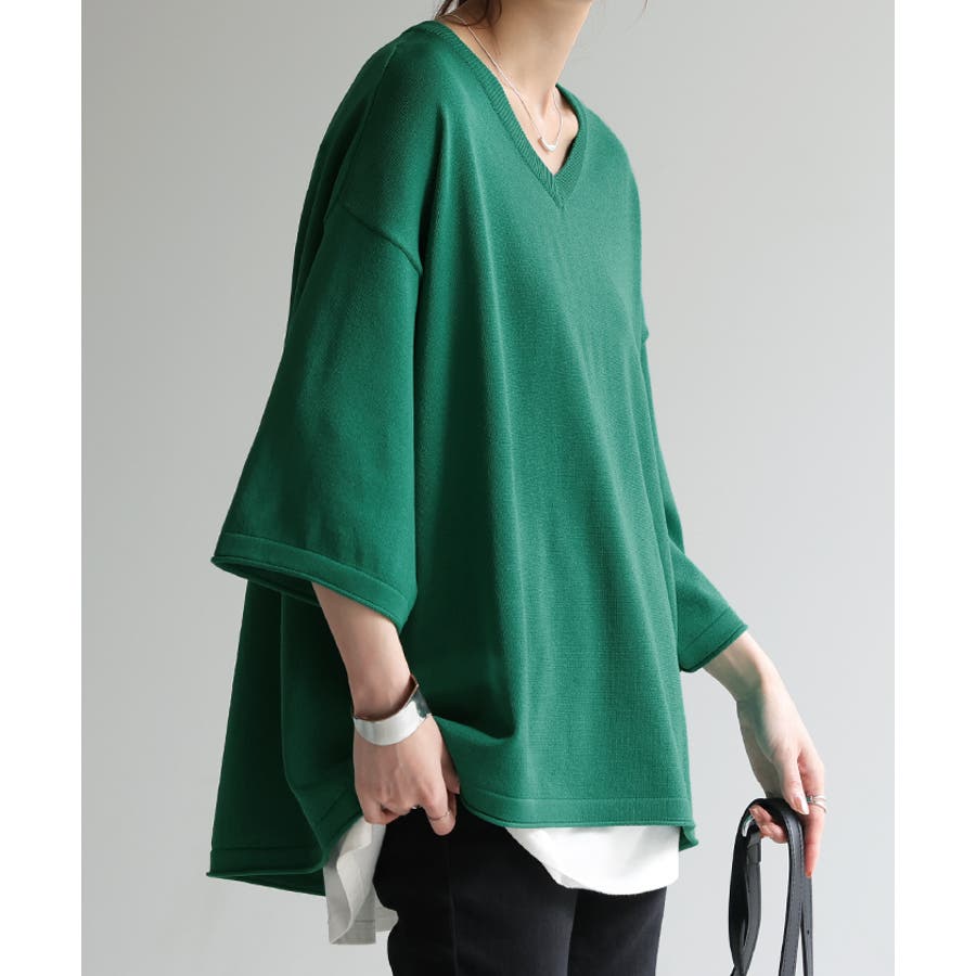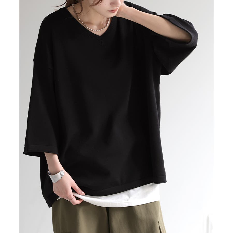 顔周りや二の腕がスッキリ見えるVネックと袖の長さがこだわりのポイント。