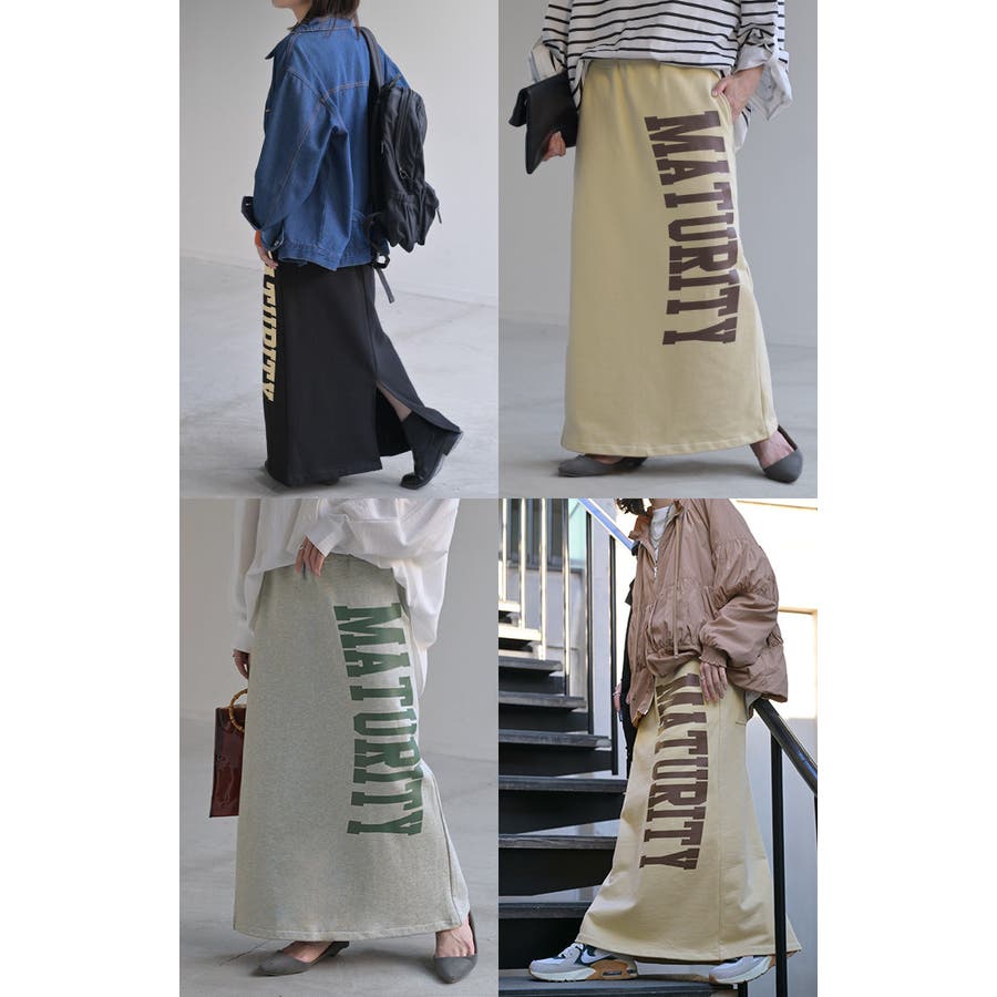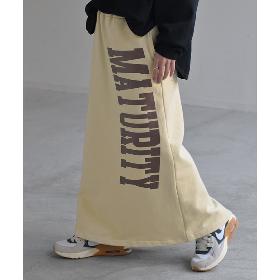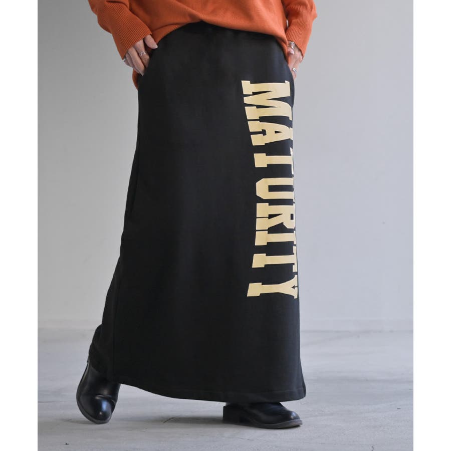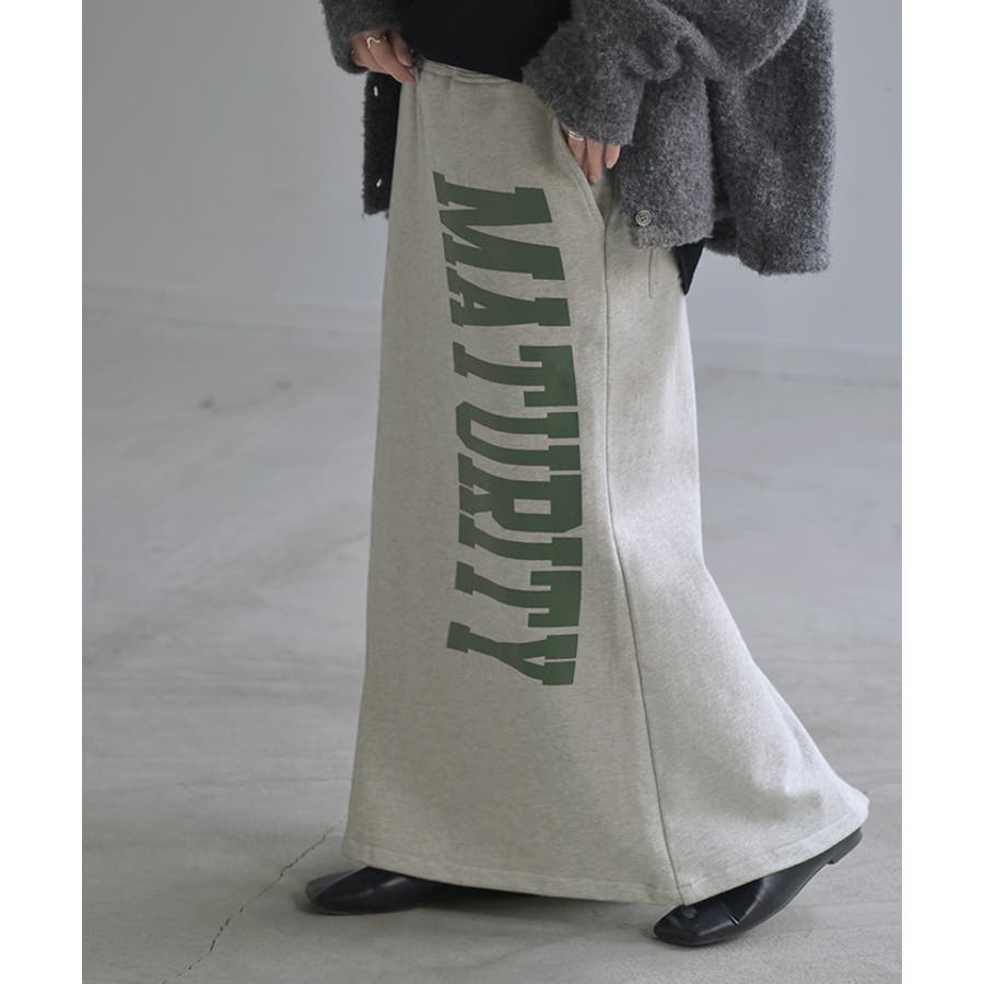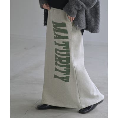 大きくプリントされた英字ロゴが目を惹く裏毛ナロースカートです。