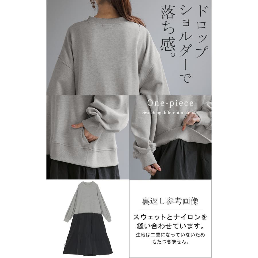 スウェットトップスとナイロンスカートの異素材切り替えでトレンド感あるデザイン。