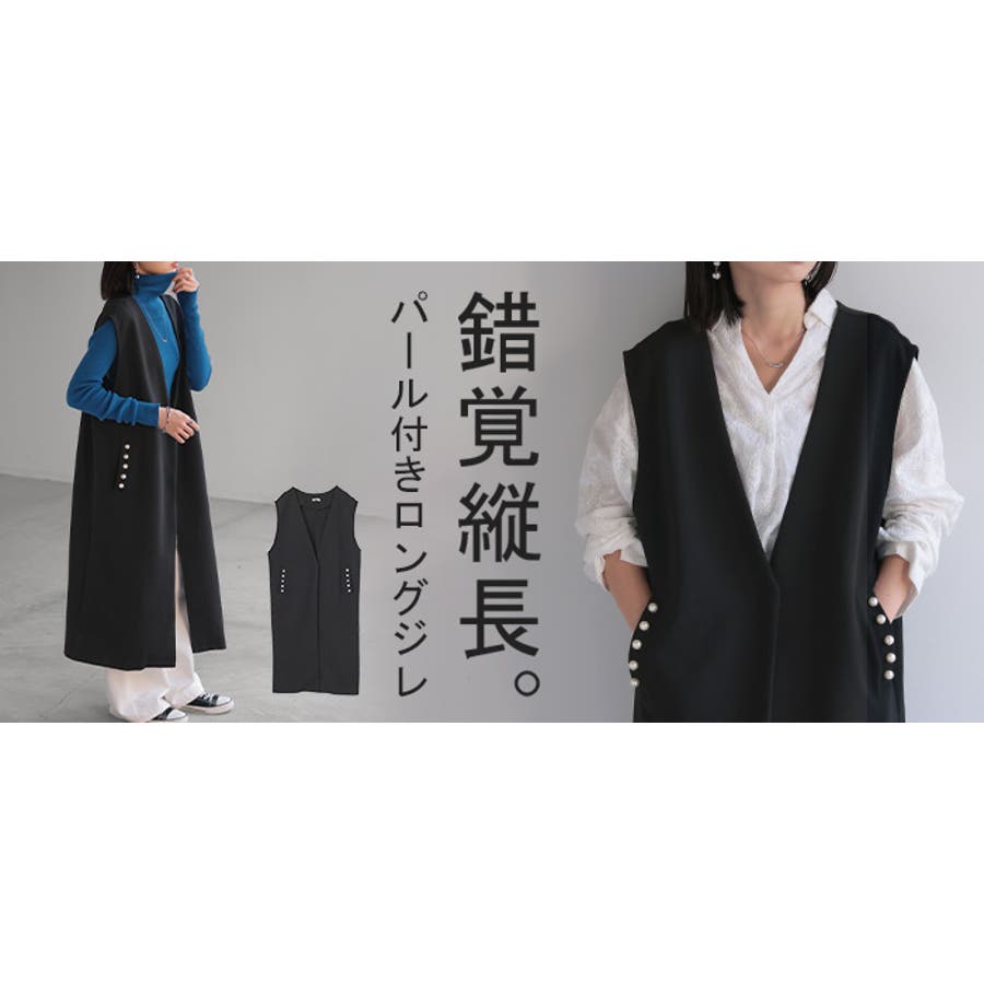 上からサラッと羽織るだけで旬なスタイルが完成するパール付きロングジレです。