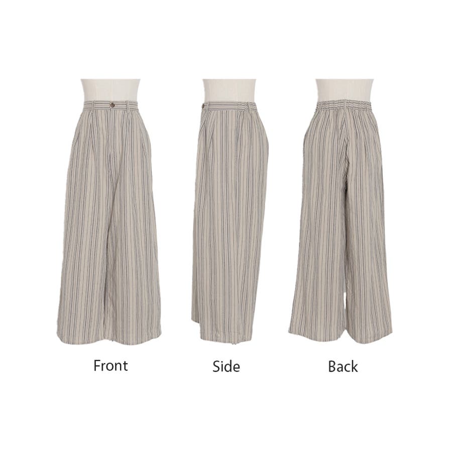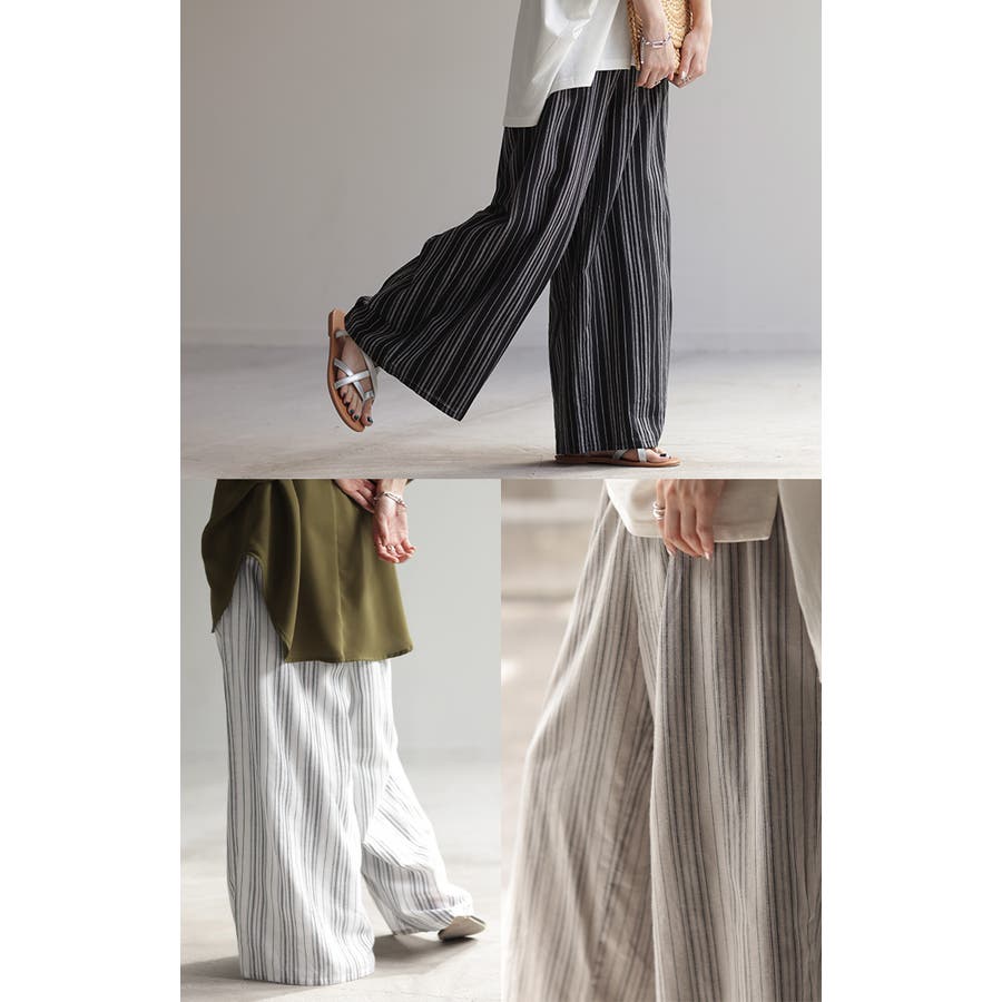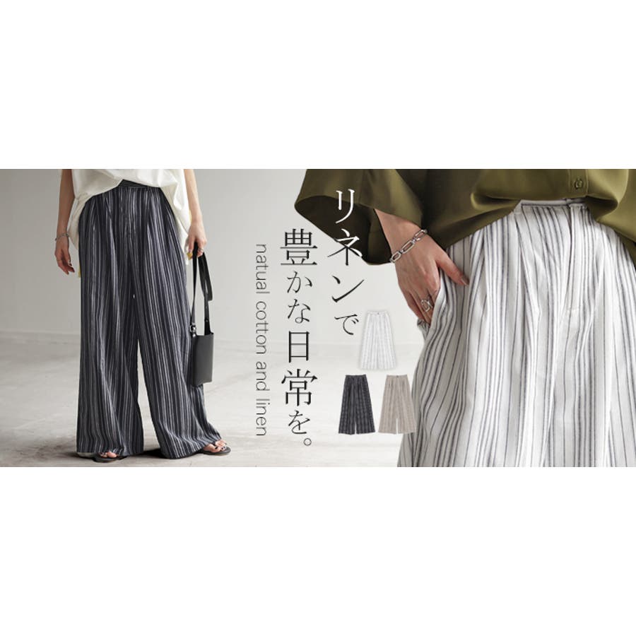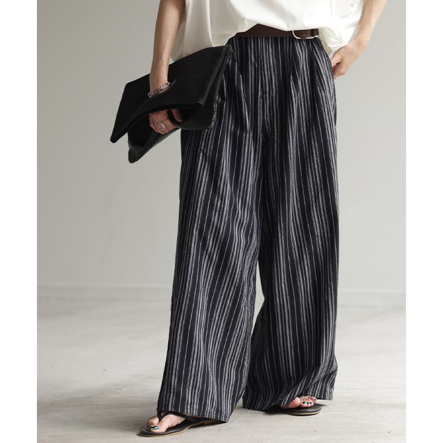 麻のナチュラルな表面感とワイドピッチのストライプワイドパンツです。