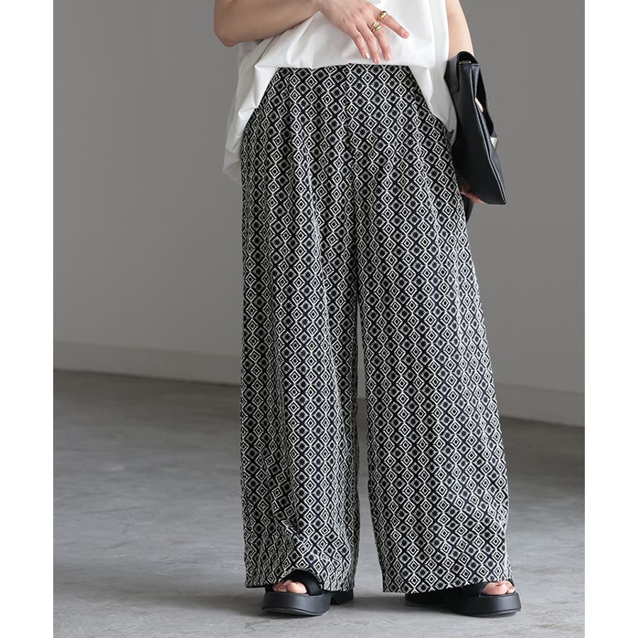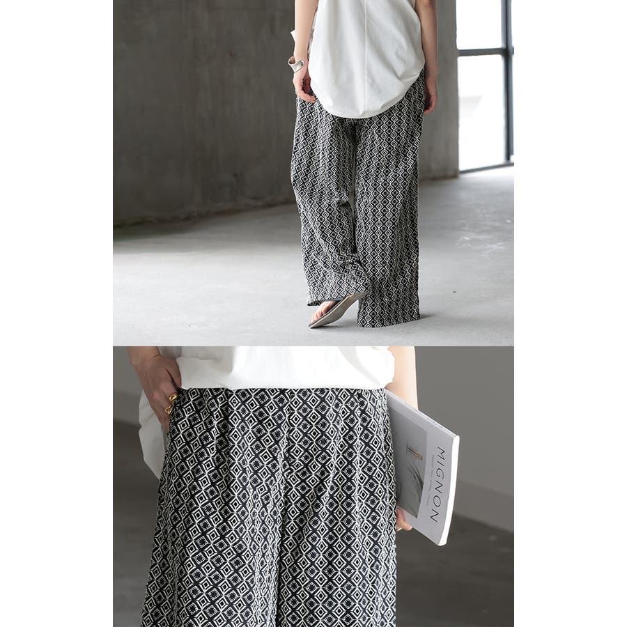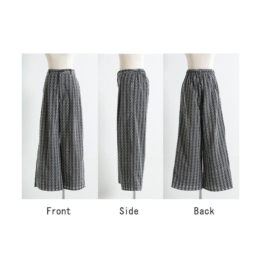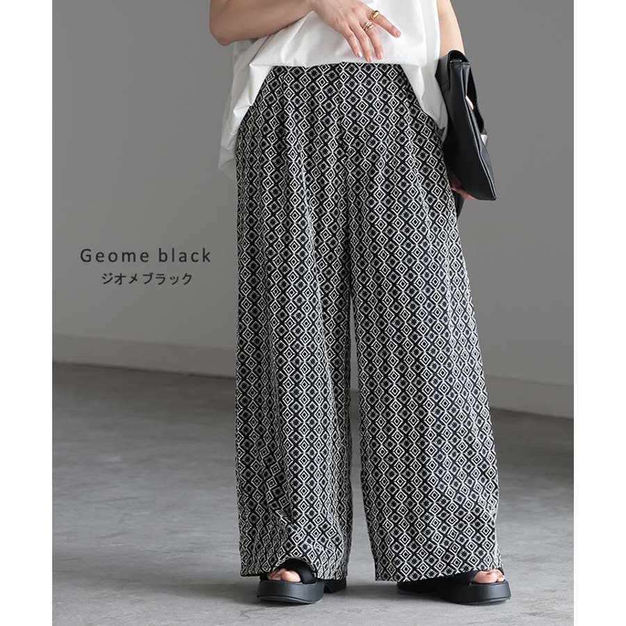 レトロな風合いの幾何学柄が目を惹くワイドパンツです。