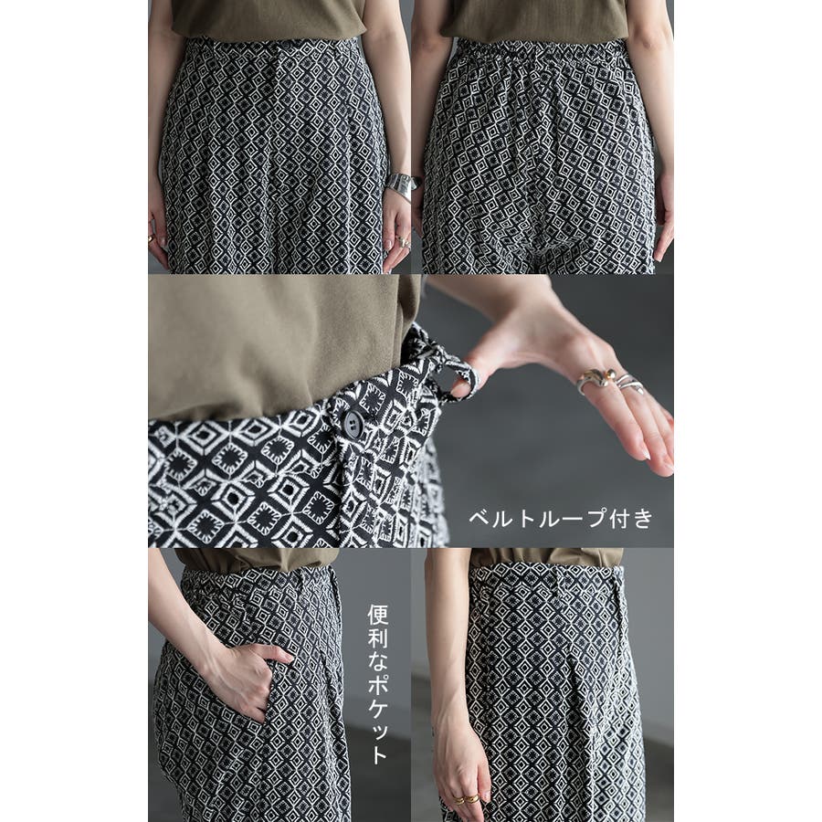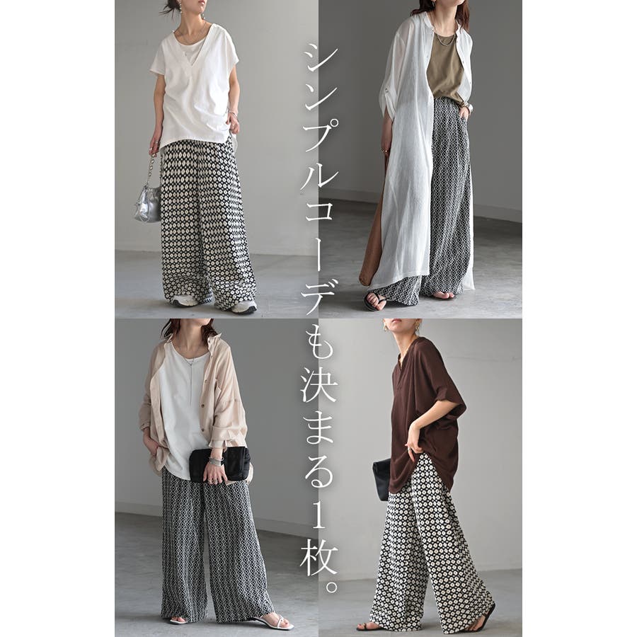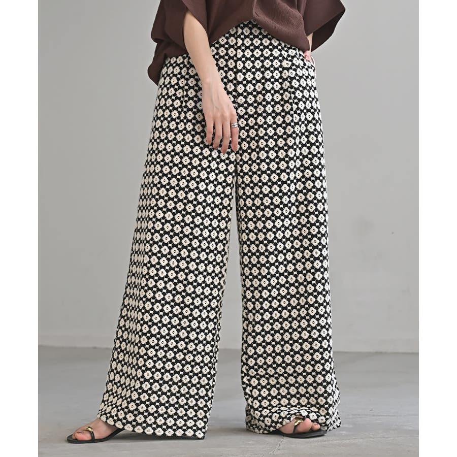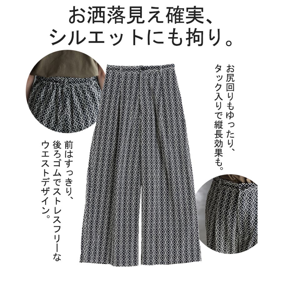レトロな風合いの幾何学柄が目を惹くワイドパンツです。