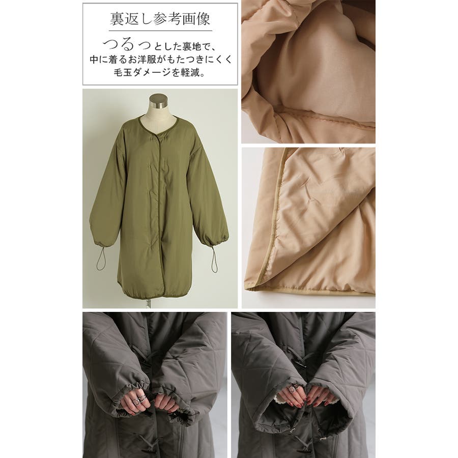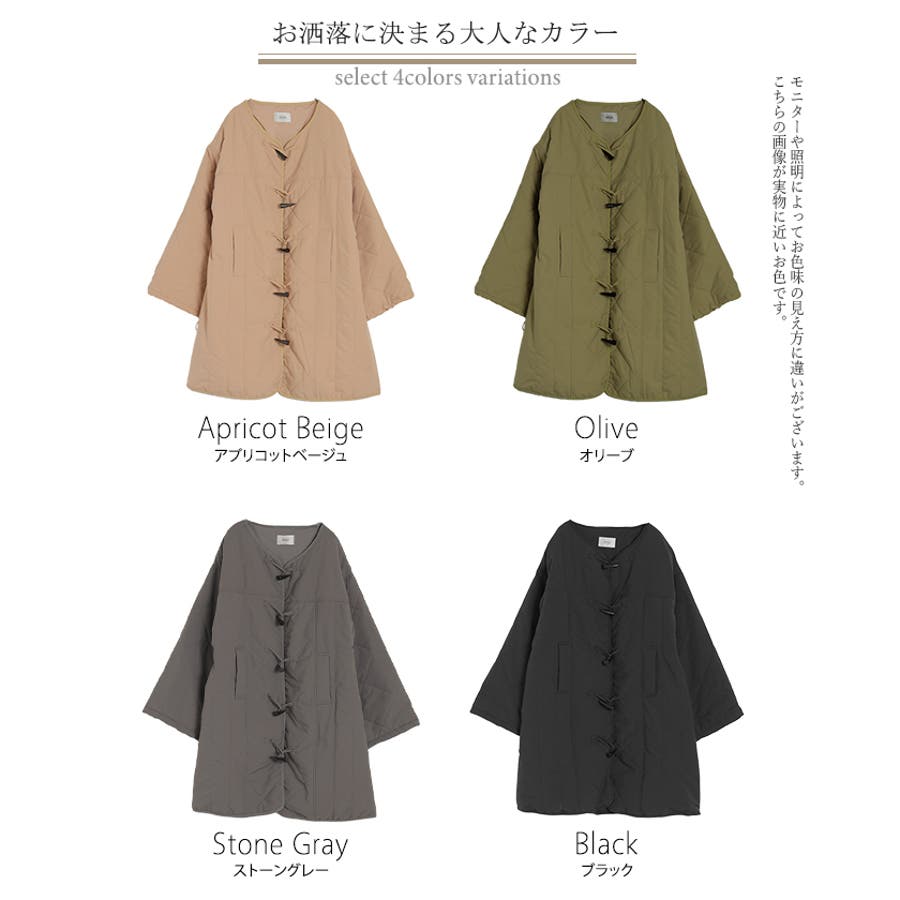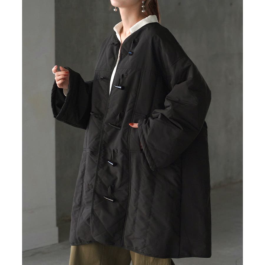 いつものコーデにさらっと羽織れるノーカラーキルティングコートです。