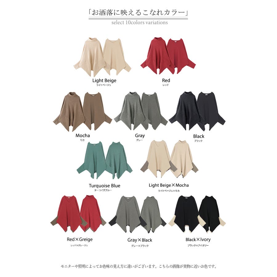 | カラー | ブラック(Vネック) / モカ(Vネック) / グレー(Vネック) / ターコイズブルー(Vネック) / レッド(Vネック) / ライトベージュ(Vネック) / ライトベージュ×モカ(Vネック) / グレー×ブラック(Vネック) / レッド×グレージュ(Vネック) / ブラック×アイボリー(Vネック) / ブラック(ハイネック) / モカ(ハイネック) / グレー(ハイネック) / レッド(ハイネック) / ライトベージュ(ハイネック) / ターコイズブルー(ハイネック) / ライトベージュ×モカ(ハイネック) / グレー×ブラック(ハイネック) / レッド×グレージュ(ハイネック) / ブラック×アイボリー(ハイネック) |