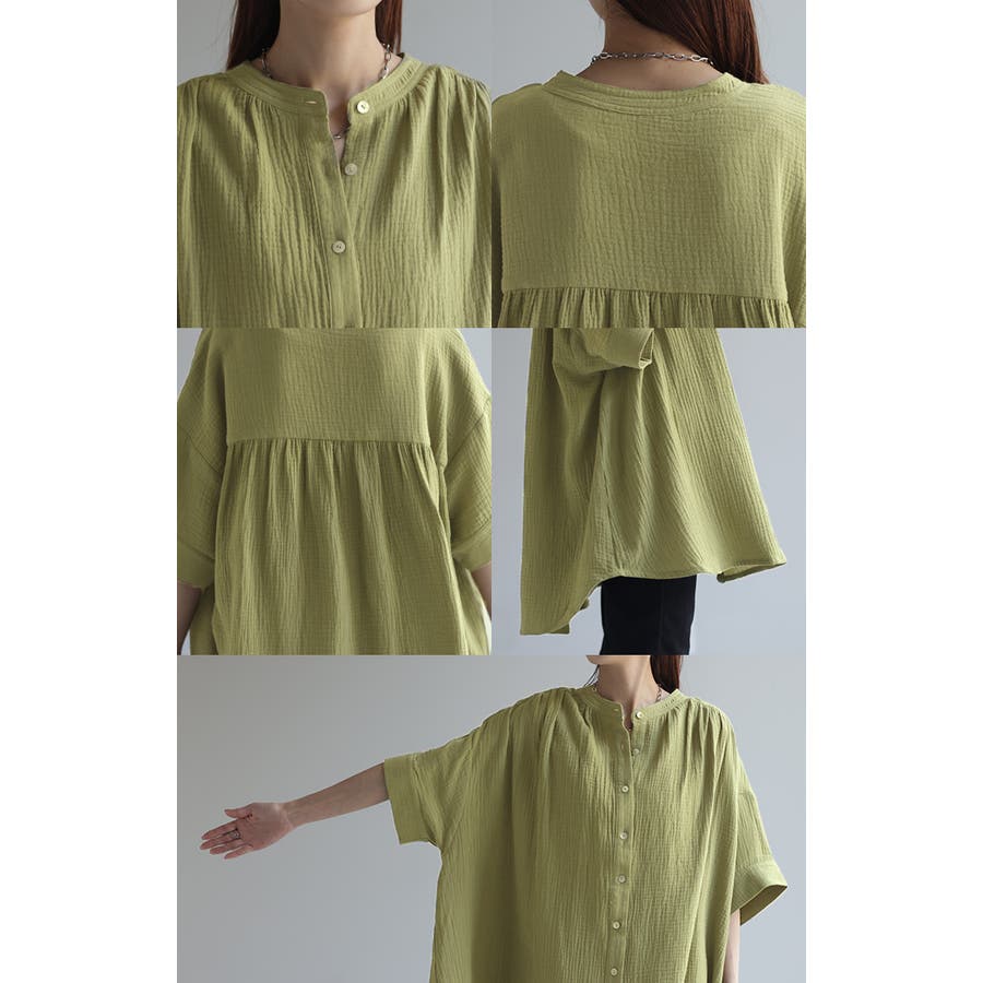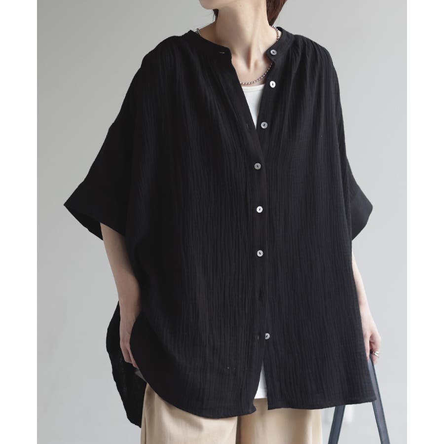 首元がすっきりと見えるバンドカラーのガーゼシャツです。