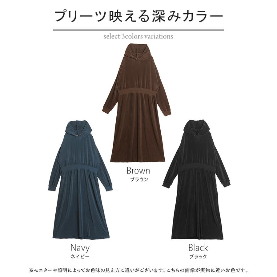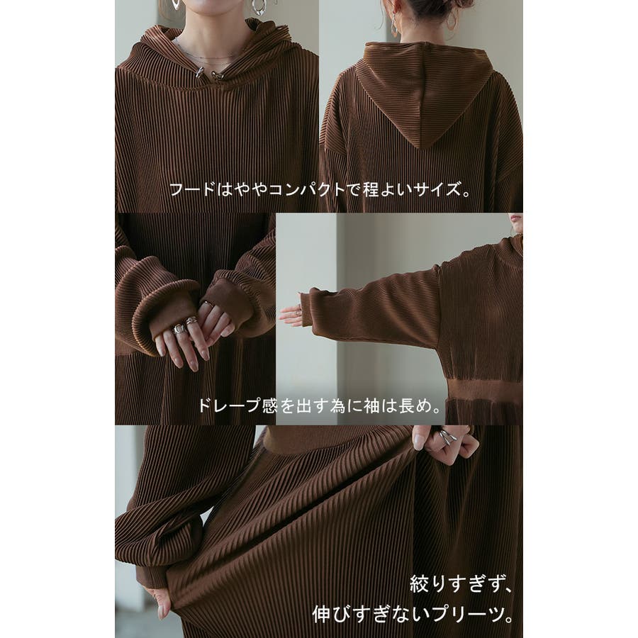 縦ラインプリーツ加工で細見えが叶うフード付きワンピースです。