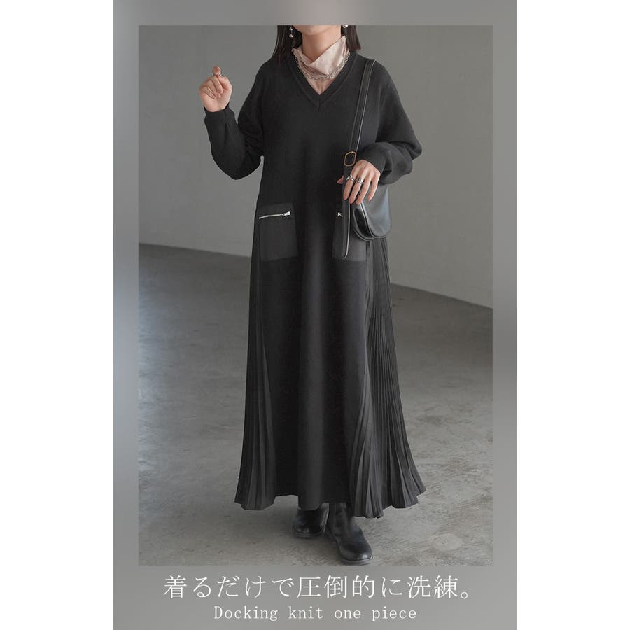 両サイドにプリーツを切り替えた、1枚で着映えするデザインニットワンピースです。