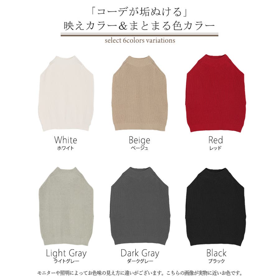 | カラー | ベージュ(ハイネック) / ブラック(ハイネック) / ダークグレー(ハイネック) / レッド(ハイネック) / ホワイト(ハイネック) / ライトグレー(ハイネック) / ベージュ(Vネック) / ブラック(Vネック) / ダークグレー(Vネック) / レッド(Vネック) / ホワイト(Vネック) / ライトグレー(Vネック) |