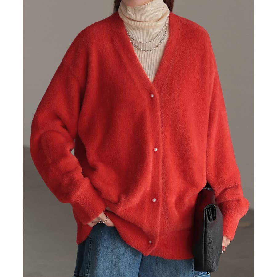 パールボタンが上品&映える配色シャギーニットカーディガンです。