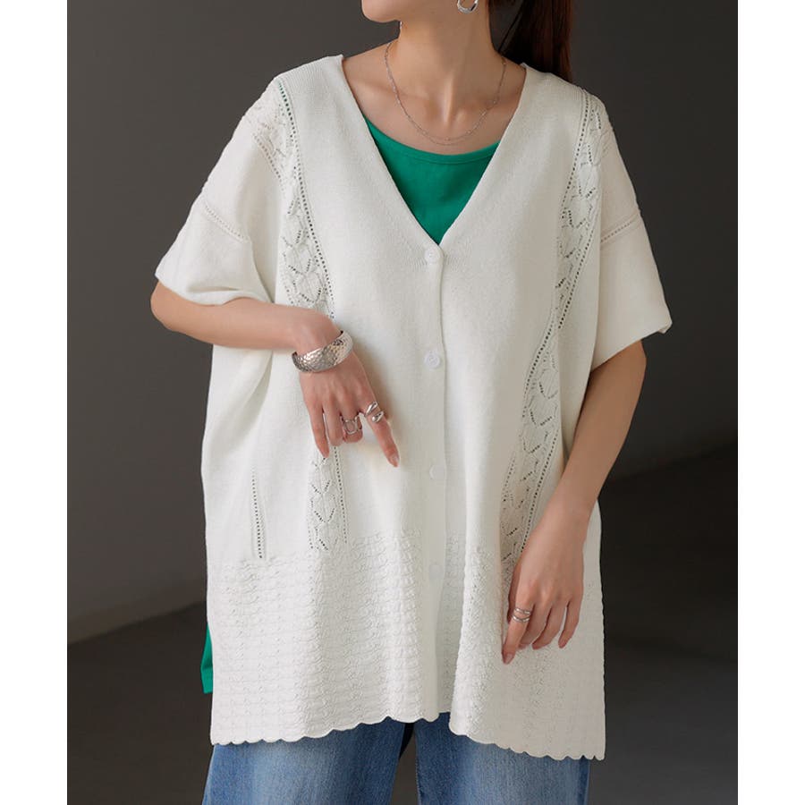 繊細なレースの透かし編みが美しいニットカーディガンです。