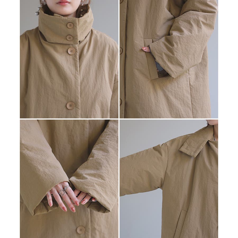 スタンドカラーとノーカラーの2WAYで着用できる中綿コートです。
