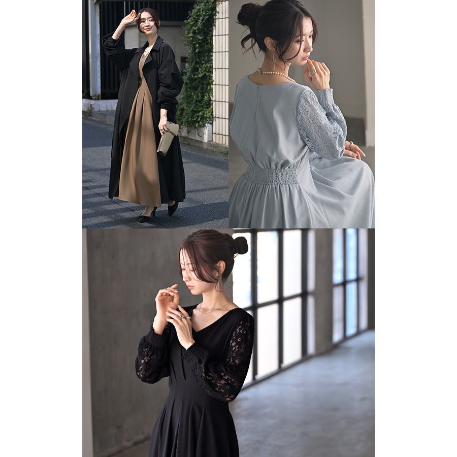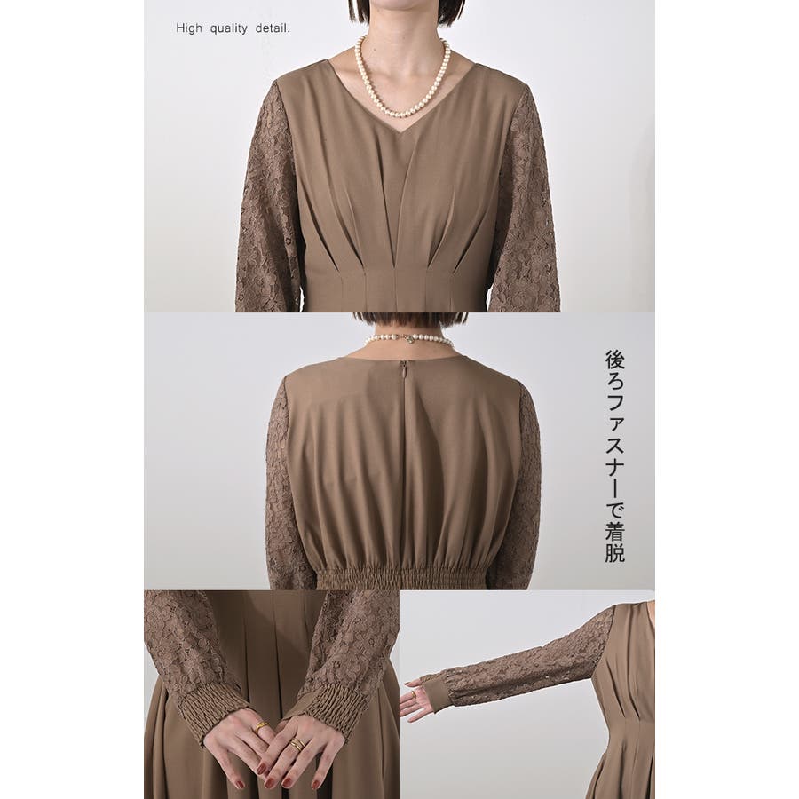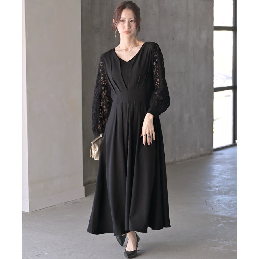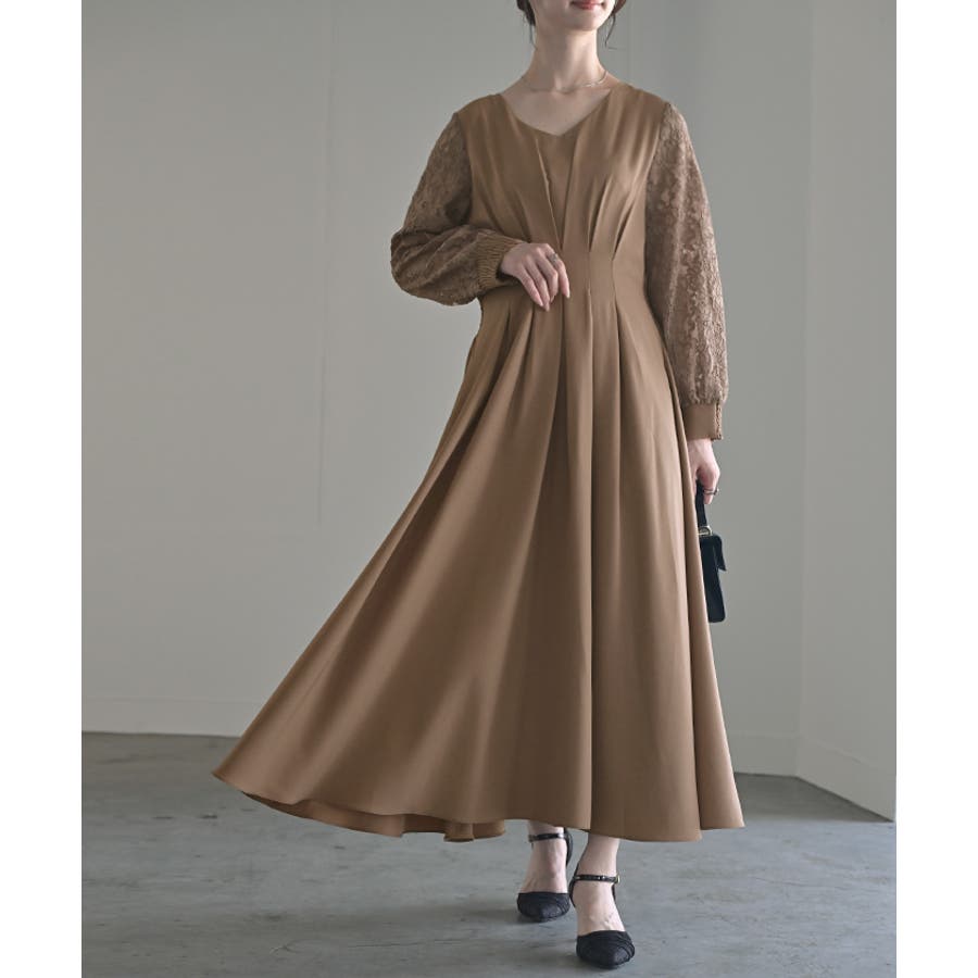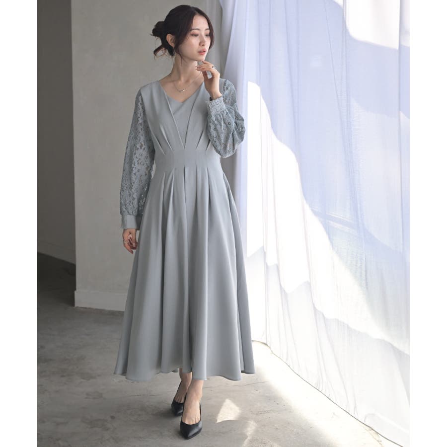袖レースの可愛らしさとVネックのスッキリ感が特徴のワンピースです。