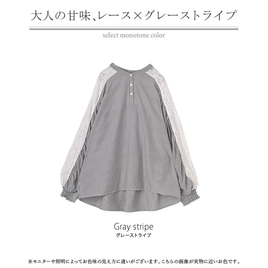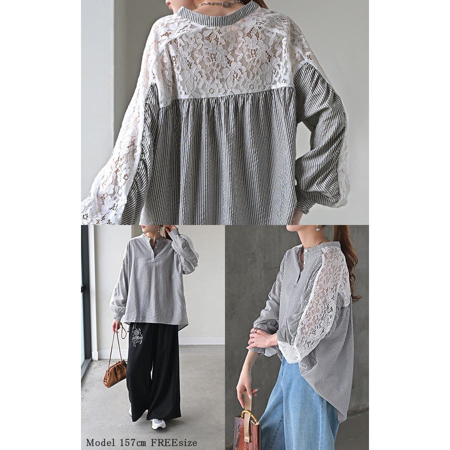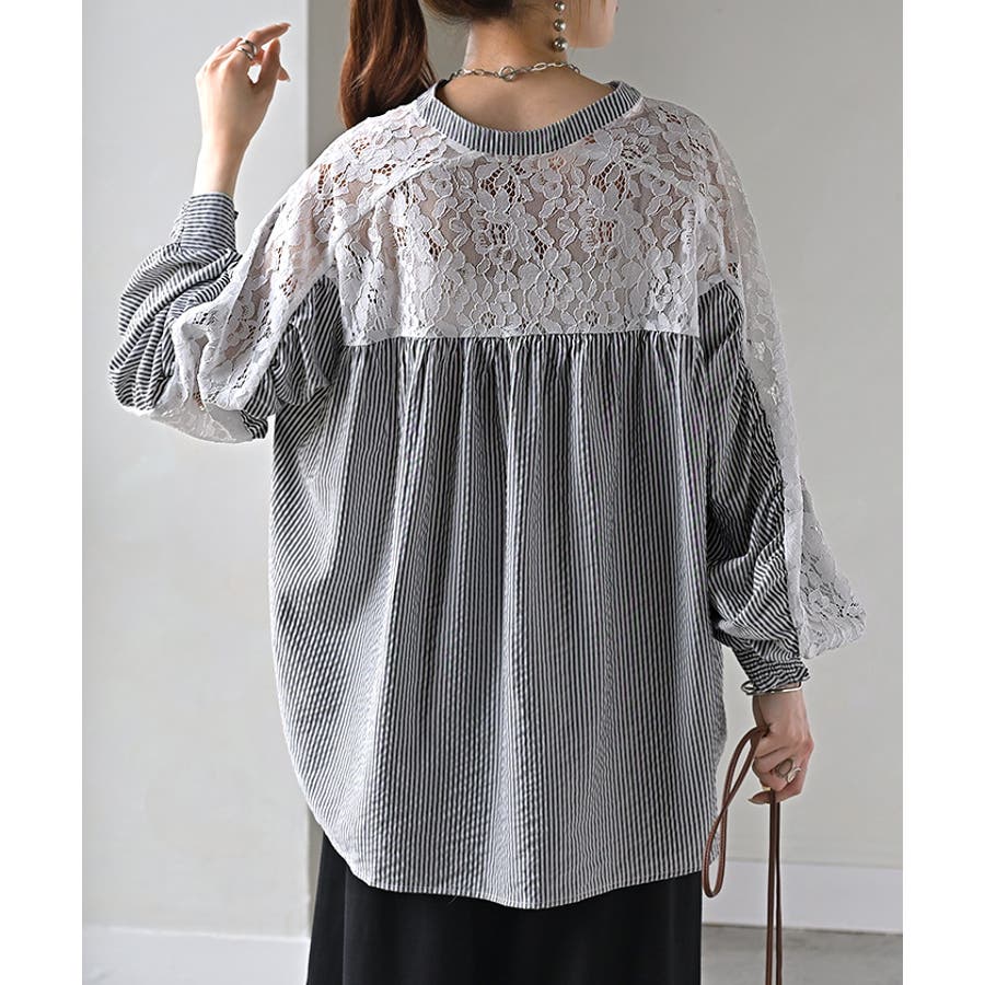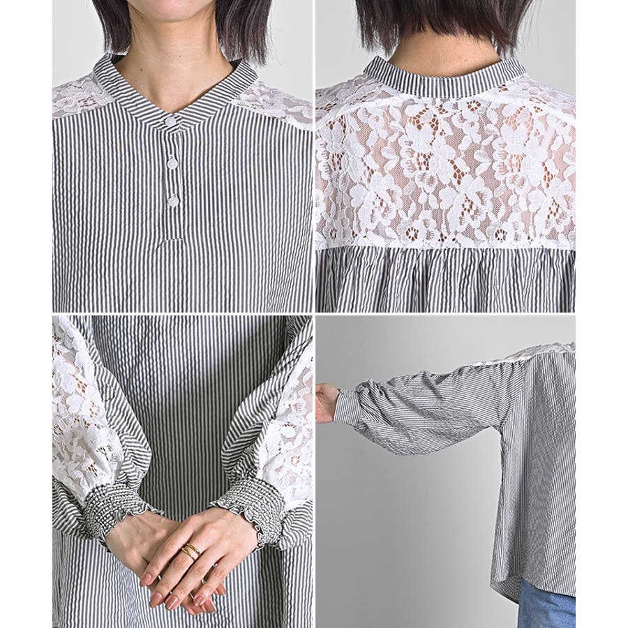 ヨークと袖部分のレース切替が華やかなストライプブラウスです。