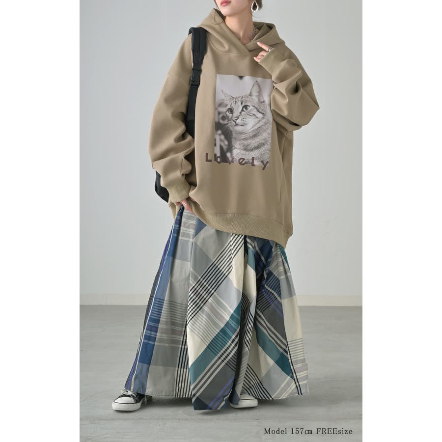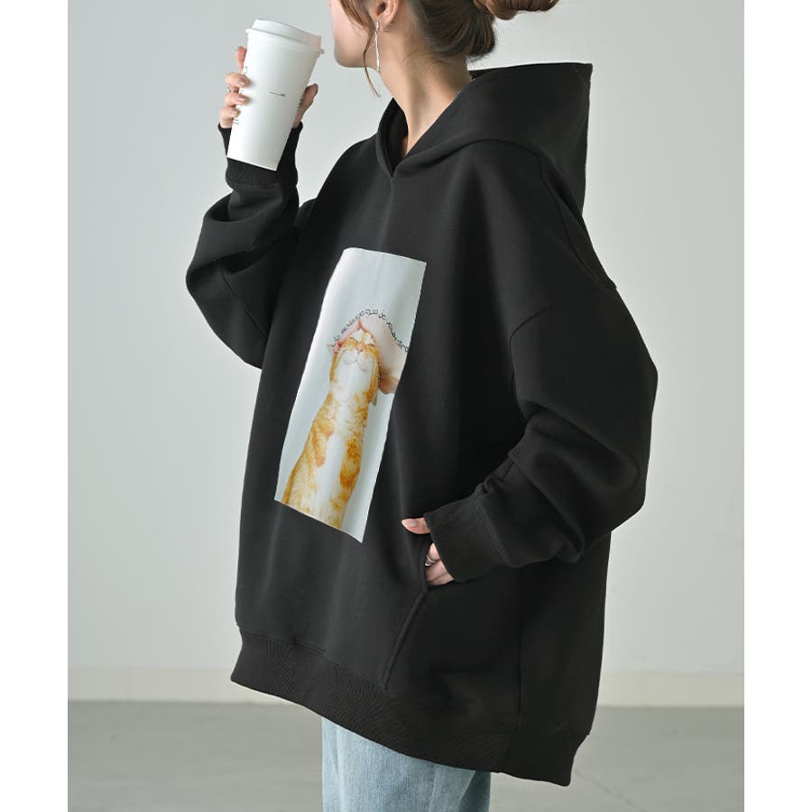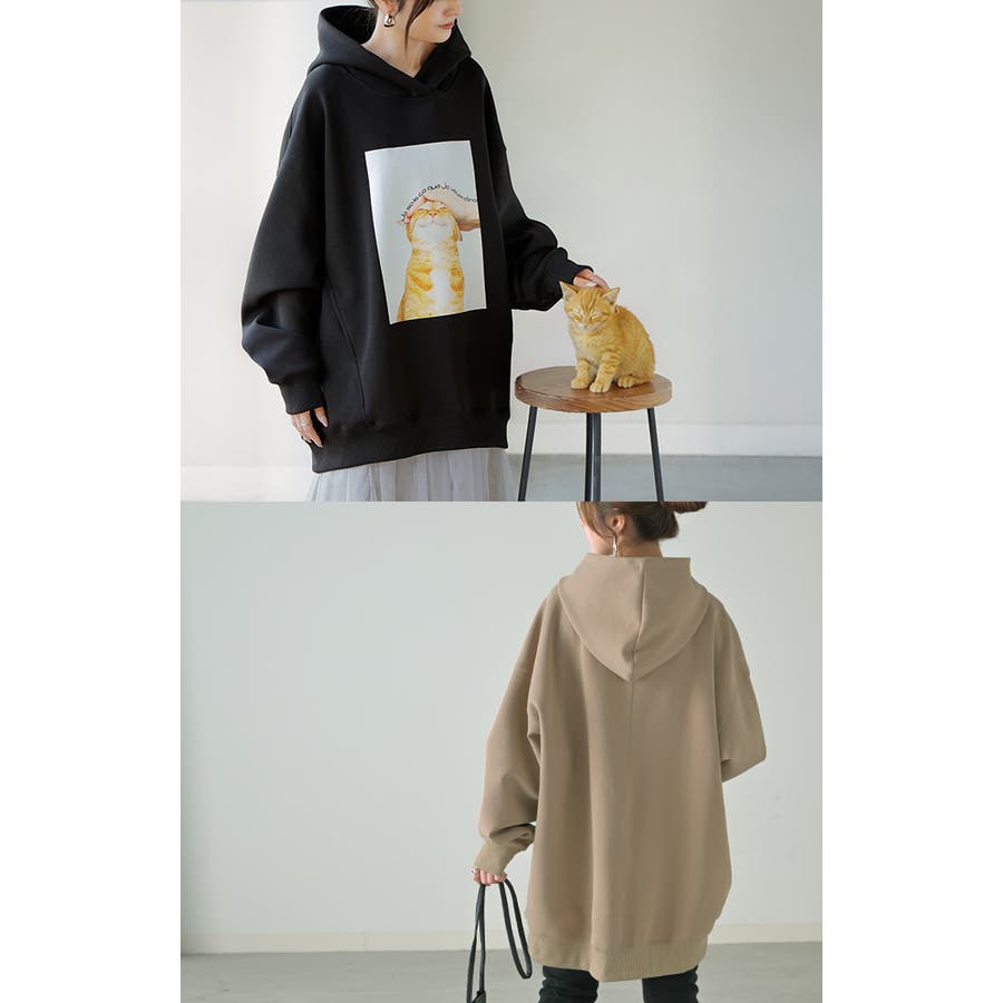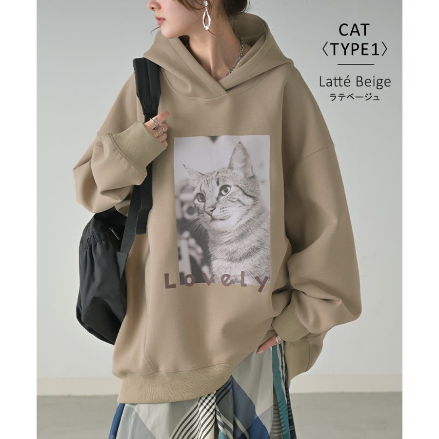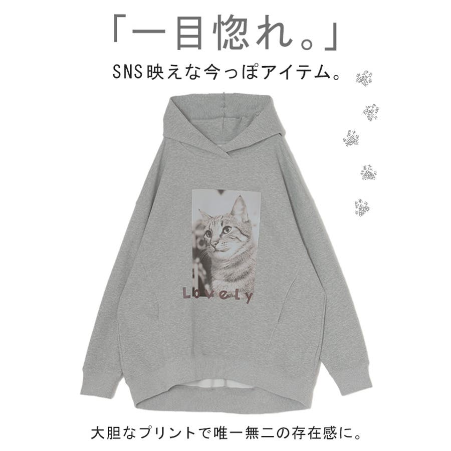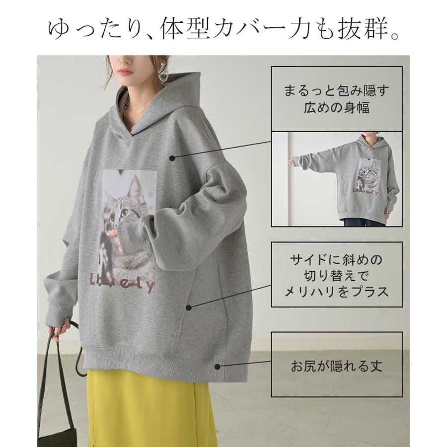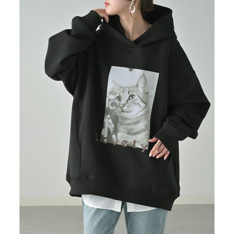 猫のプリントがアクセントの、ゆったりサイズ感のパーカーです。