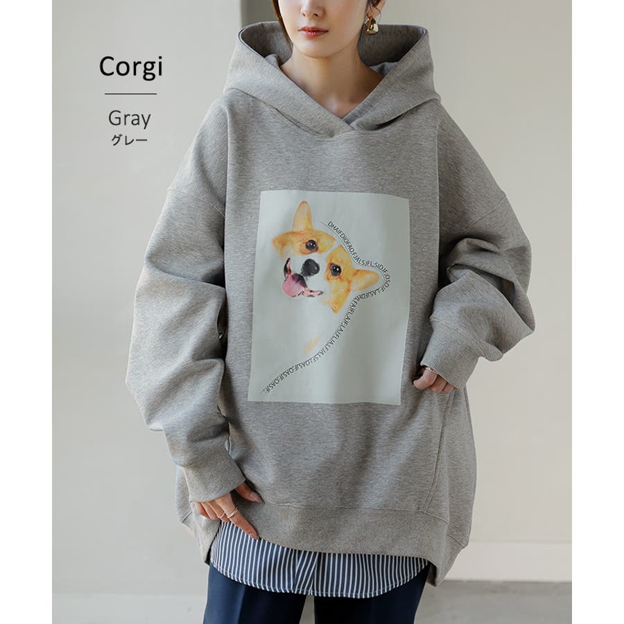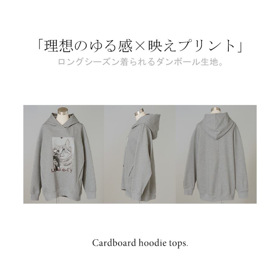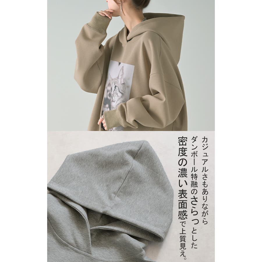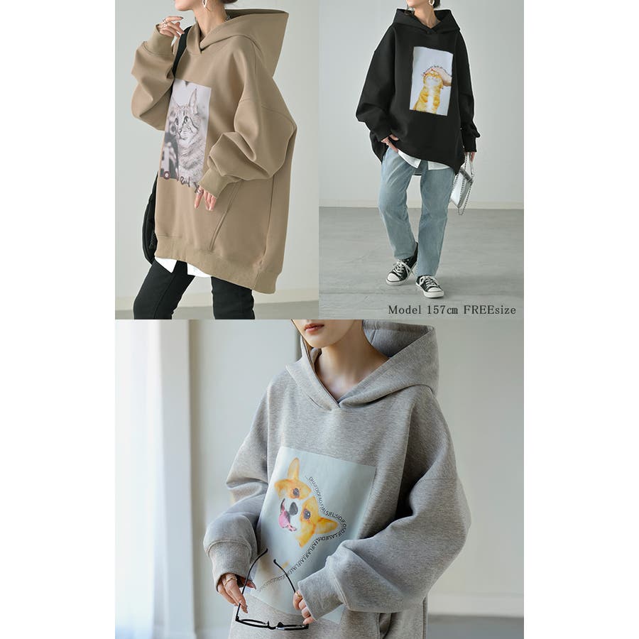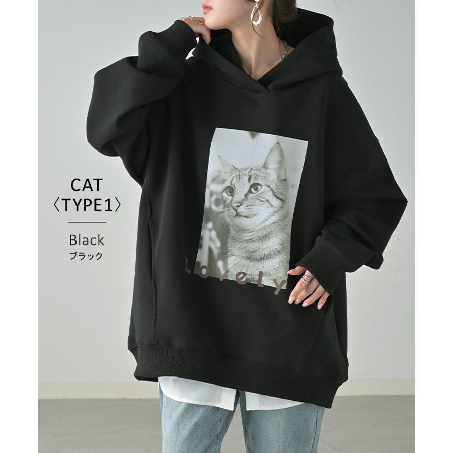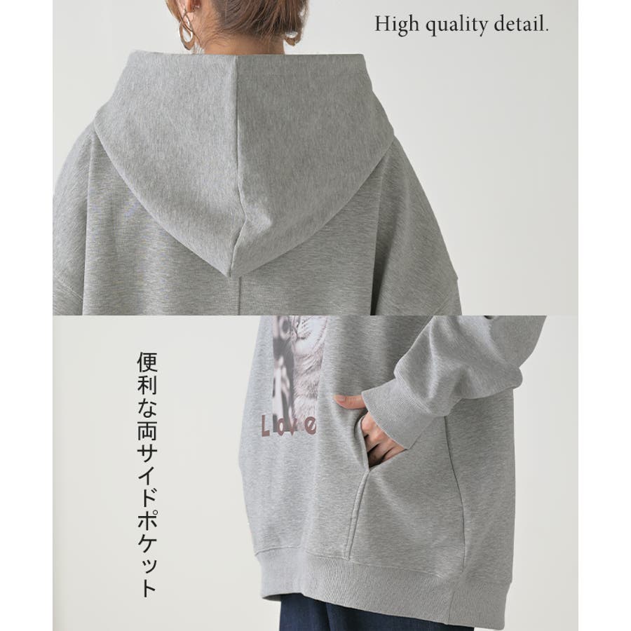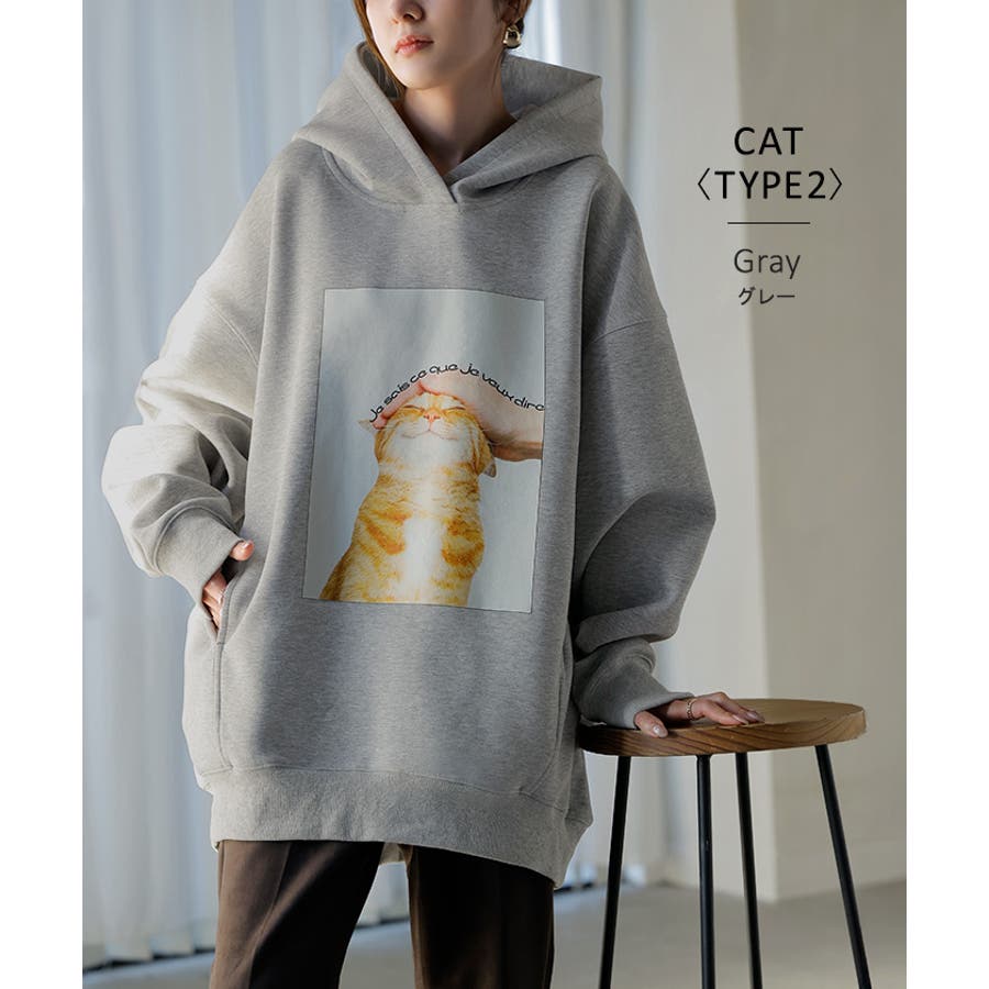 猫のプリントがアクセントの、ゆったりサイズ感のパーカーです。